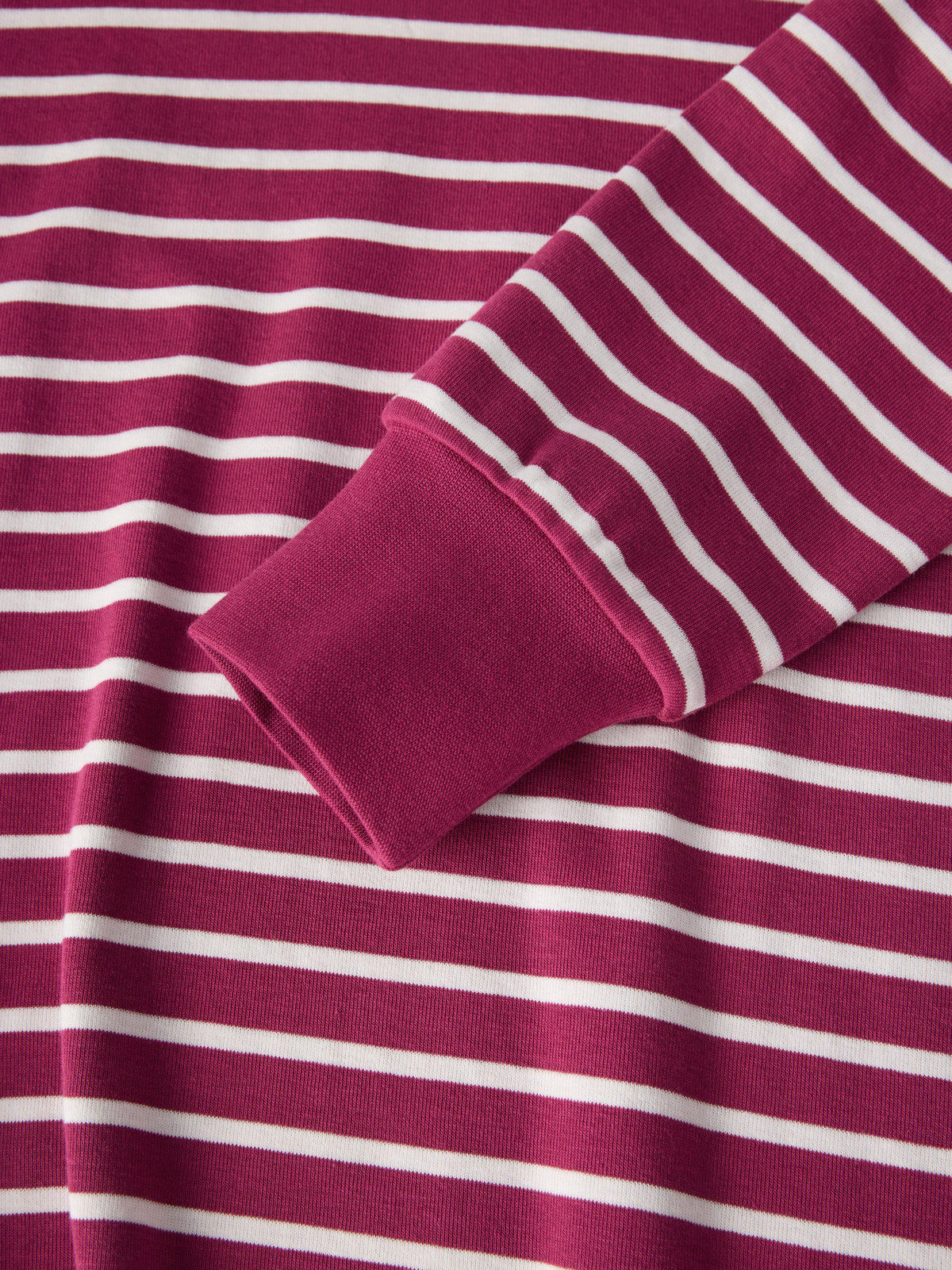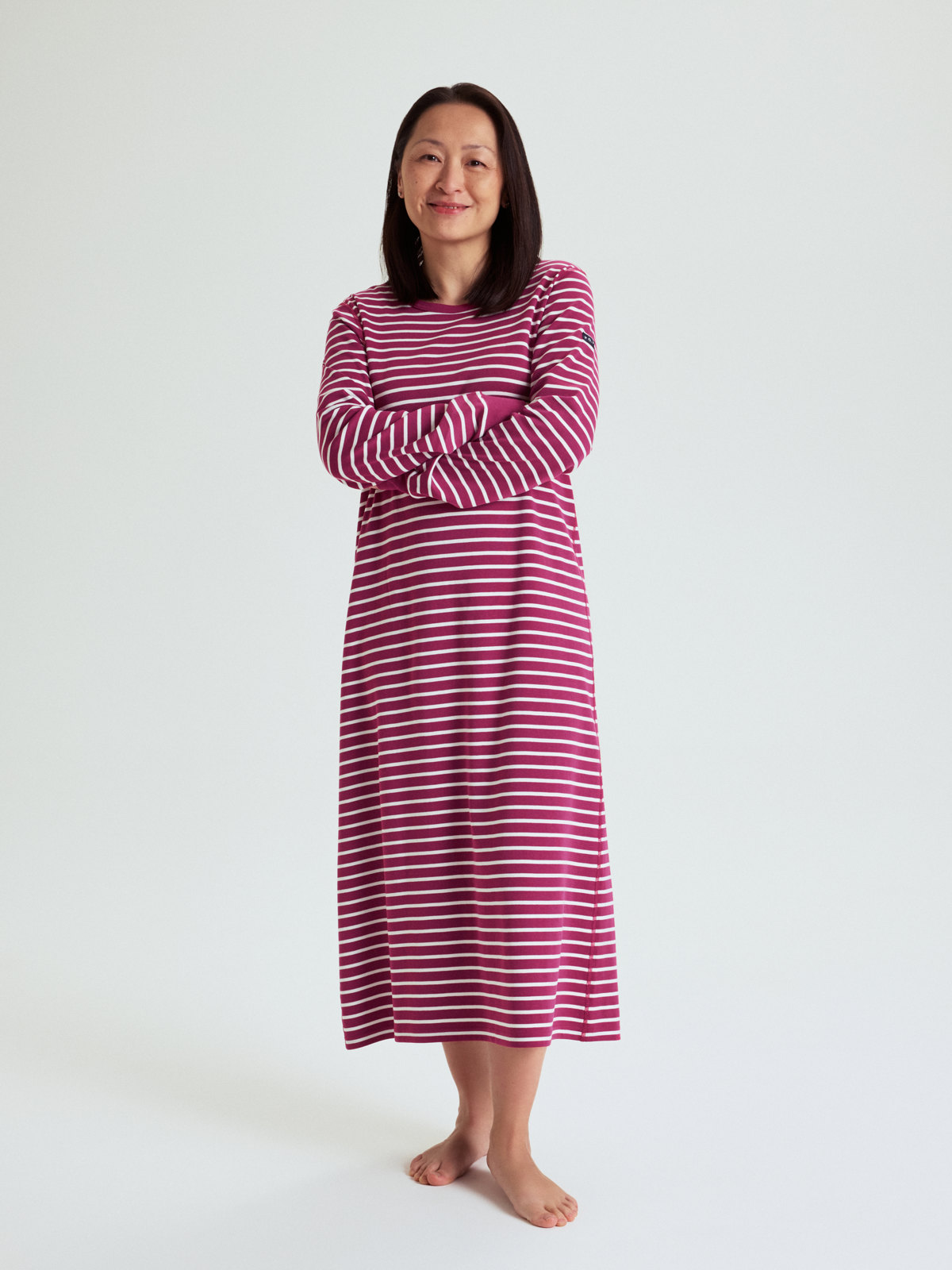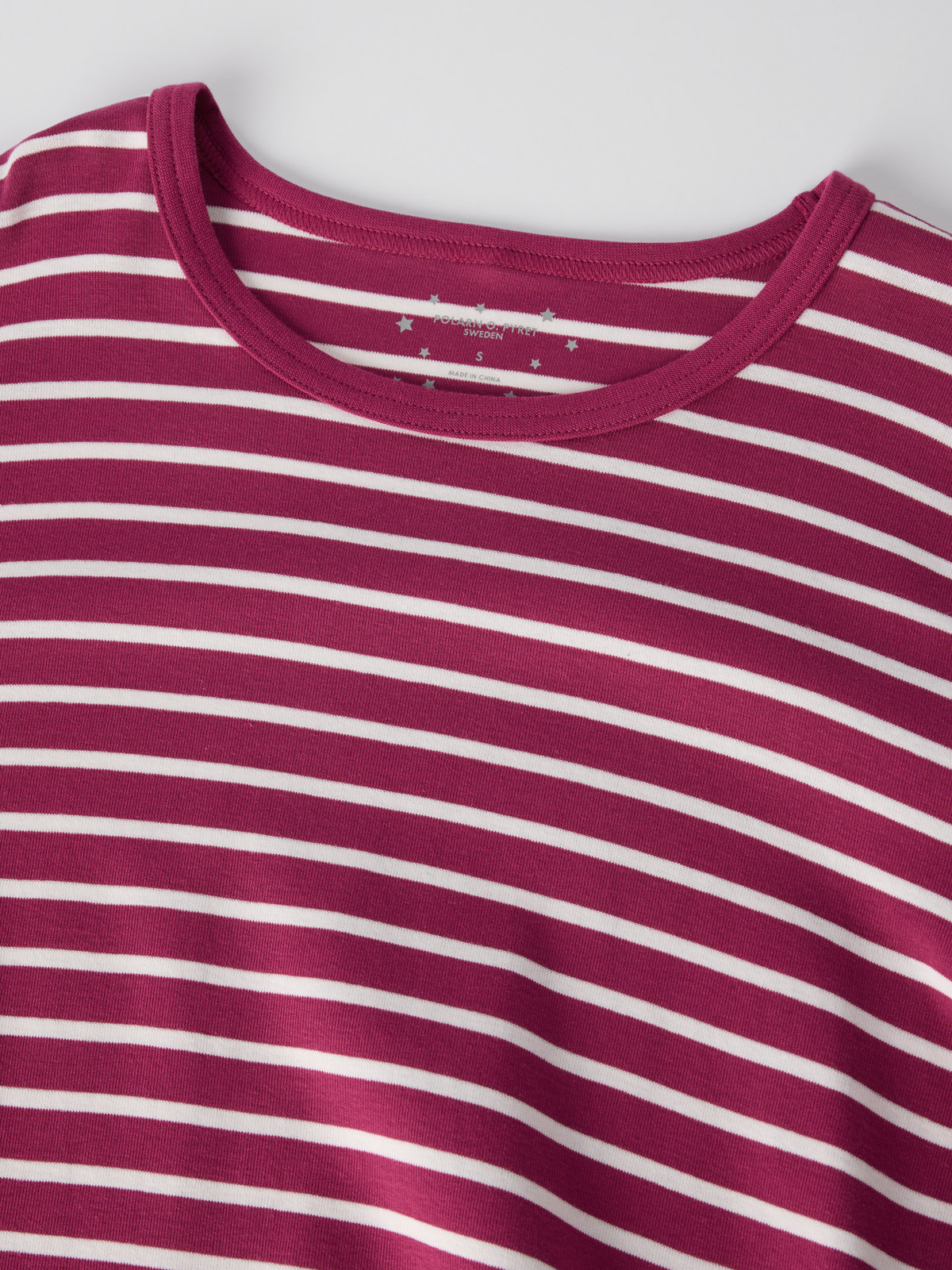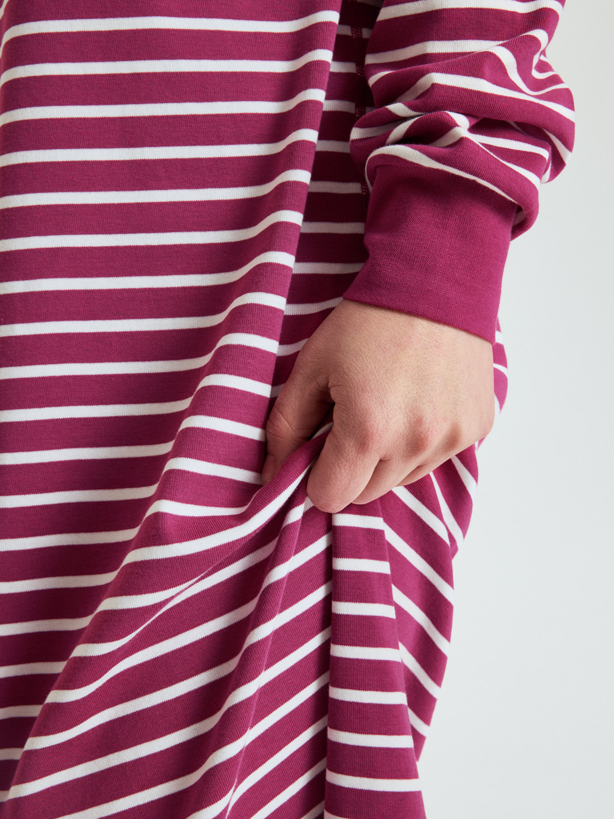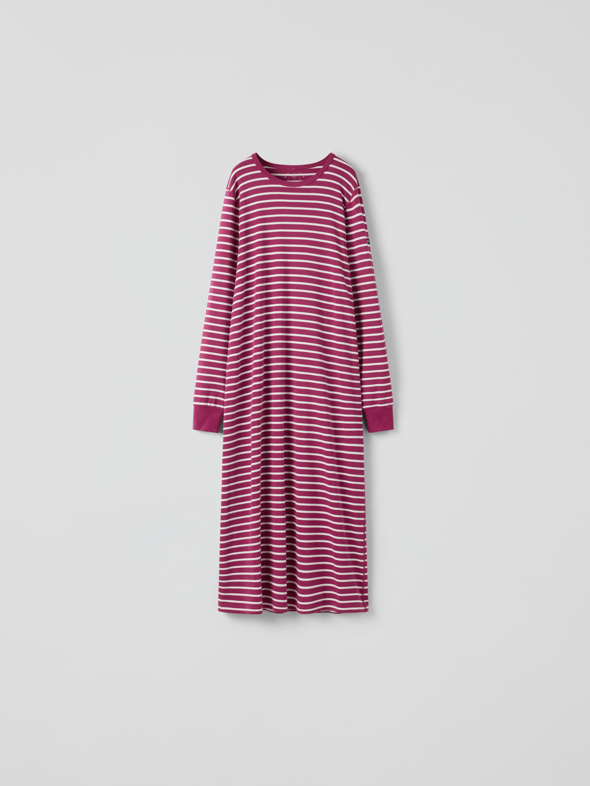 Pehmeä ja kaunis yöpaita 100 % luomupuuvillaa, aikuisten koot. Yöpaidassa on klassinen raitakuosimme. Hihansuissa pehmeät resorit.