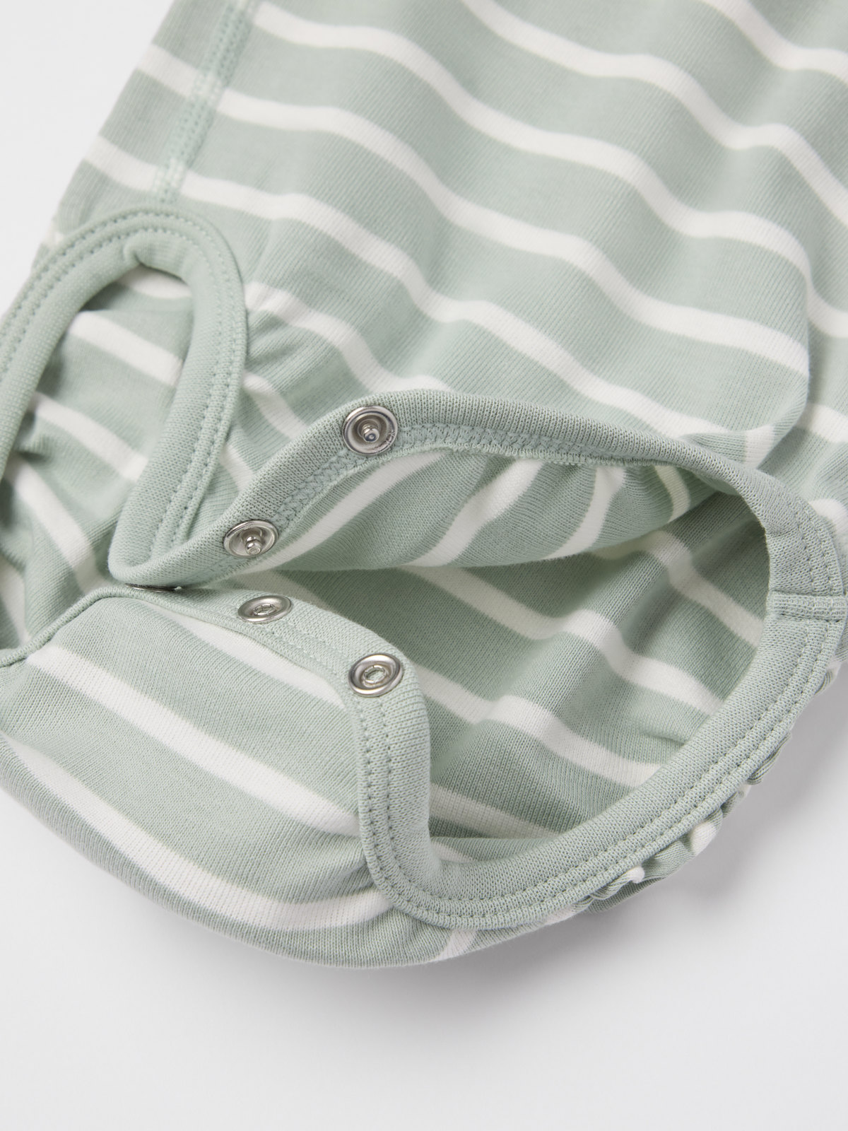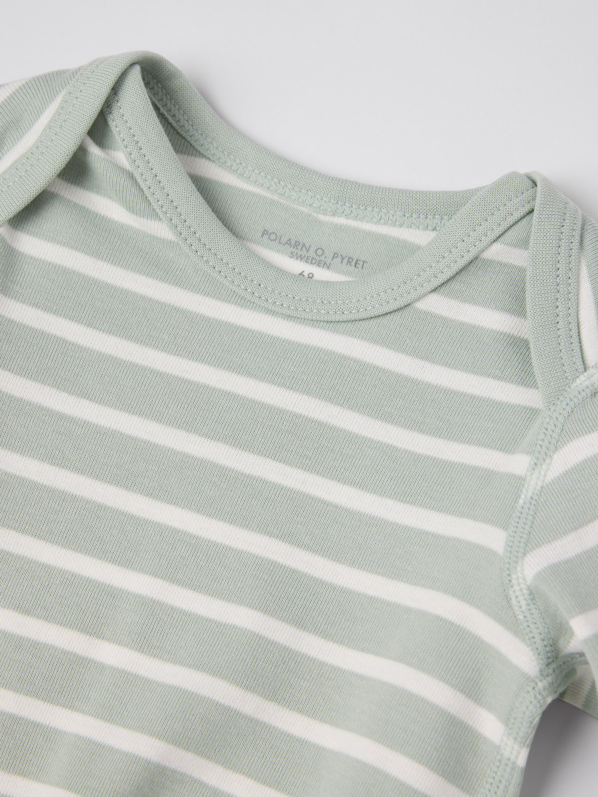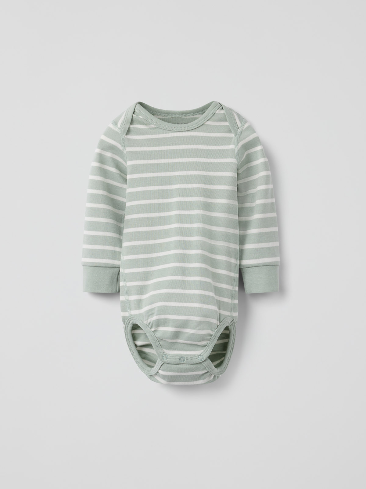 Vauvan pehmeä ja kaunis body 100 % luomupuuvillaa. Täydellinen perusvaate lapsen vaatekaappiin! Bodyssa on klassinen raitakuosimme ja kietaisumalliset olkapäät, mikä helpottaa pukemista vauvan pään yli. Pehmeä ribbiresori hihansuissa.