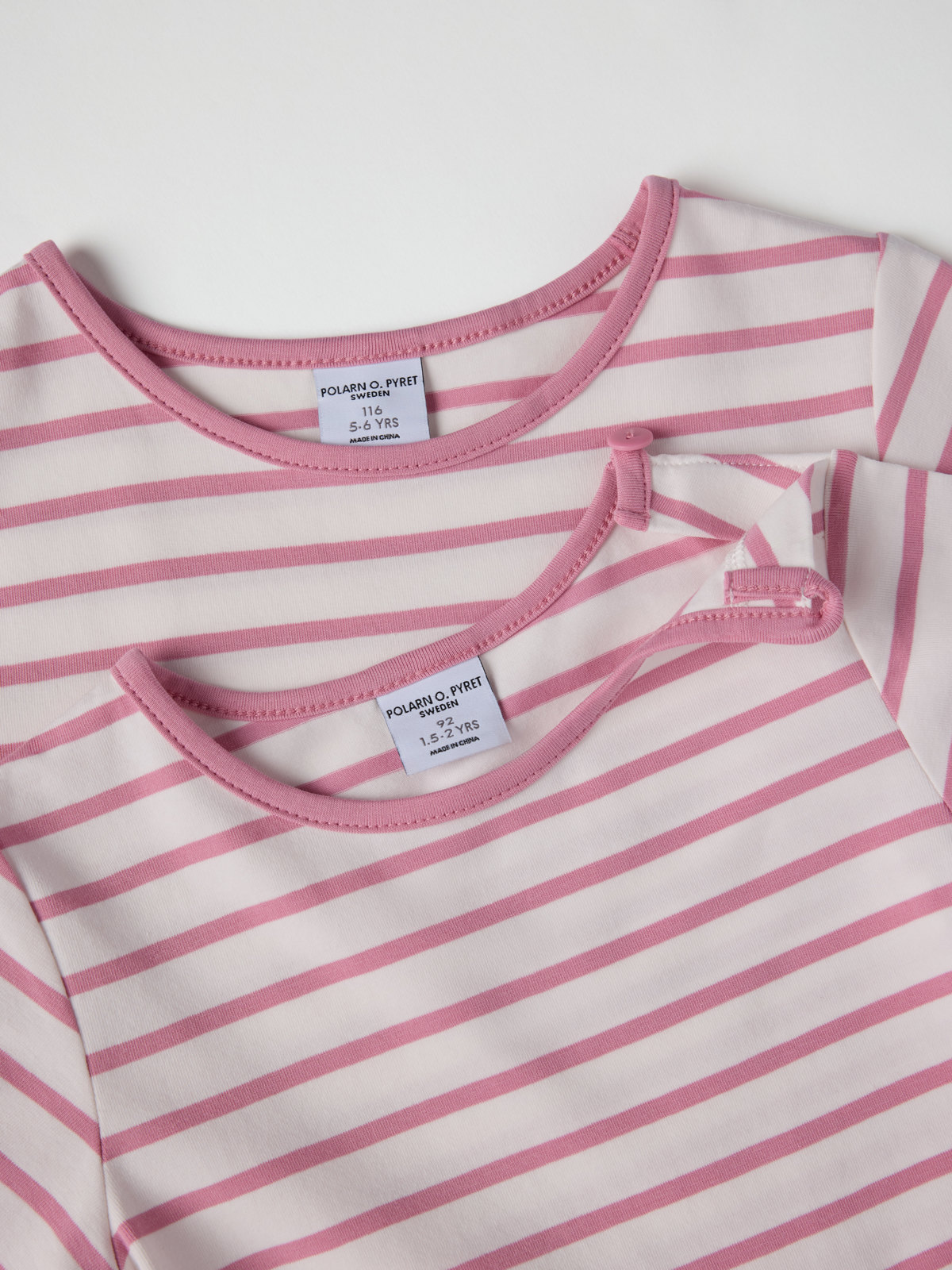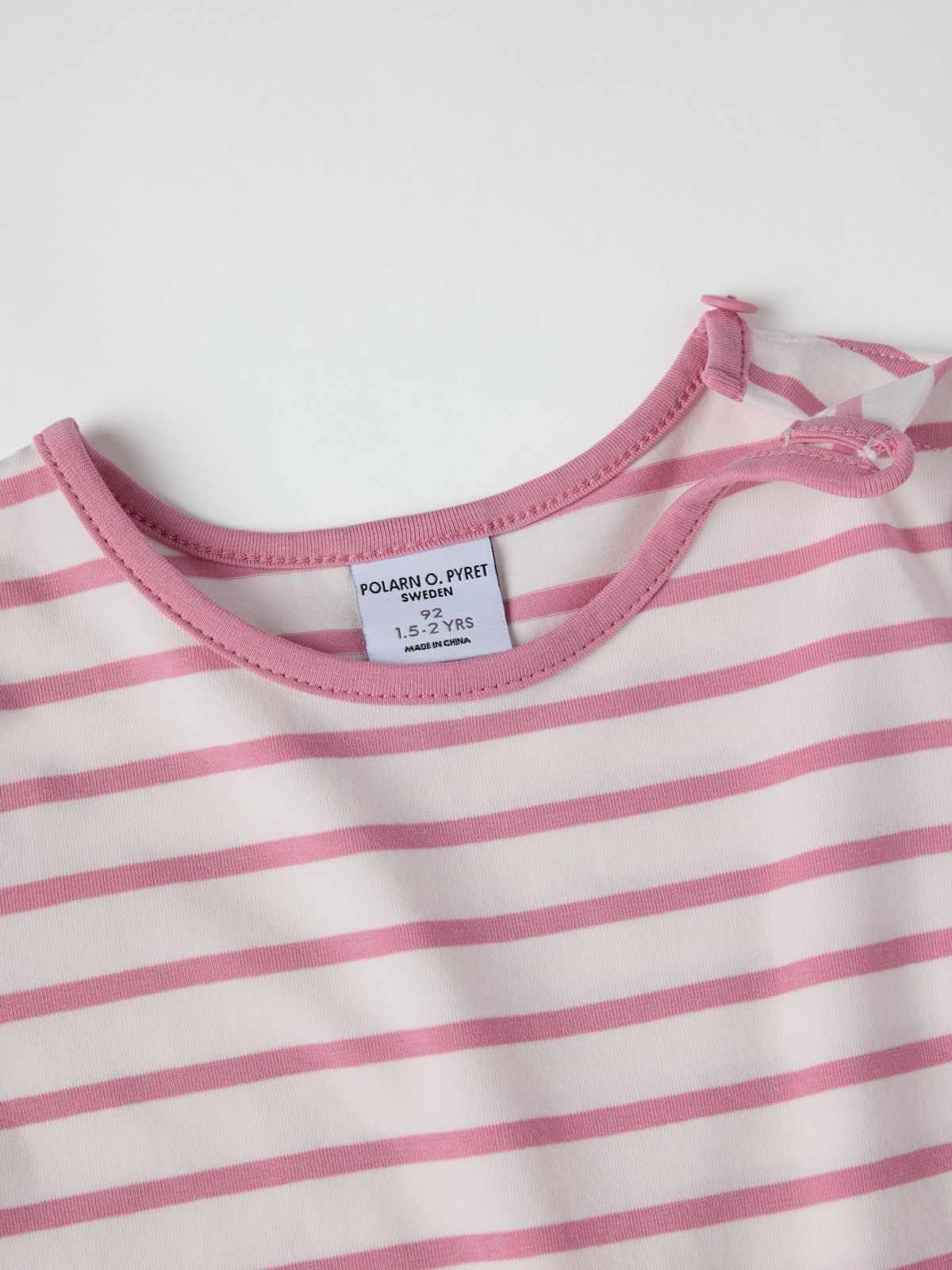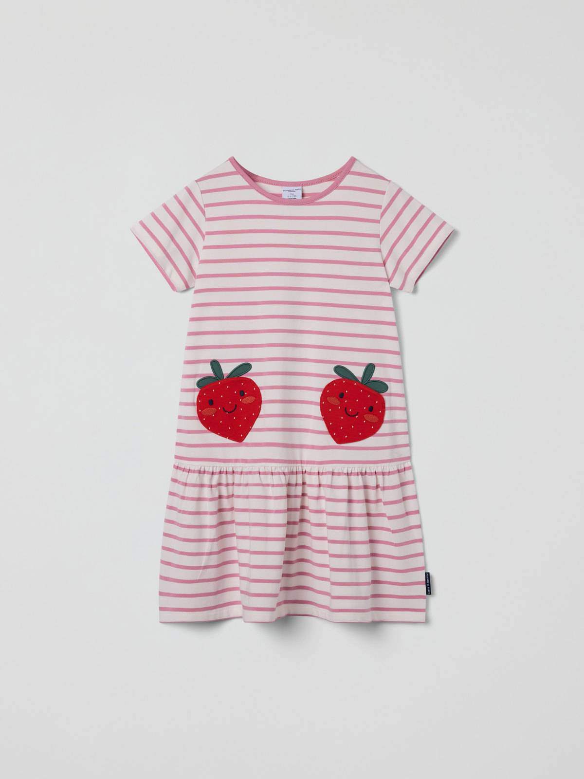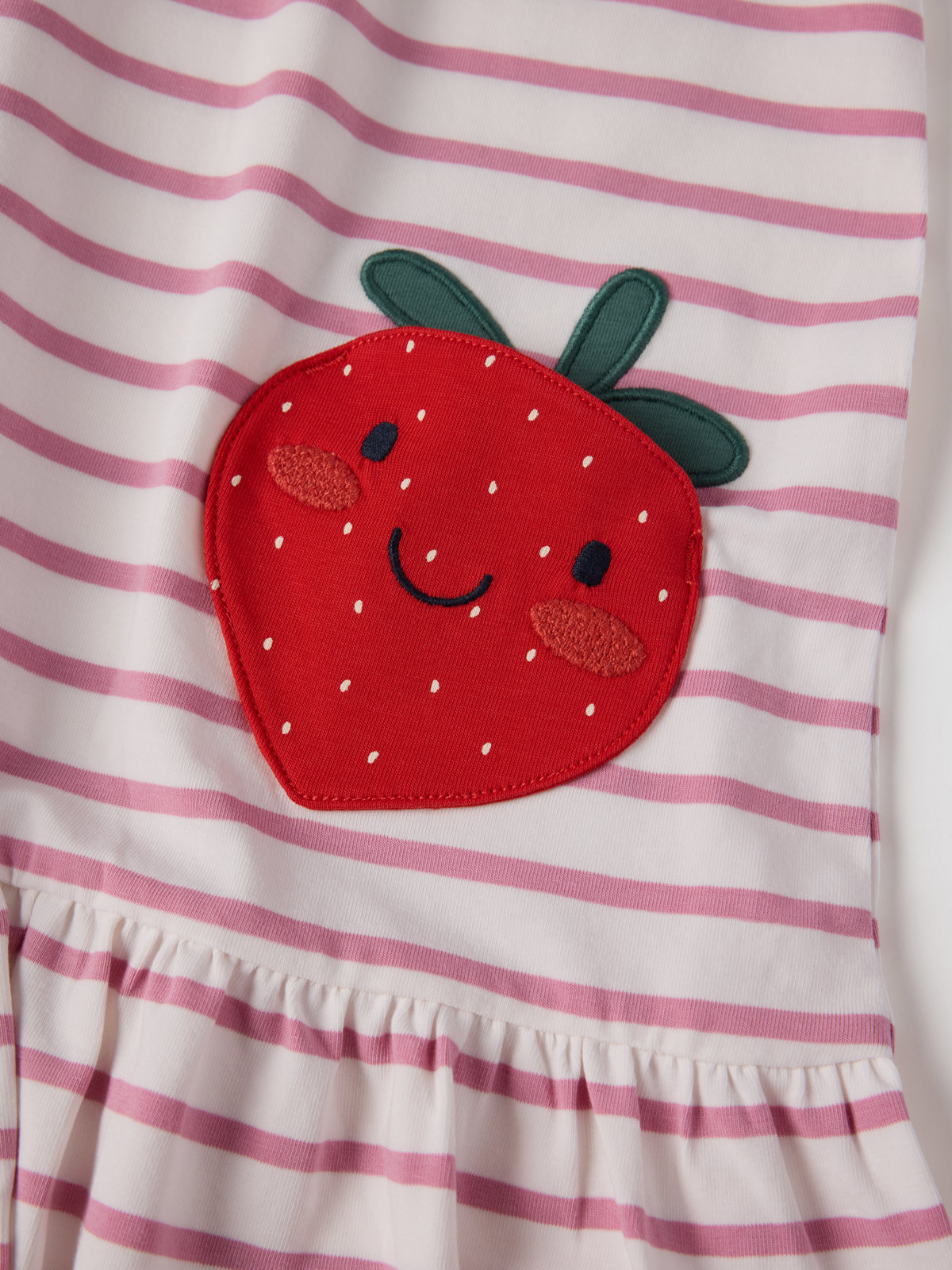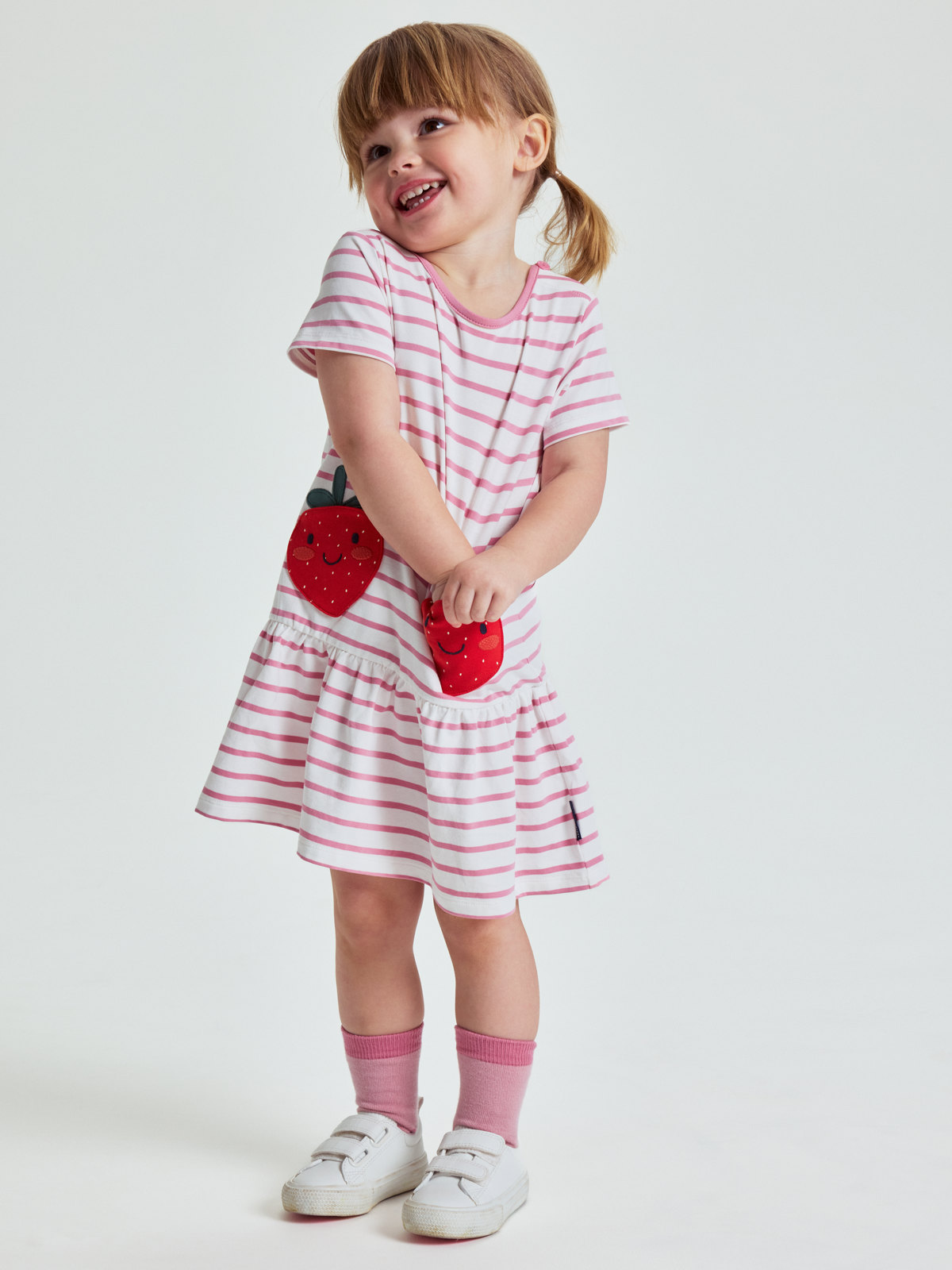 Lyhythihainen mekko pehmeää luomupuuvillaa. Hauskat mansikkataskut – kesäsuosikki arkeen ja juhlaan! Mekossa on klassinen raitakuosimme ja kaunis röyhelö helmassa.