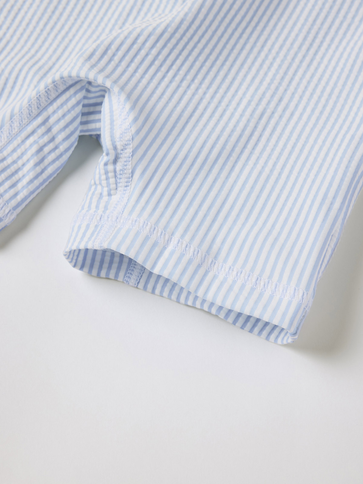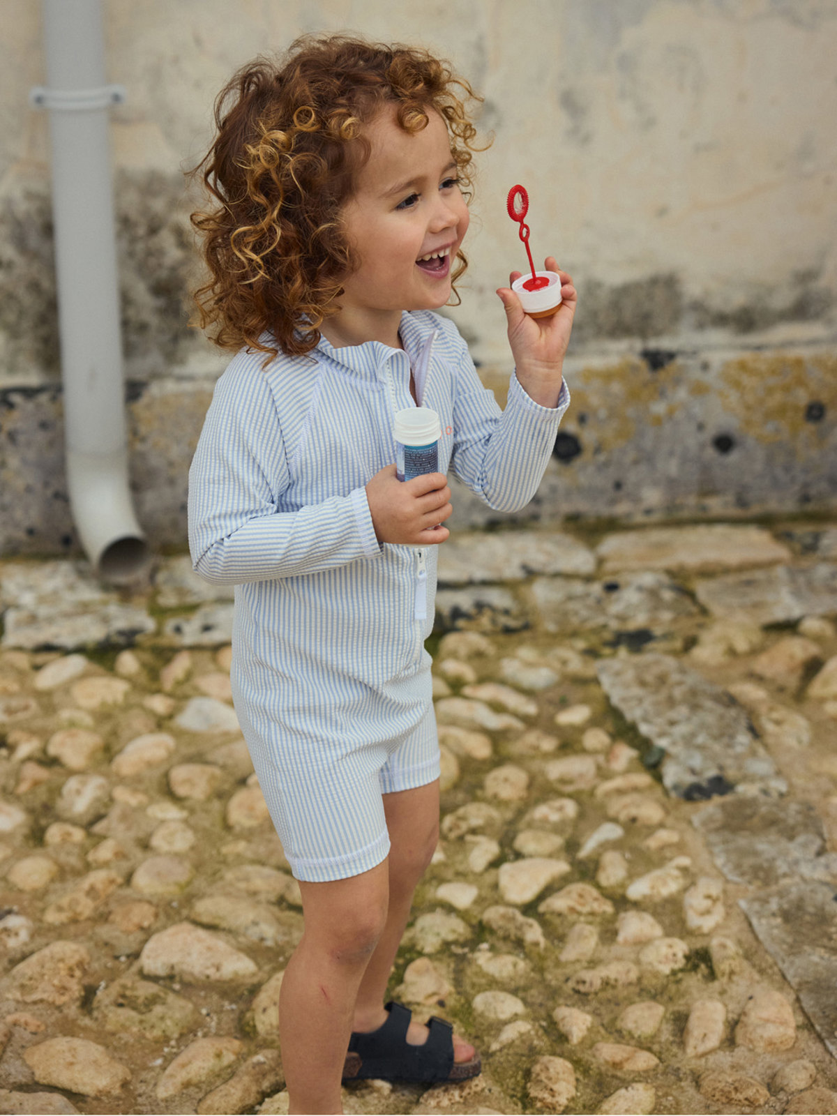 Raidallinen pitkähihainen UV-uimahaalari, jossa on UPF 50. Pehmeää ja mukavaa kierrätettyä polyesteriä. Erittäin pehmeät saumat, jotka eivät hankaa. Etuvetoketju helpottaa pukemista ja siinä on ylhäällä suoja, jotta vetoketju ei hankaa leukaa ja poskia.