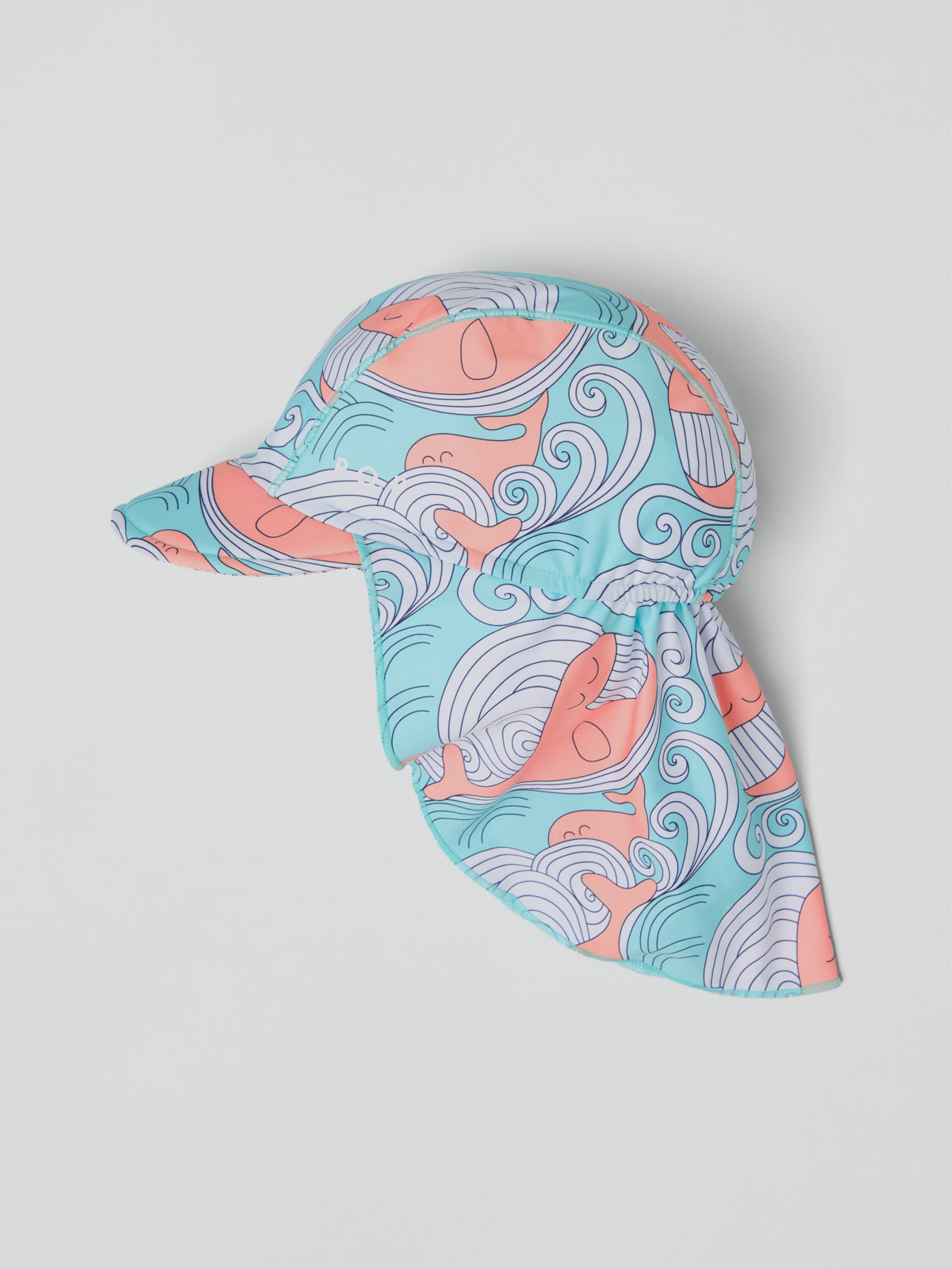 Pehmeä ja joustava UV-lippalakki (UPF 50) on kuvioitu kokonaan valaskuviolla – täydellinen rannalle tai uima-altaalle! Nopeasti kuivuva lippalakki on valmistettu 100 % kierrätetystä polyesteristä. Edessä oleva lippa ja takana oleva leveä kangas suojaavat sekä kasvoja että niskaa auringolta.
