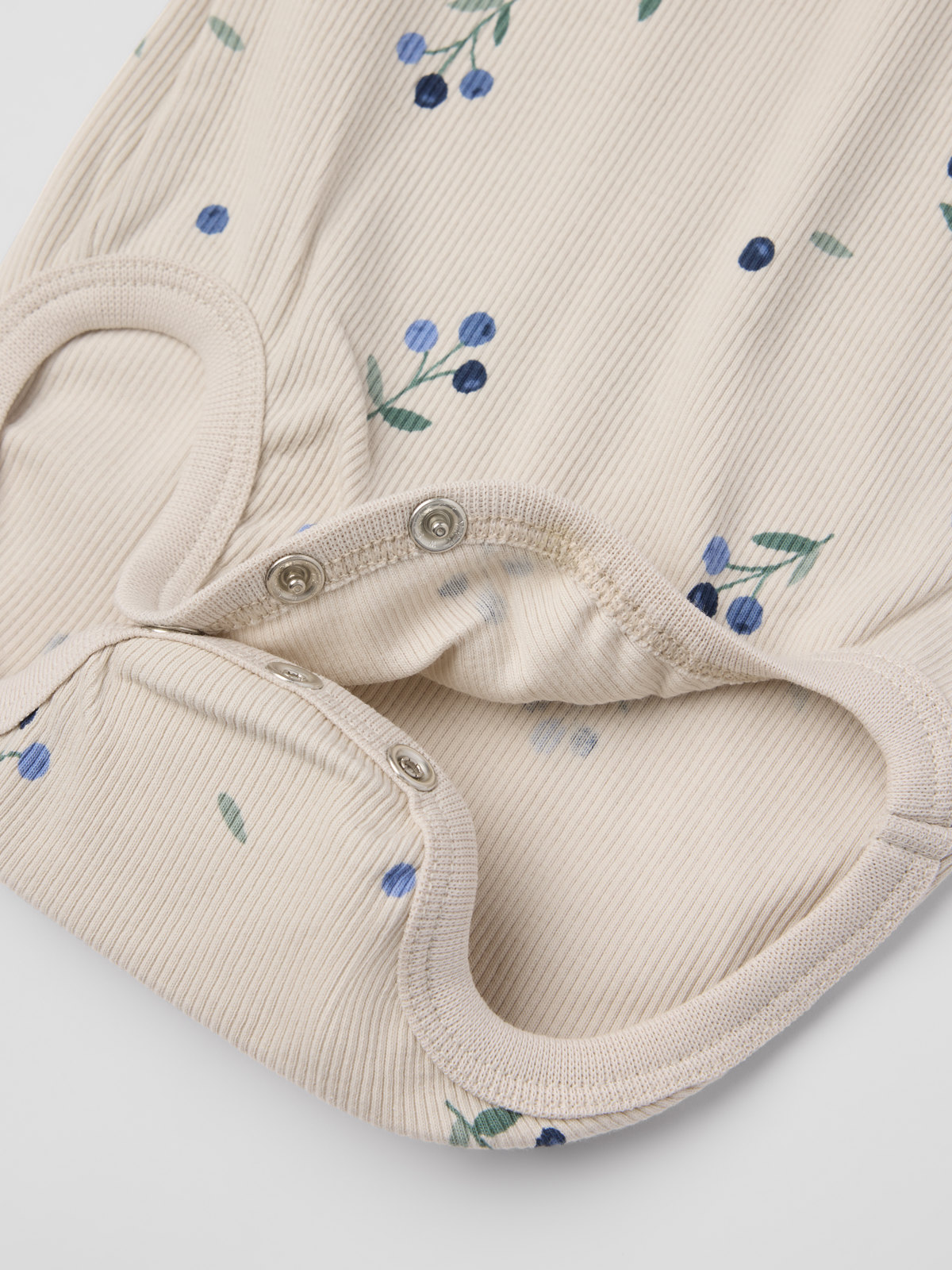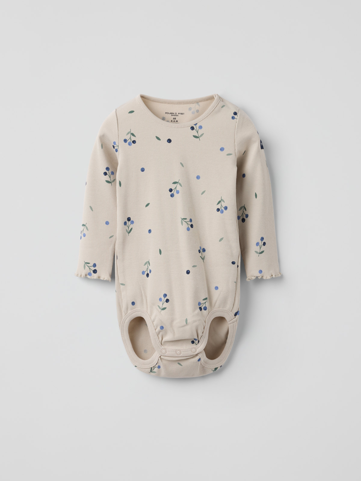 Vauvan ribbibody ohutta luomupuuvillaa. Pehmeä röyhelö pääntiessä. Bodyssa on erittäin pehmeät ja litteät saumat, jotka eivät hankaa herkkää ihoa vasten. Nepparit toisella olkapäällä ja haarassa helpottavat pukemista.