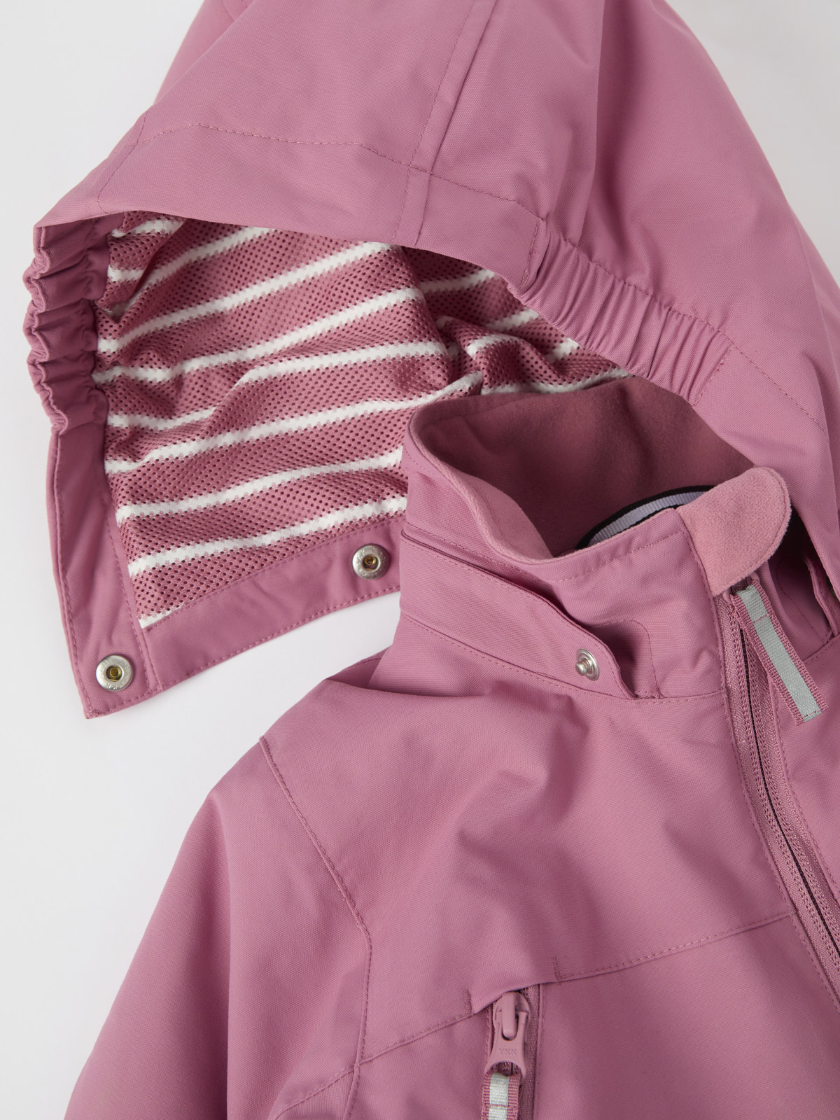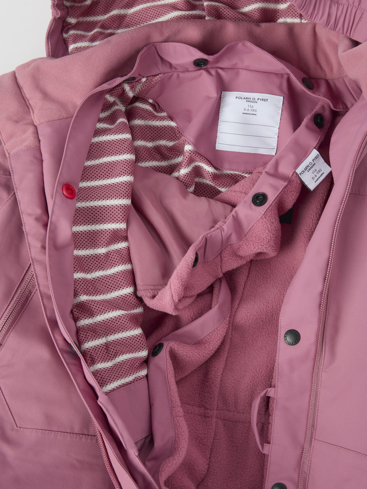 • Sisäpuolen neppareista ensimmäisenä kiinnitettävä on kontrastivärinen, joten fleecevuori on helppo kiinnittää haalariin