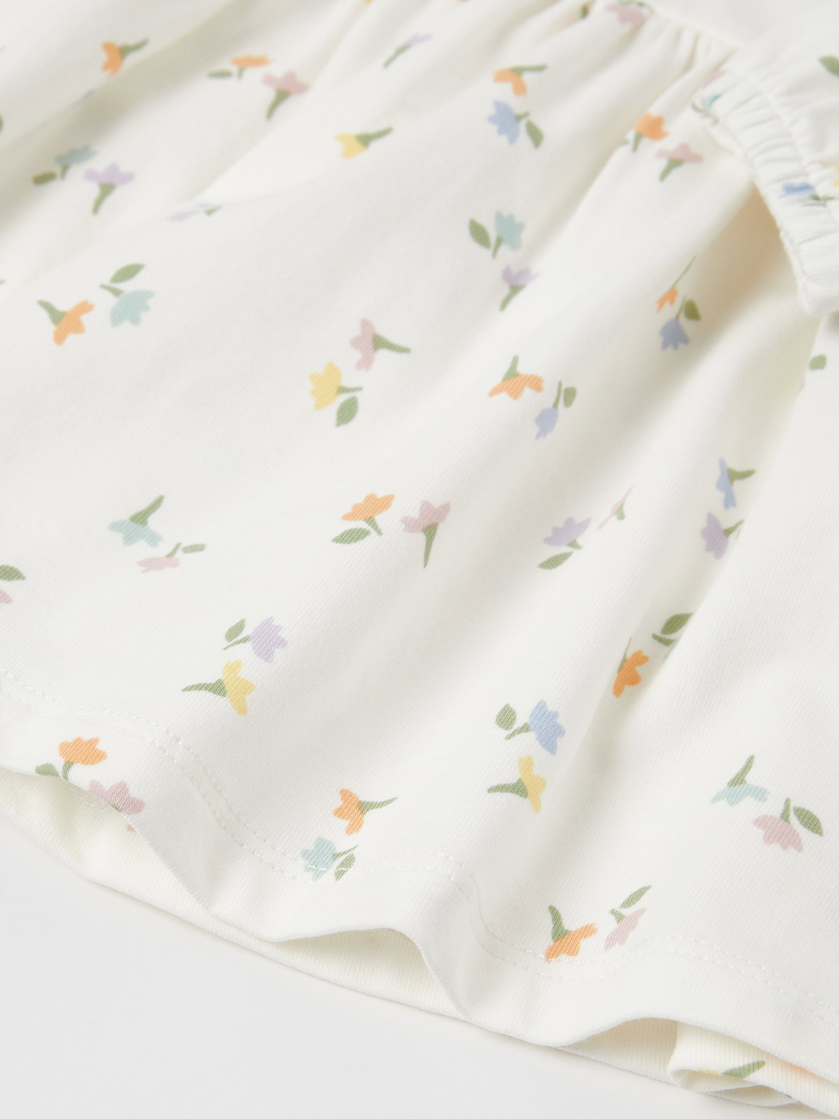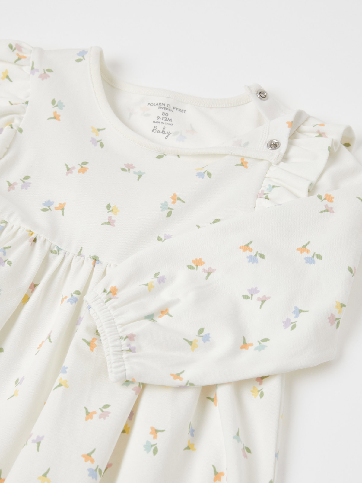 Suloinen mekko pehmeää luomupuuvillatrikoota. Mekko on kuvioitu kokonaan kukkakuviolla. Olkapäillä röyhelöt.