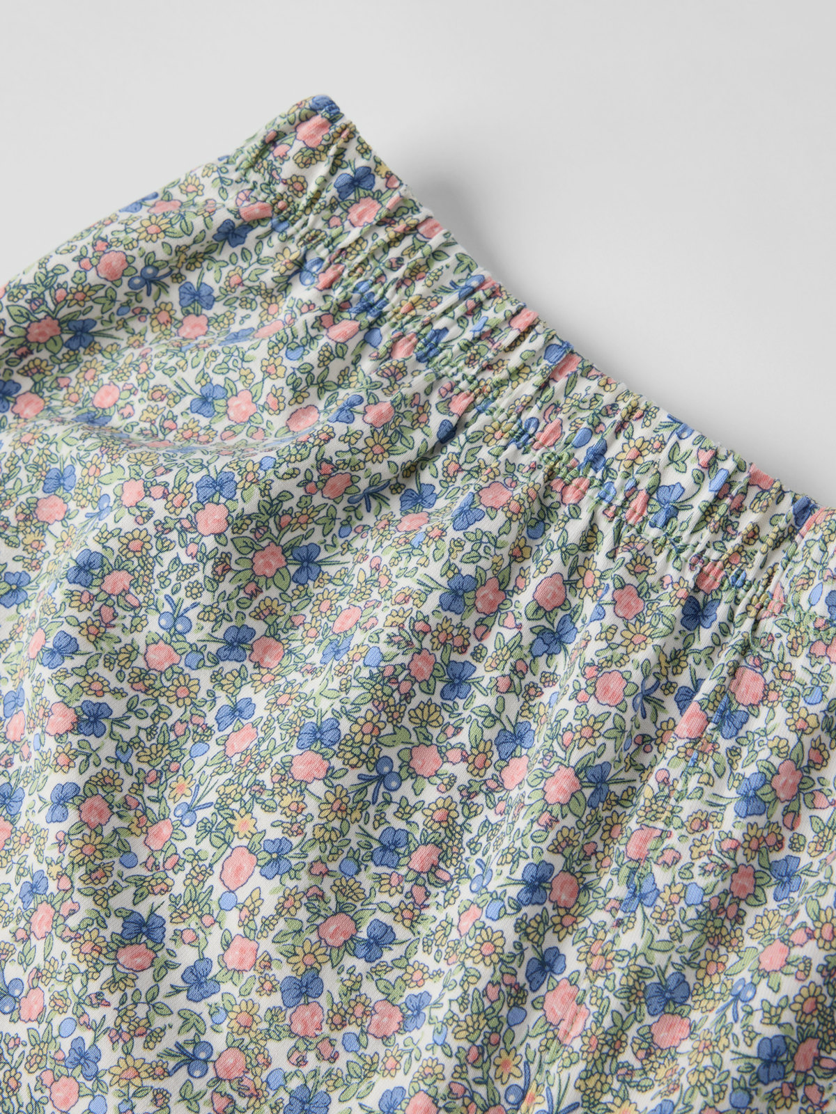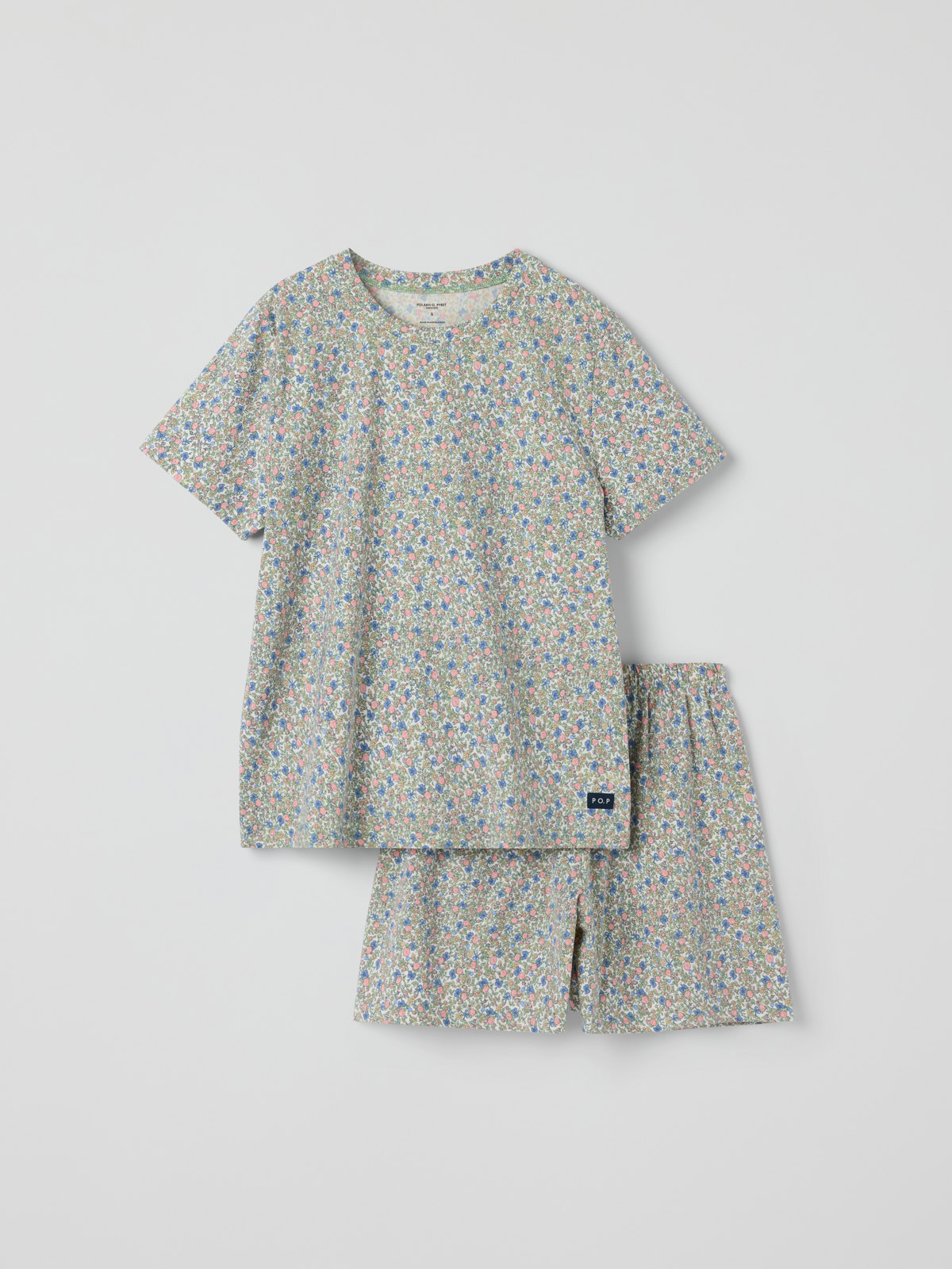 Lyhythihainen kukallinen pyjama aikuisille, valmistettu pehmeästä luomupuuvillasta ja ommeltu erityisen pehmeillä, litteillä saumoilla – täydellinen valinta kesäöihin!