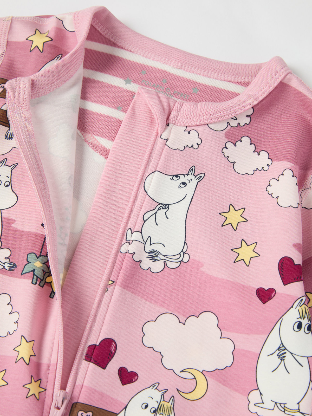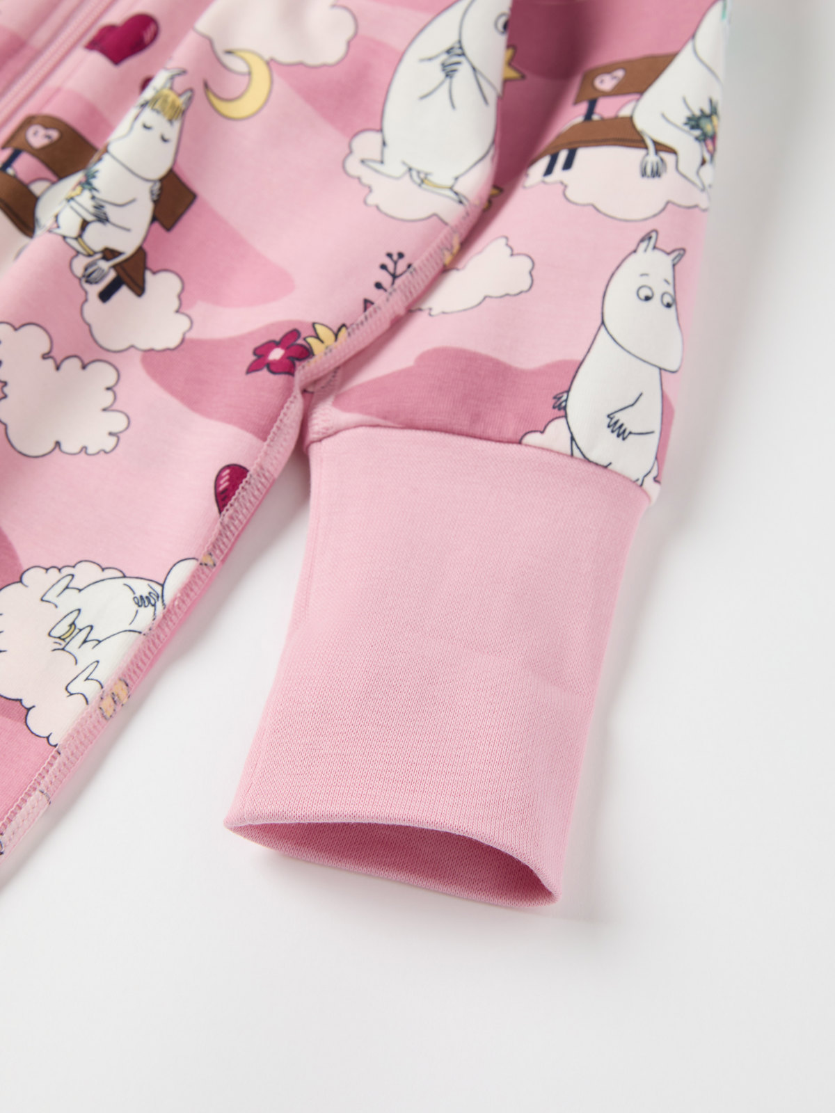 Haalari on kuvioitu kokonaan Tove Janssonin muumitarinoiden hahmoilla.