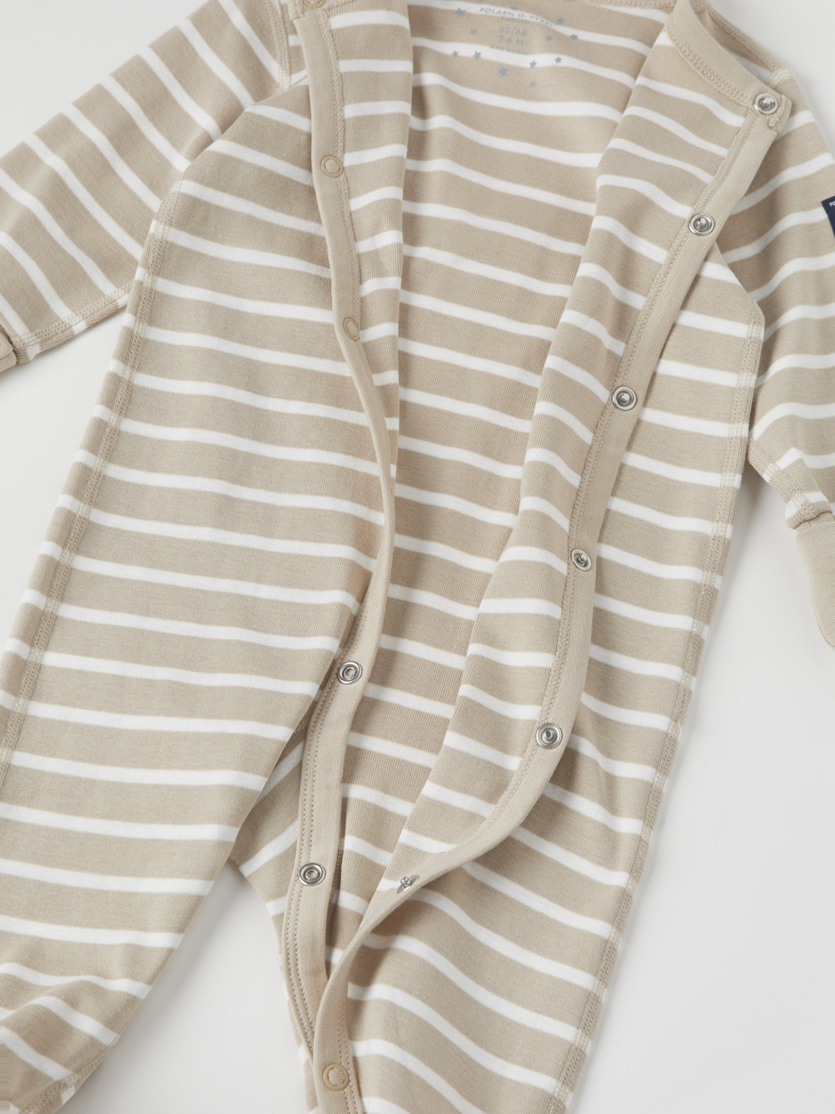 Raidallinen pyjamahaalari pehmeää luomupuuvillaa perheen pienimmille. Hihan- ja lahkeensuissa erityispitkät resorit, jotka voi taittaa alas lapsen kasvaessa. Napit pääntieltä lahkeensuulle helpottavat pukemista. Kokovaihtoehdoissa 50–68 on ommellut jalkaosat, joiden pehmeä resori nilkan ympärillä varmistaa mukavan istuvuuden.