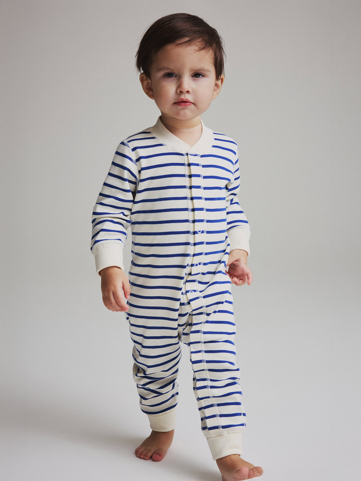 Klassinen raidallinen haalari pehmeää luomupuuvillaa – täydellinen sekä yöpukuna että oloasuna! Haalari on ommeltu erityisen pehmeillä, litteillä saumoilla, jotka ovat hellävaraisia herkälle iholle. Hihojen ja lahkeiden resorit ovat erityisen pitkät ja niitä voi pidentää lapsen kasvaessa. Pitkä nappilista kaulasta lahkeeseen helpottaa pukemista.