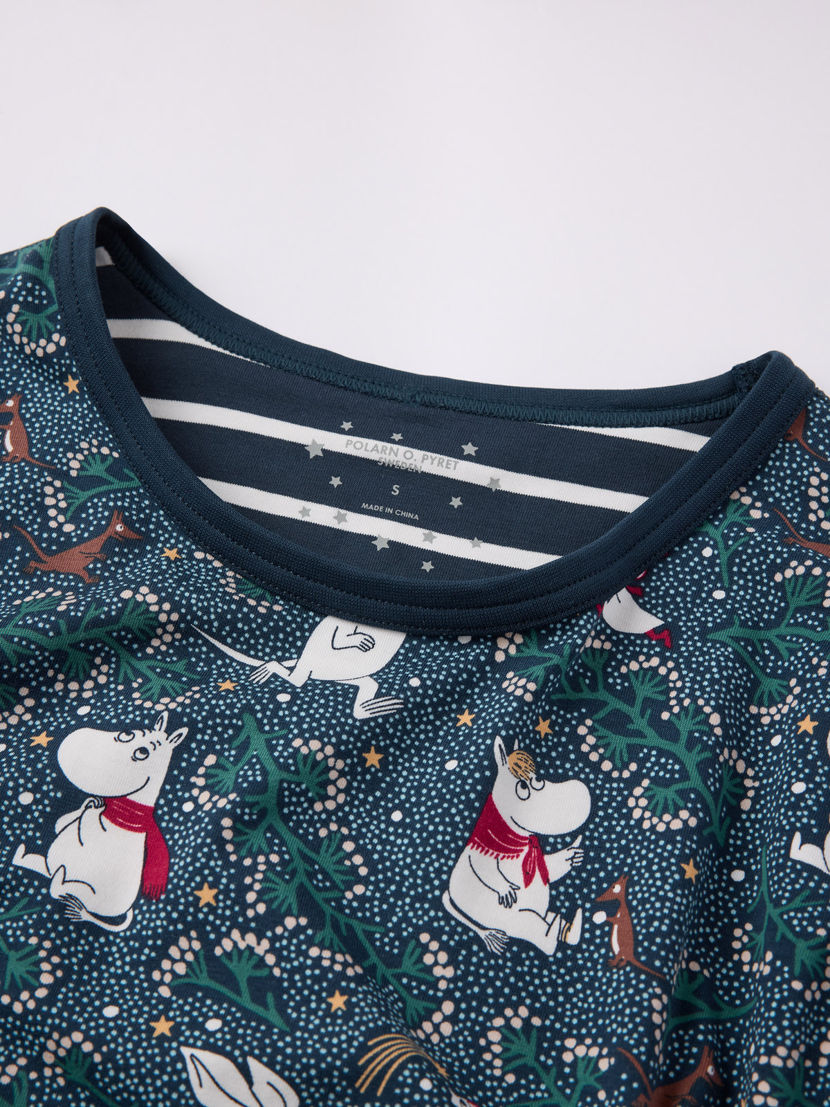 Pehmeä ja kaunis yöpaita, luomupuuvillaa, aikuisille – osa rakastettua design-yhteistyötämme Muumien 80-vuotisjuhlan kunniaksi vuonna 2025. Yöpaita on kuvioitu kokonaan Tove Janssonin muumitarinoiden hahmoilla.