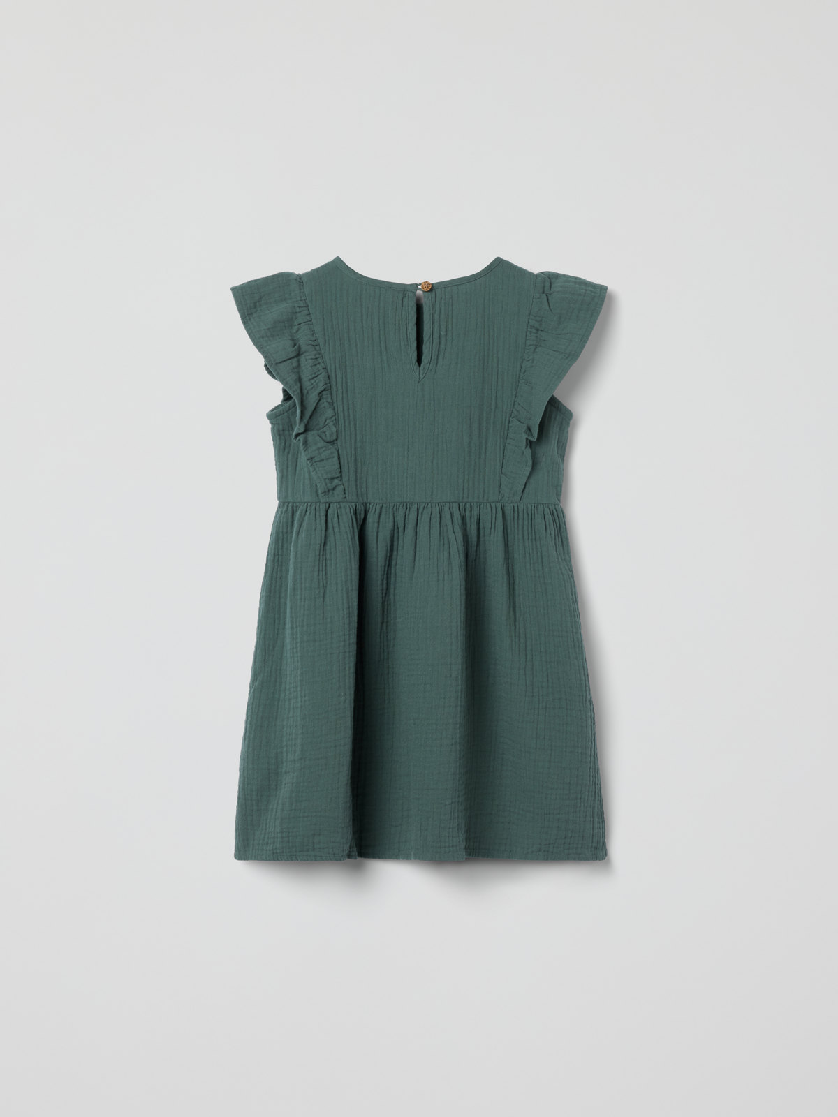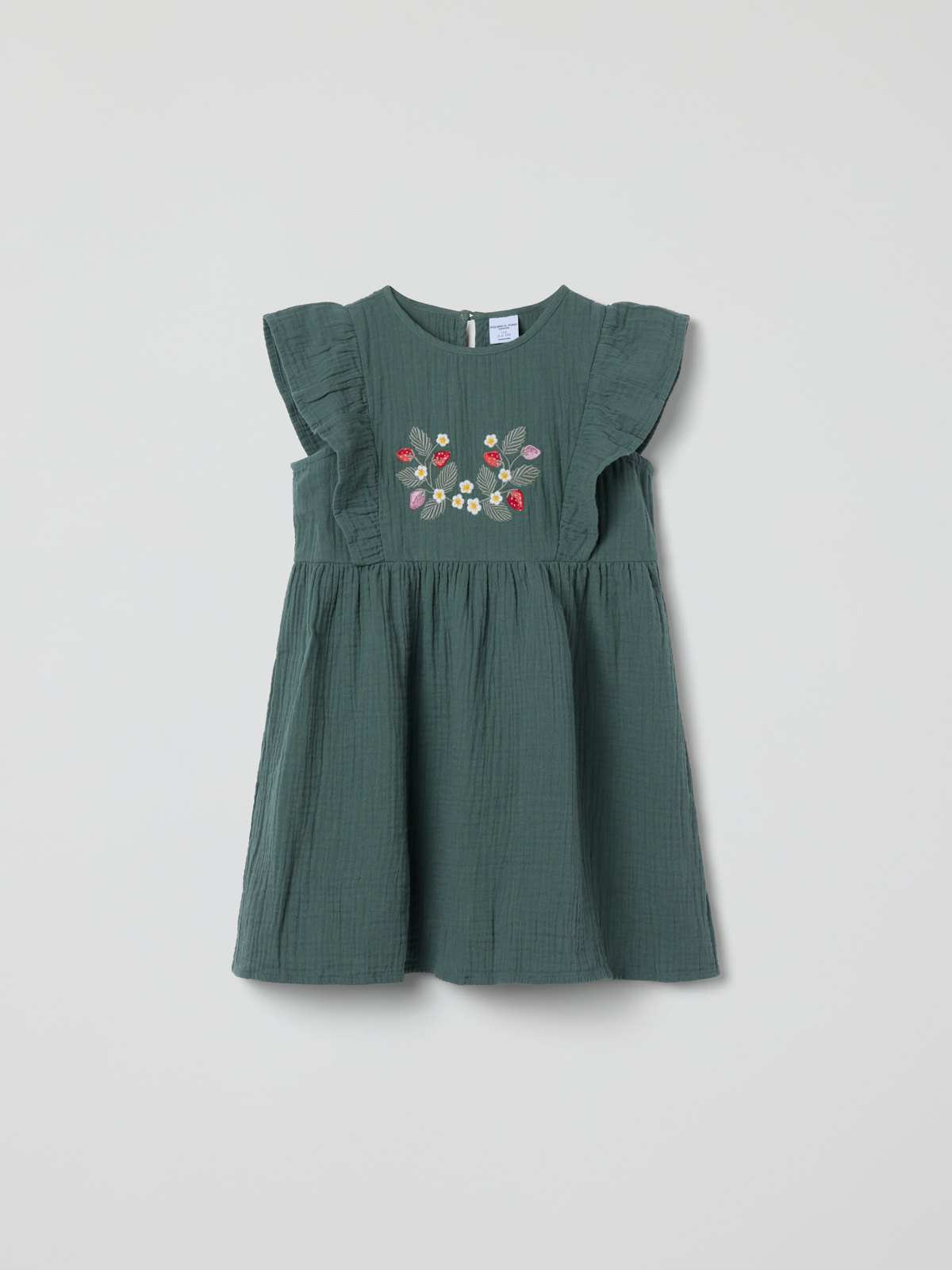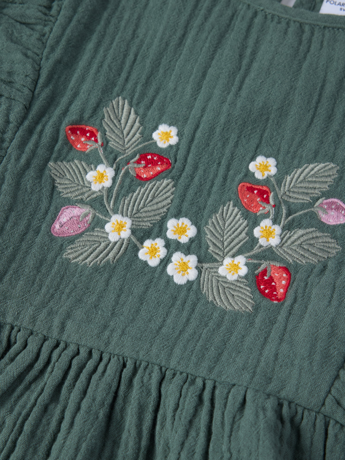 Kaunis mekko pehmeää 100 % luomupuuvillamusliinia – itsestään selvä valinta kesän juhliin! Mekossa on pehmeät röyhelöt olkapäillä ja kaunis brodeeraus rinnassa. Napit takana.