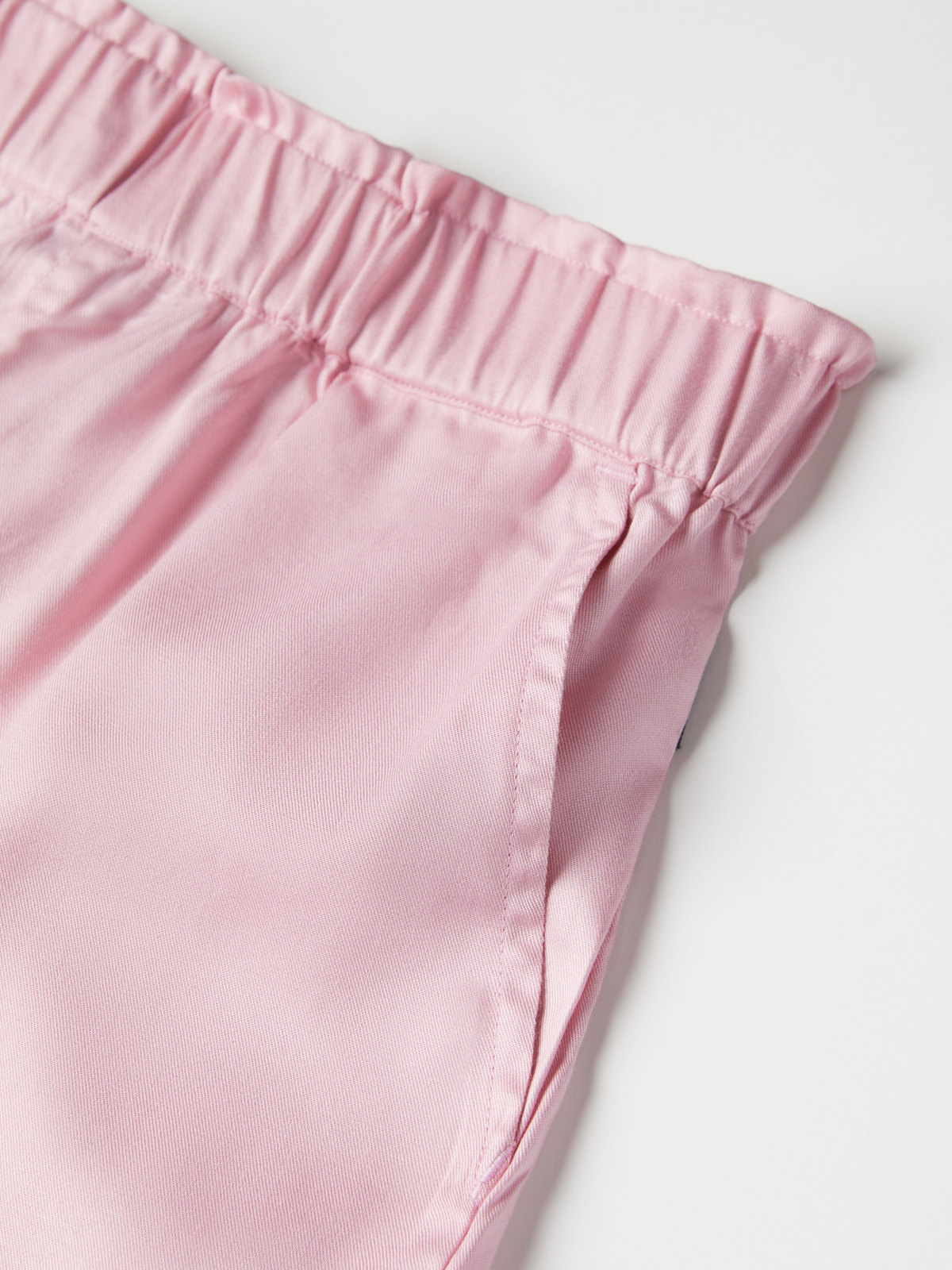 Joustava vyötärö, kaksi etutaskua ja taitetut lahkeensuut.