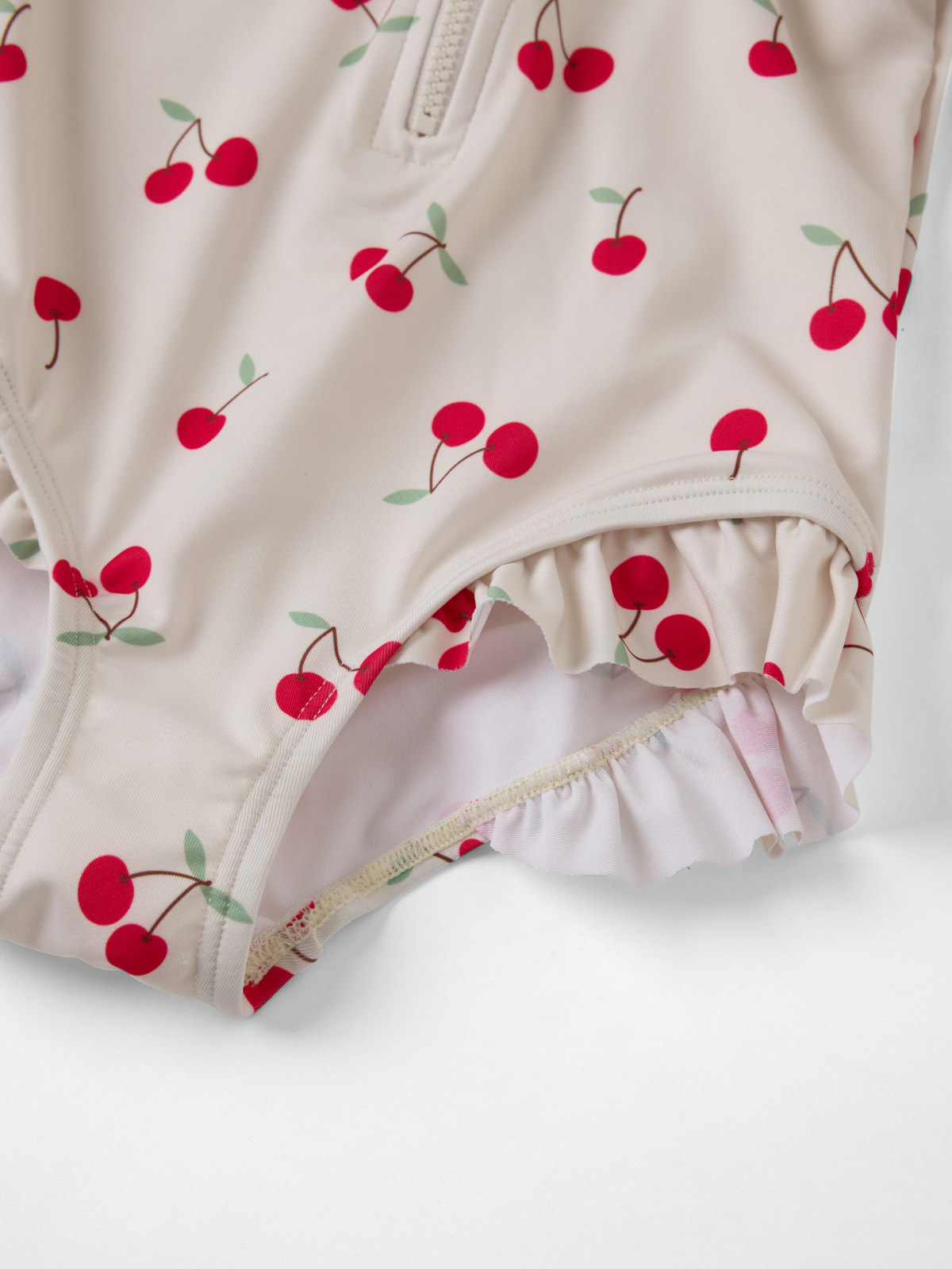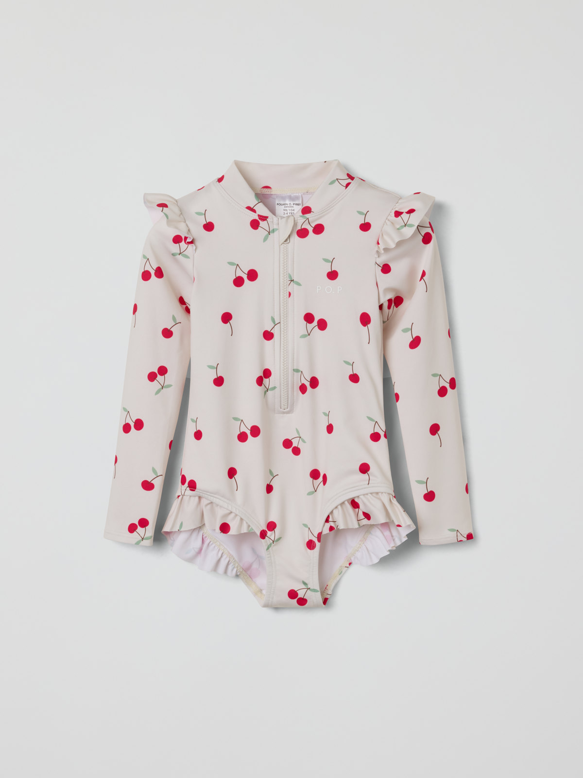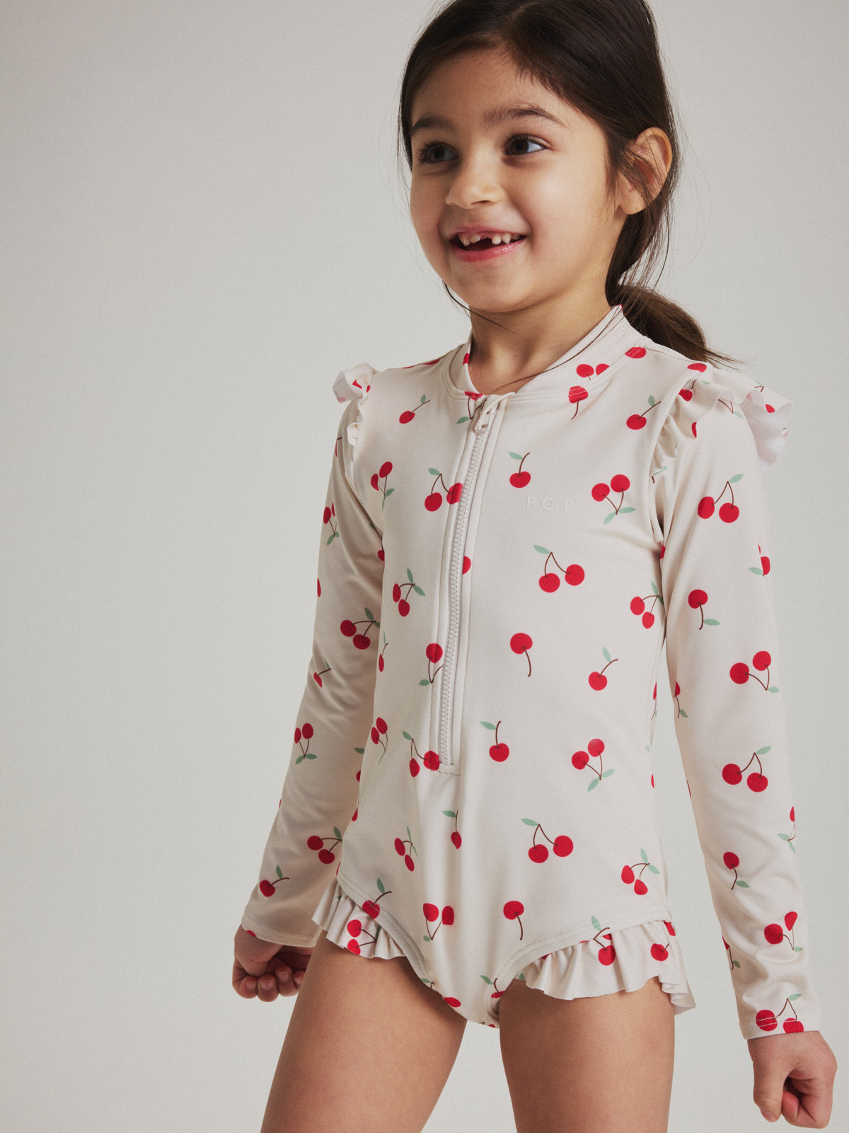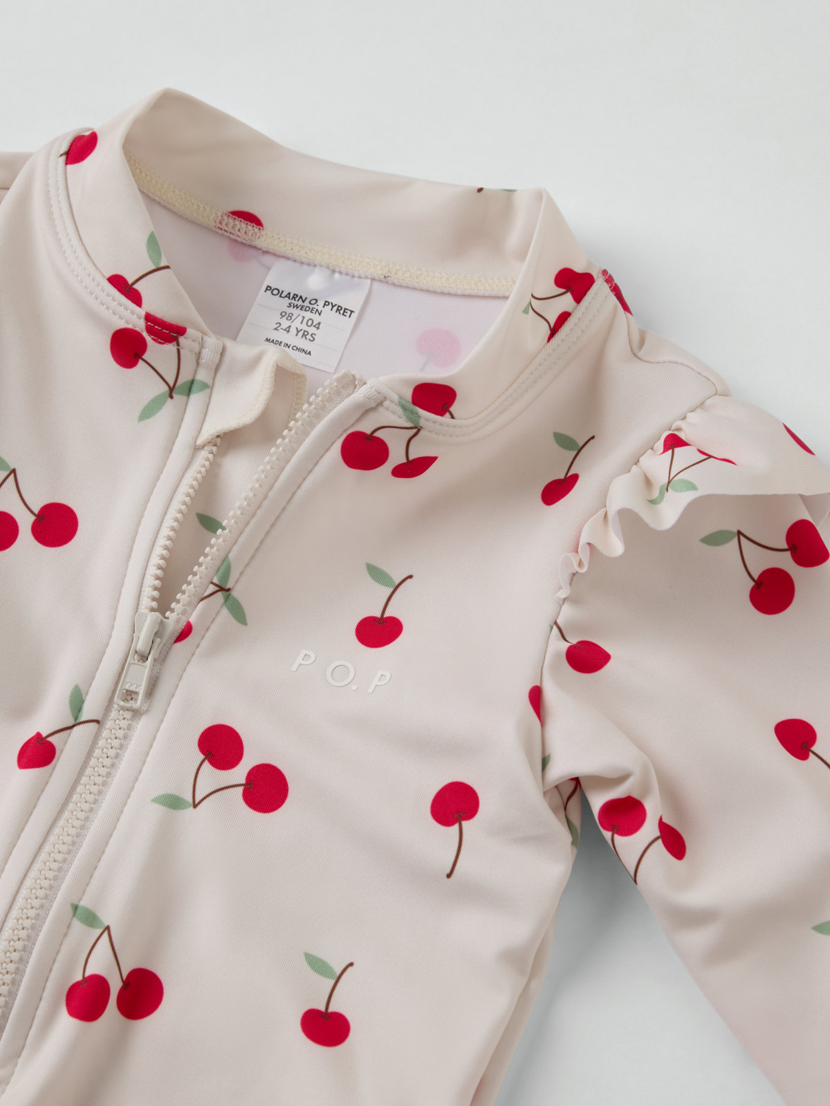Pitkähihainen uimapuku pehmeästä ja mukavasta kierrätetystä polyesteristä – täydellinen lapsille, jotka viihtyvät vedessä pitkään! Uimapuvussa on kätevä vetoketju edessä ja kauttaaltaan kirsikkakuosi. Suloiset röyhelöt koristavat olkapäitä ja lahkeita.