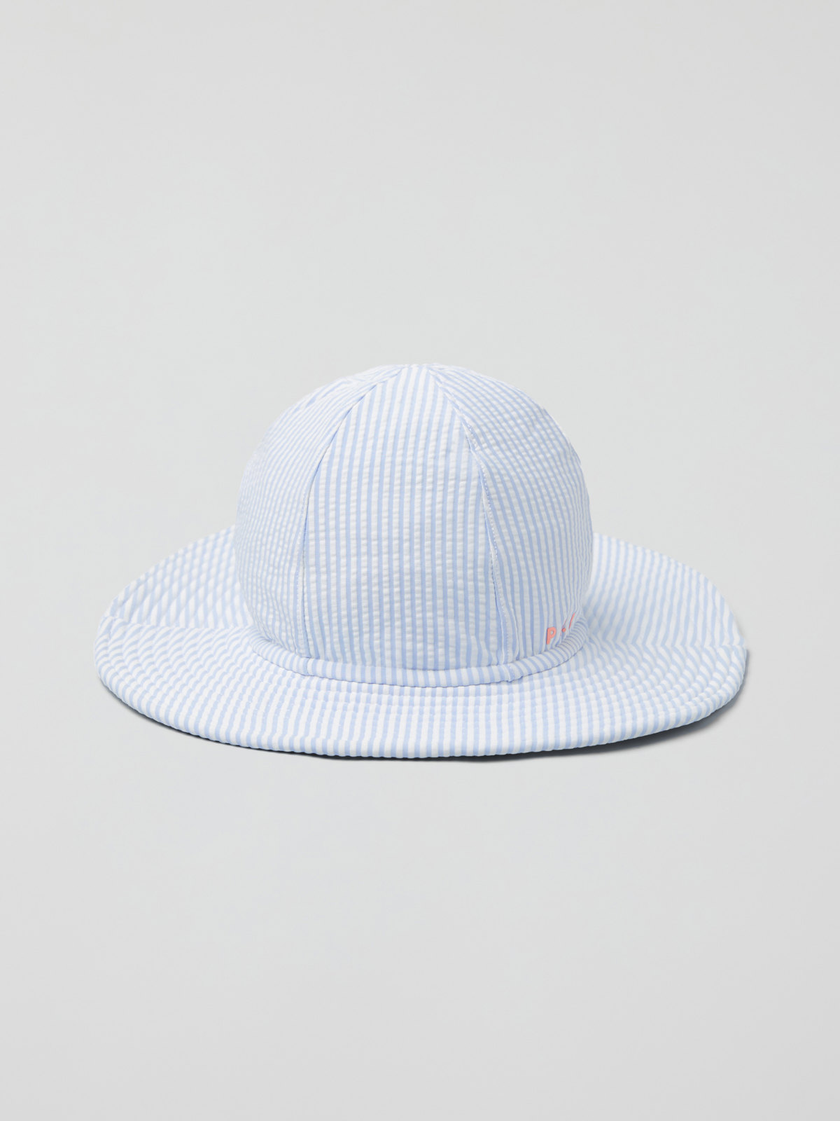 Raidallinen aurinkohattu, jossa UPF50 ja pehmeä, ilmava seersucker-kangas. Aurinkohatussa on erityisen leveä lieri niskan kohdalla, mikä suojaa tehokkaasti auringon voimakkailta säteiltä. Pehmeä materiaali tekee hatusta mukavan koko päivän käyttöön.