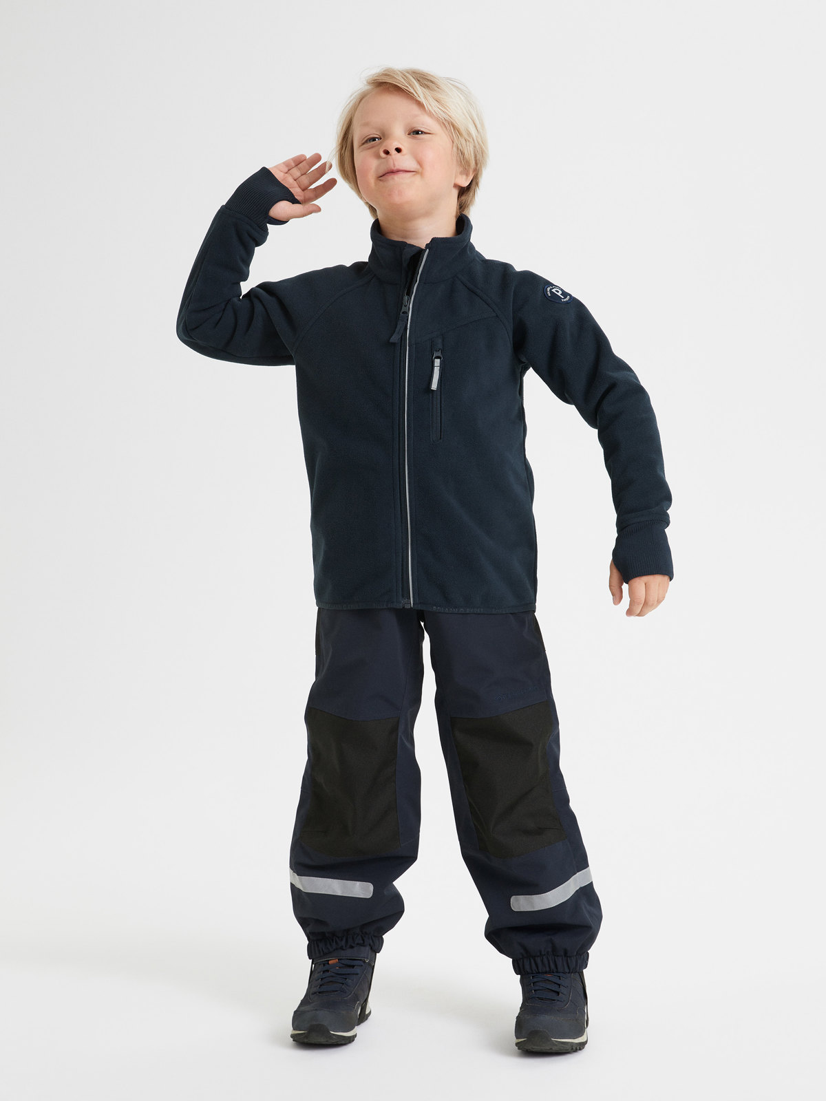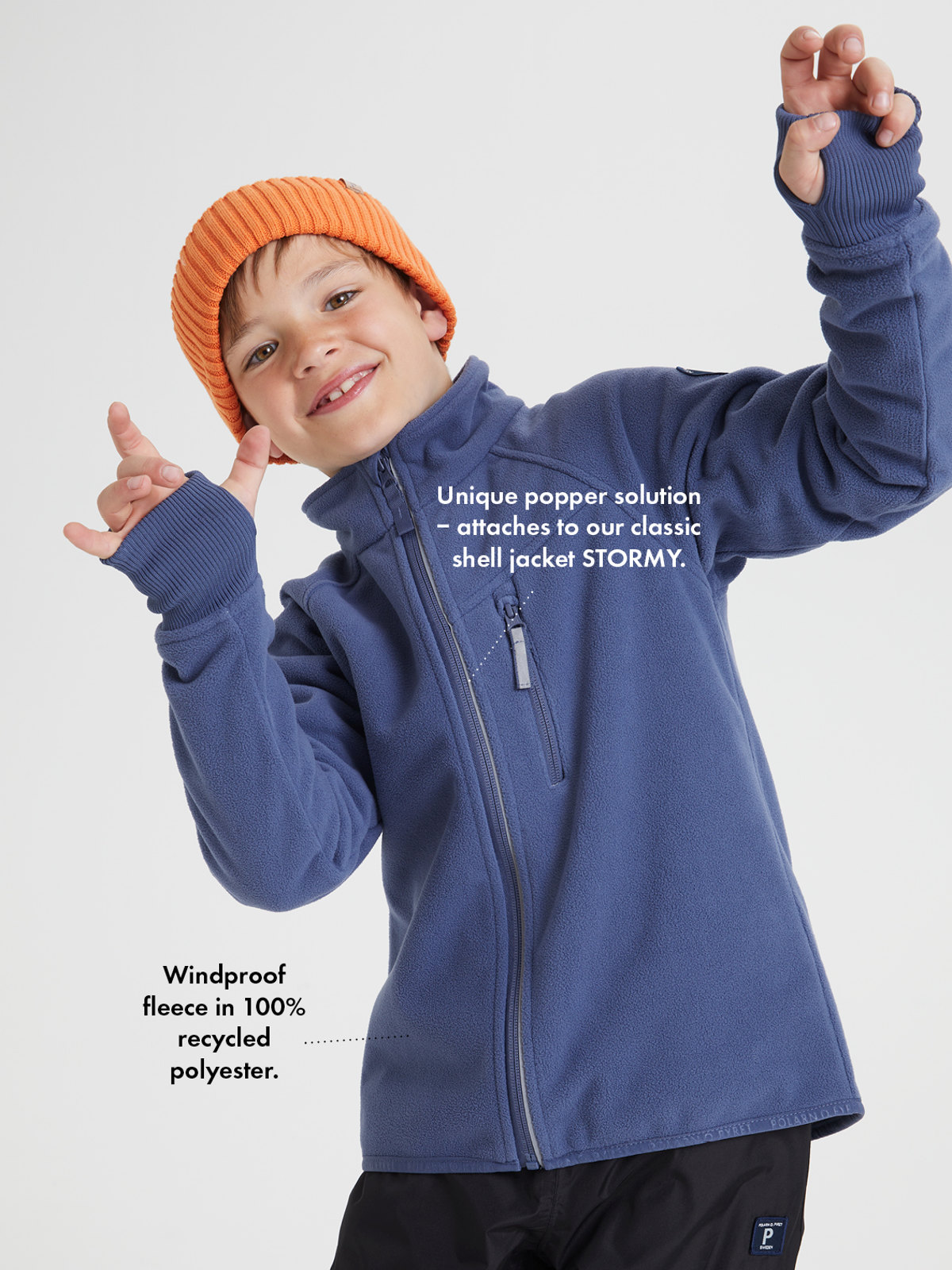 Windfleece on valmistettu kierrätetystä polyesteristä ja se hengittää hyvin, jotta lapsi pysyy lämpimänä ja kuivana. Vetoketjun sisäpuolella on tuulisuoja, joka antaa lisäsuojaa kylmyyttä vastaan. Vetoketjussa on myös suoja, jotta se ei hankaa leukaa ja poskia. Ainutlaatuisen nepparilistan avulla takki on kiinnitettävissä klassiseen kuoritakkiimme. Windfleece toimii 2-in-1-vaatteena: sitä voi käyttää välikerroksena 2 kuorivaatteen alla tai kerroksena 3 eli takkina leudommalla säällä.