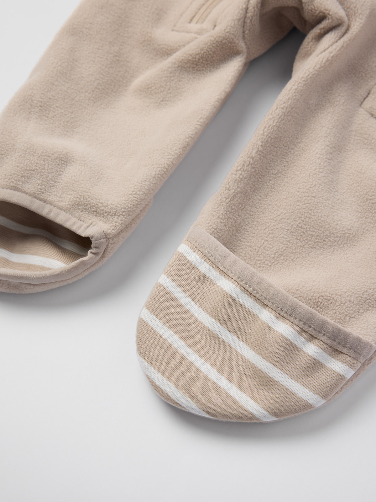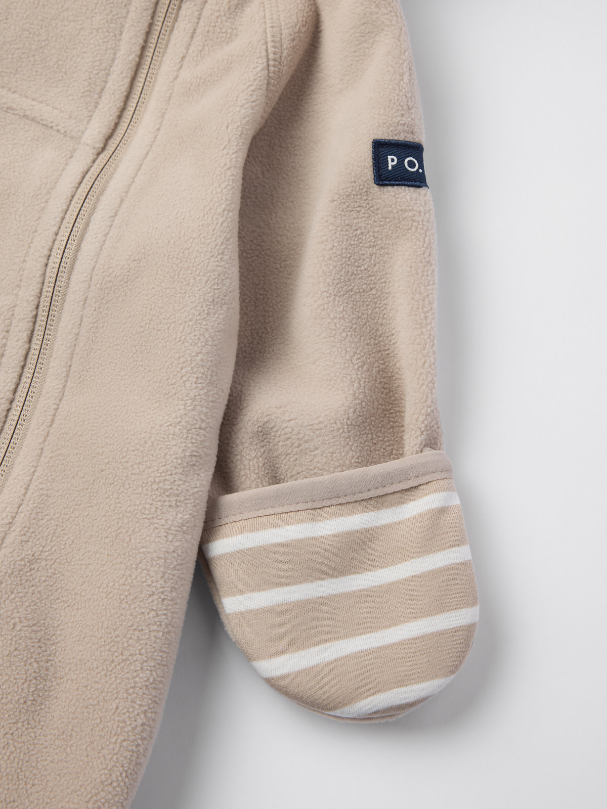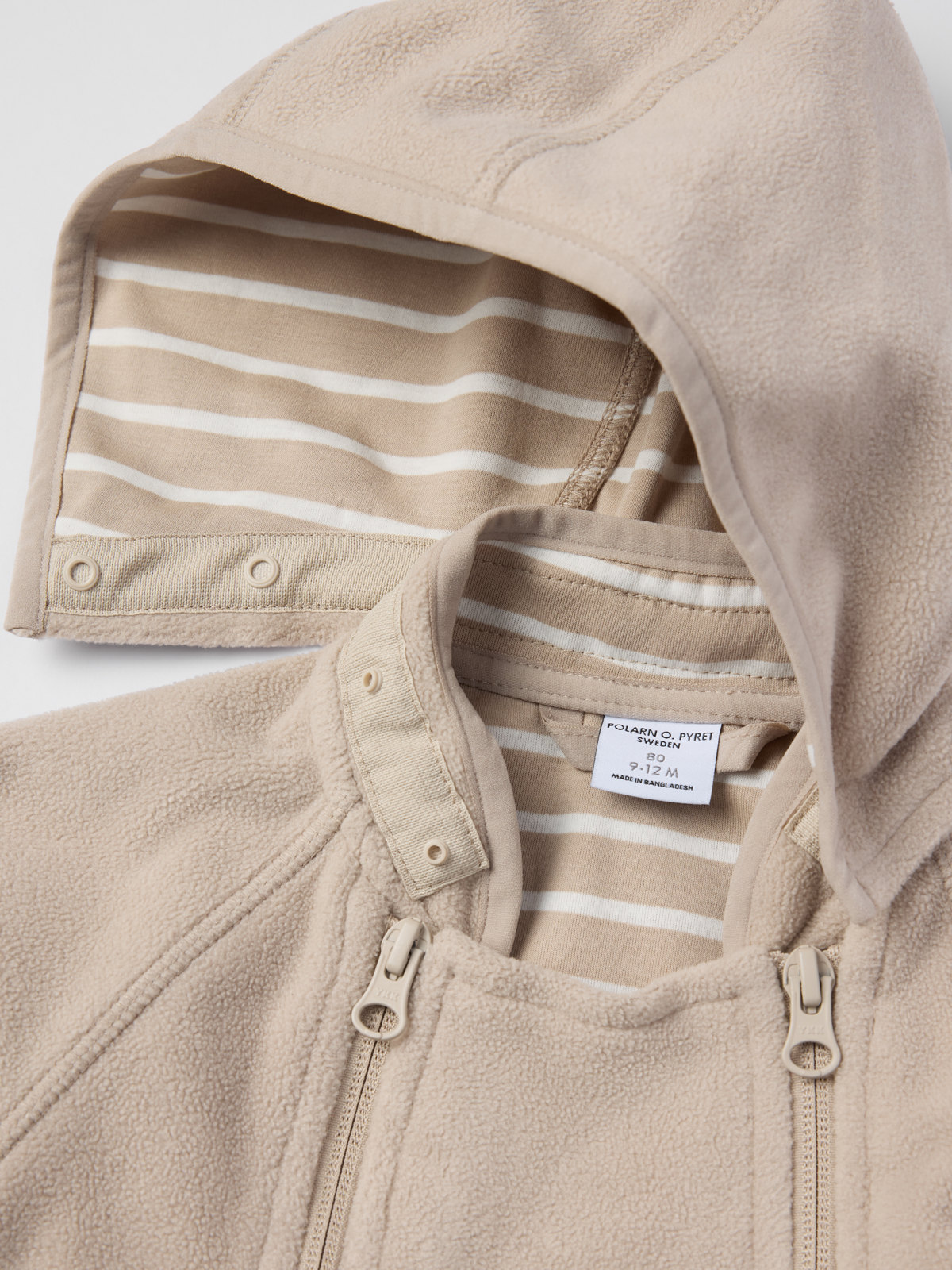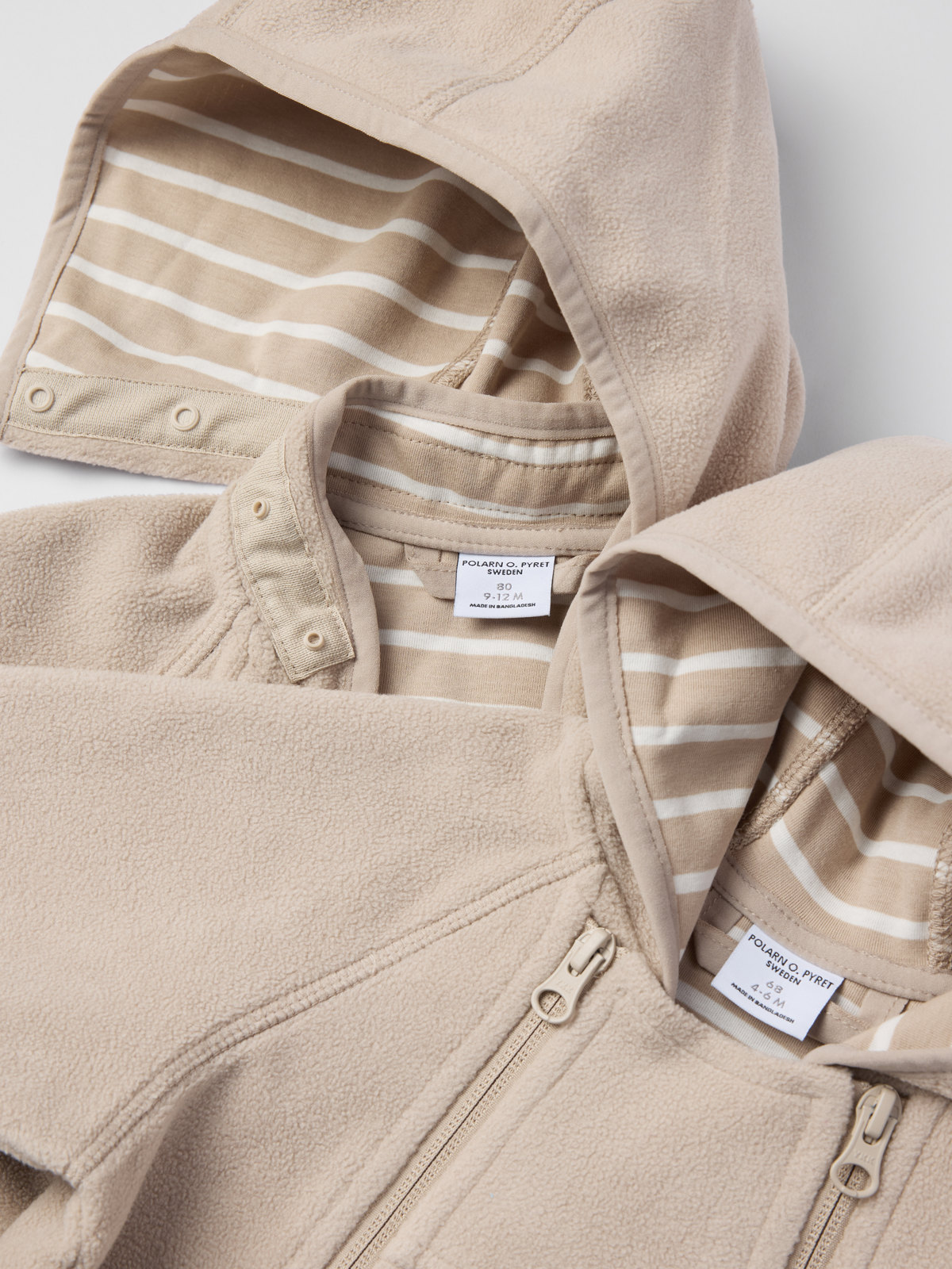 Vauvan tuulenpitävä ja vettähylkivä windfleece-haalari. Täydellinen vaunukäyttöön! Haalari on valmistettu kierrätetystä polyesteristä, joka hengittää hyvin. Vuori pehmeää 100 % luomupuuvillatrikoota klassisella raitakuosillamme. Kiinteä huppu. Edessä kaksi vetoketjua, jotka helpottavat pukemista.