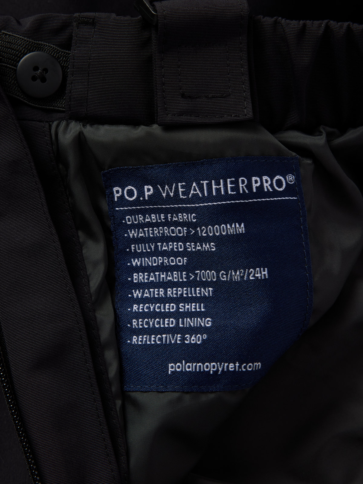 Ulkovaatteet, joissa on merkintä PO.P WeatherPro®, täyttävät kaikki vaatimuksemme teknisille ulkovaatteille, olipa kyse sitten kestävyydestä, vedenpitävyydestä, hengittävyydestä tai lapsiturvallisuudesta.