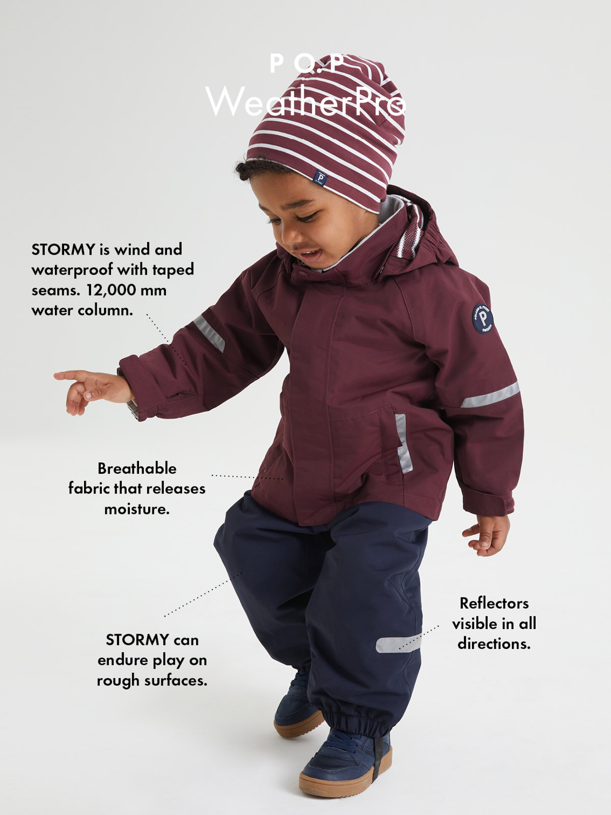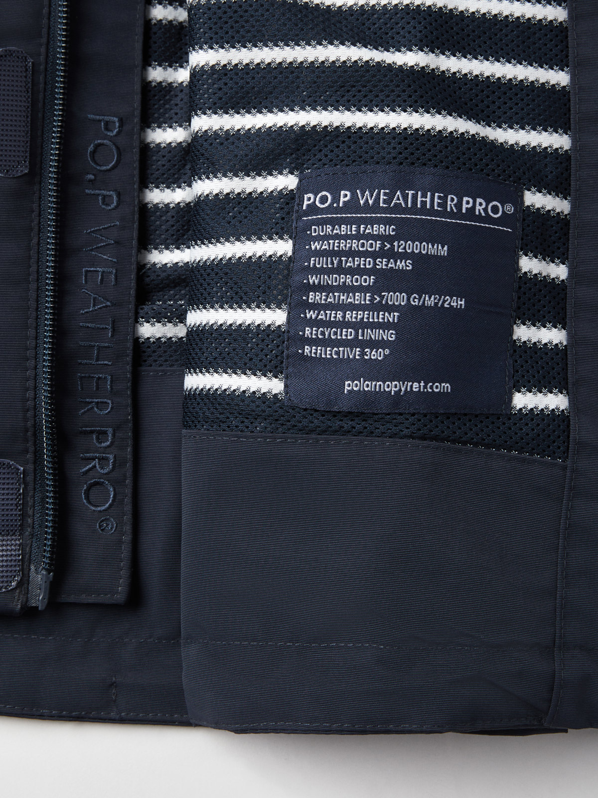 Ulkovaatteet, joissa on merkintä PO.P WeatherPro®, täyttävät kaikki vaatimuksemme teknisille ulkovaatteille, olipa kyse sitten kestävyydestä, vedenpitävyydestä, hengittävyydestä tai lapsiturvallisuudesta.