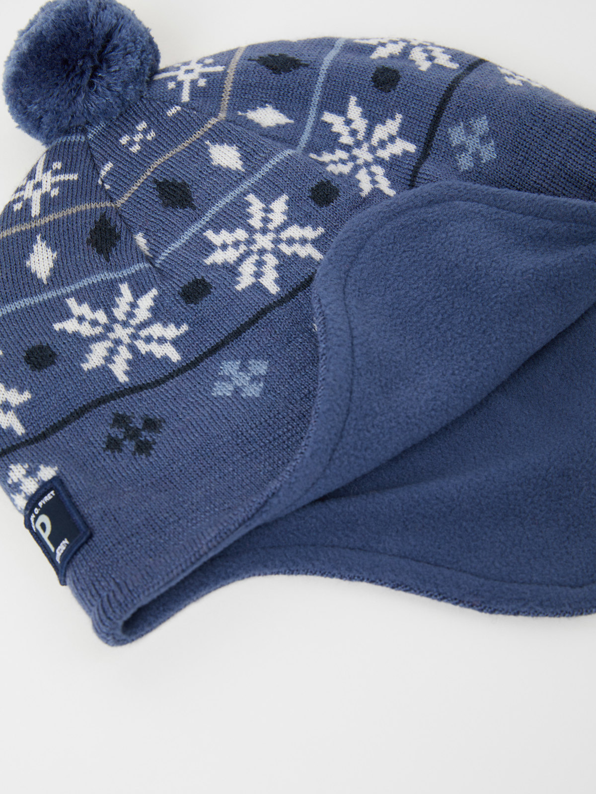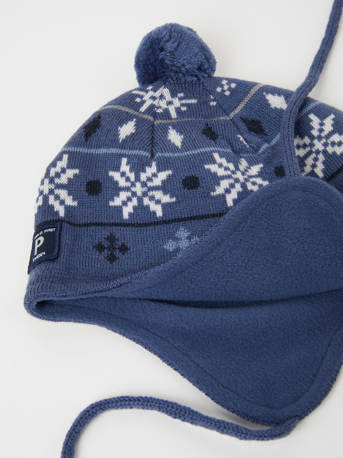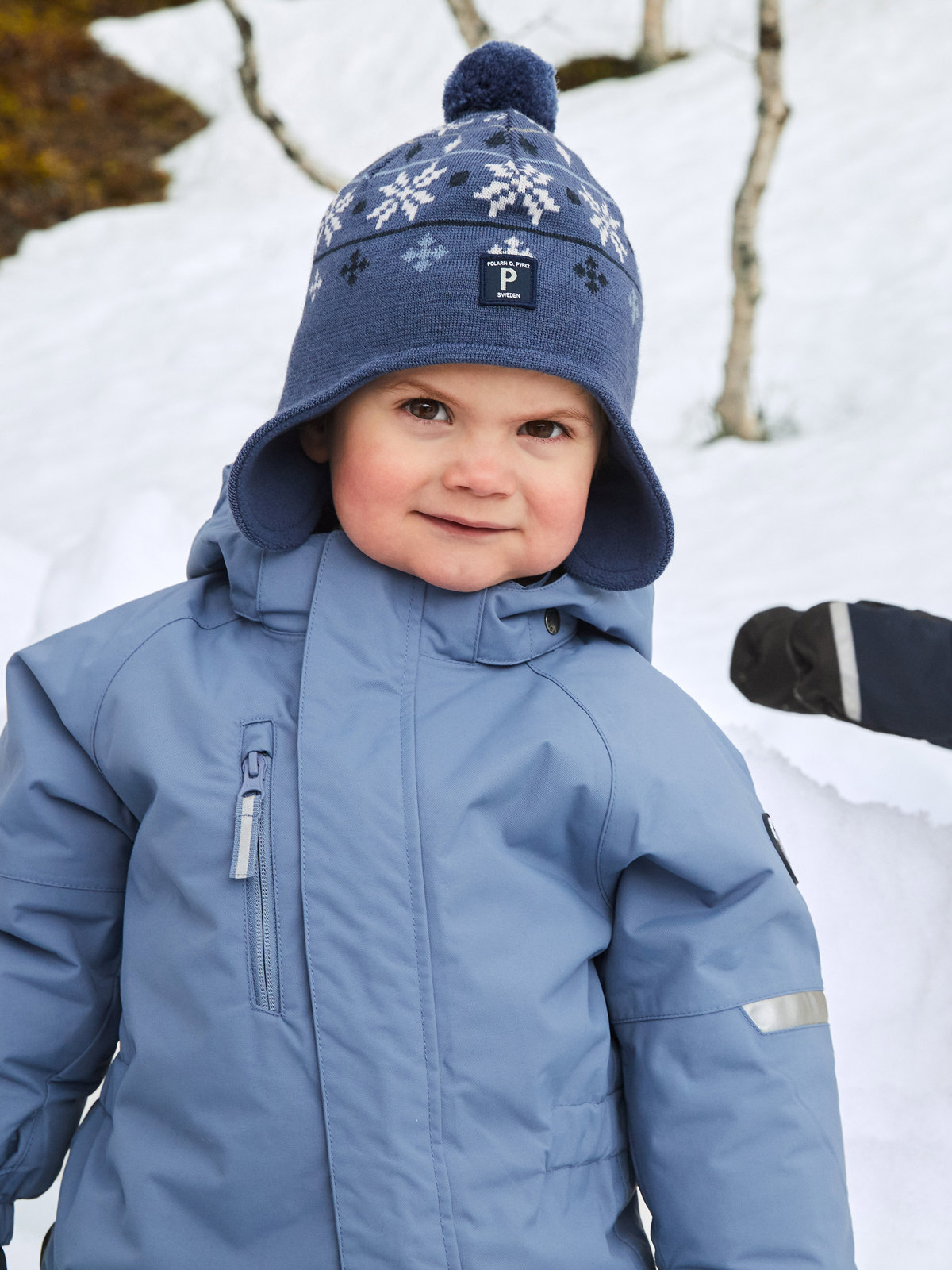 Jacquard-kuvioinen kypärämyssy lämmintä villasekoitetta. Tuulenpitävässä pipossa on pehmeä ja mukava fleecevuori ja se peittää korvat. Leuan alta solmittavien nauhojen avulla se pysyy hyvin paikoillaan. Koossa 52/54 ei ole nauhoja. Villa pitää lämpimänä myös kosteana.