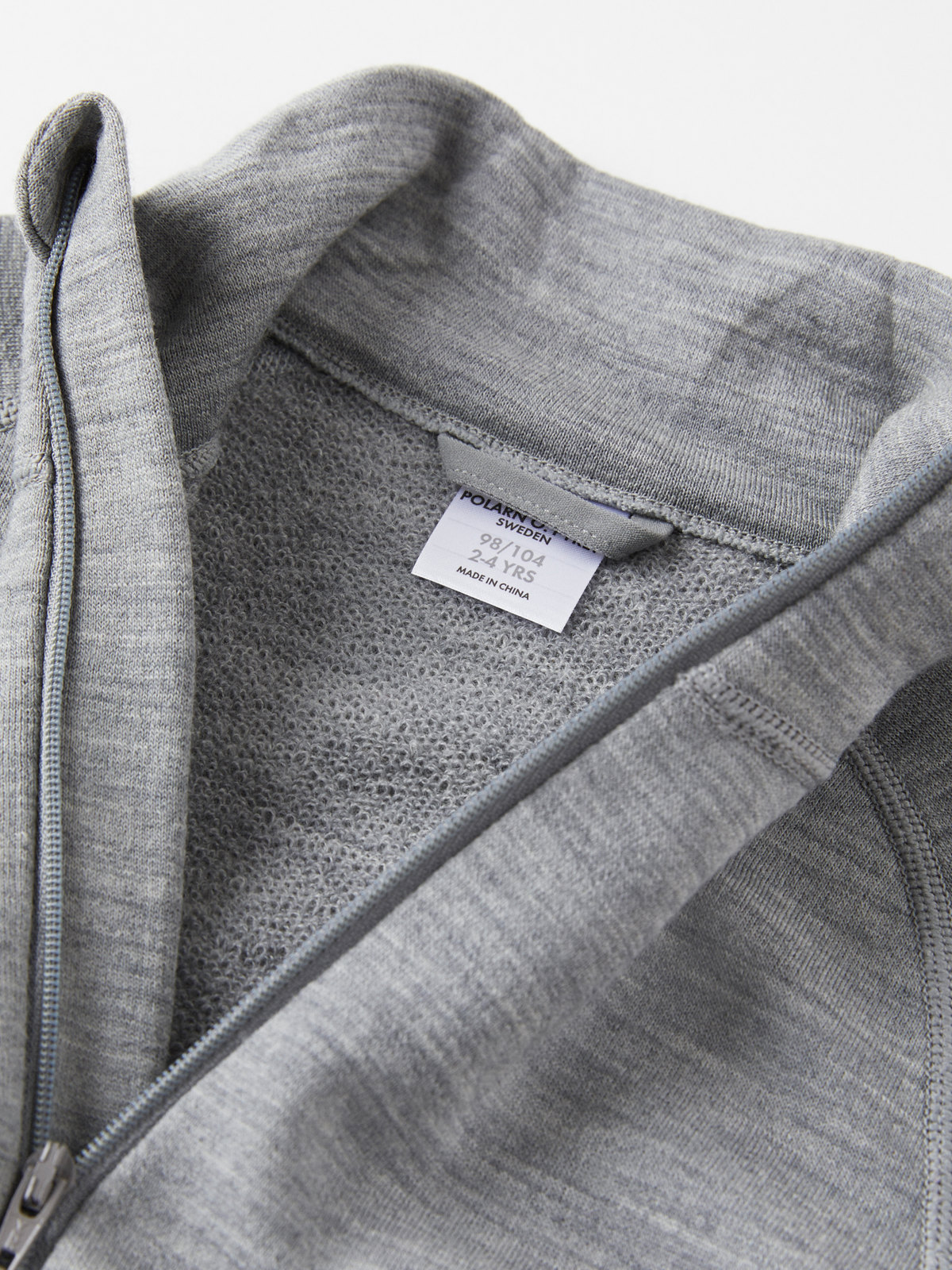 Lämmin ja paksu huppari pehmeää villafroteeta. Huppari on valmistettu merinovillasta, joka imee tehokkaasti kosteutta ja pitää lapsen lämpimänä ja kuivana. Frotee säilyttää lämmittävän ilmakerroksen lähellä kehoa, ja villa sekä pitää lämpöä että hengittää. Edessä vetoketju.
