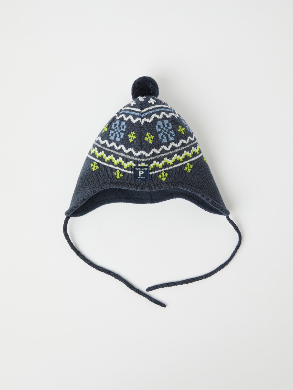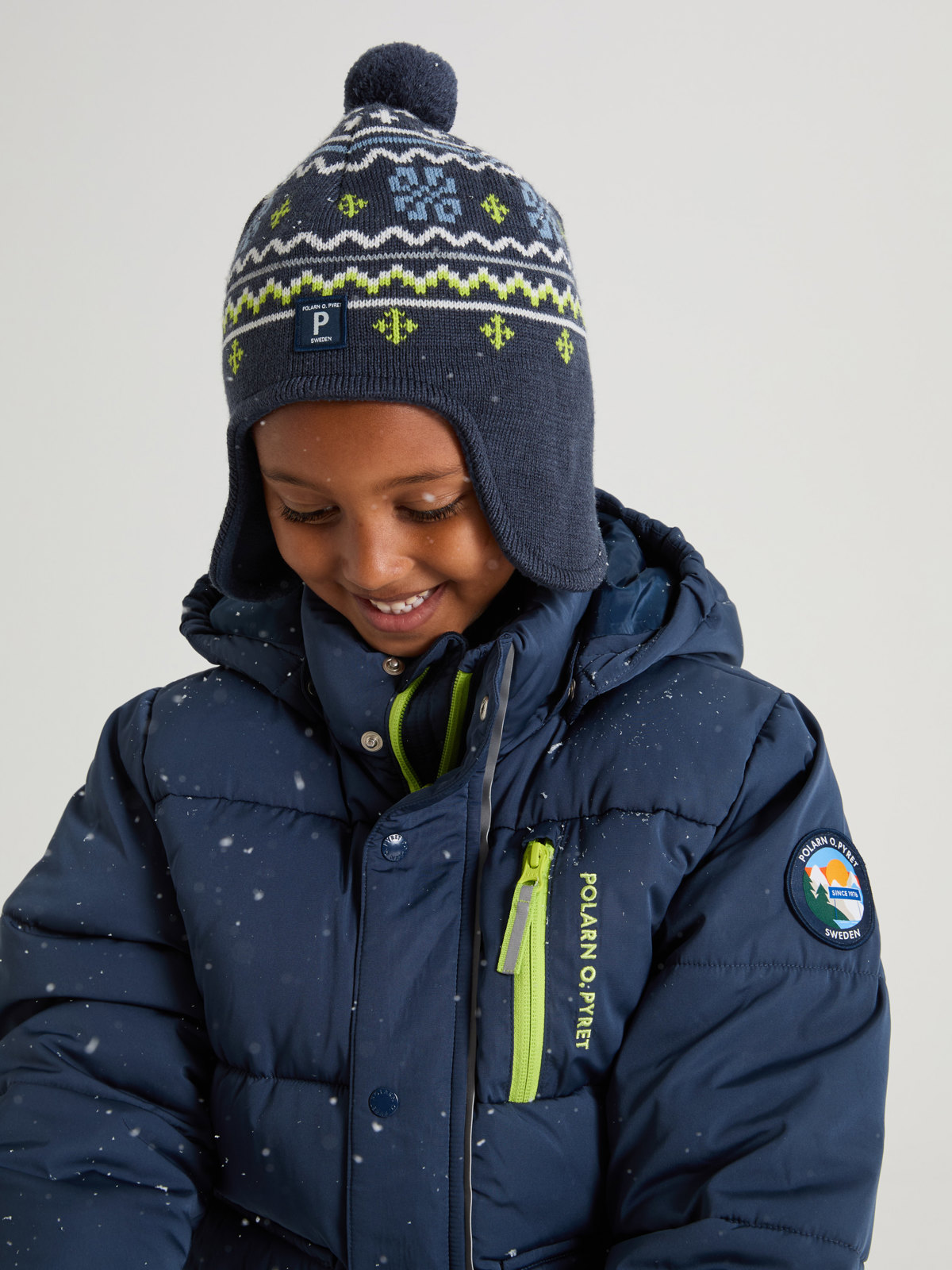 Tuulenpitävä jacquard-kuvioinen kypärämyssy lämmintä villasekoitetta. Hieno tupsu. Pipossa on pehmeä fleecevuori.