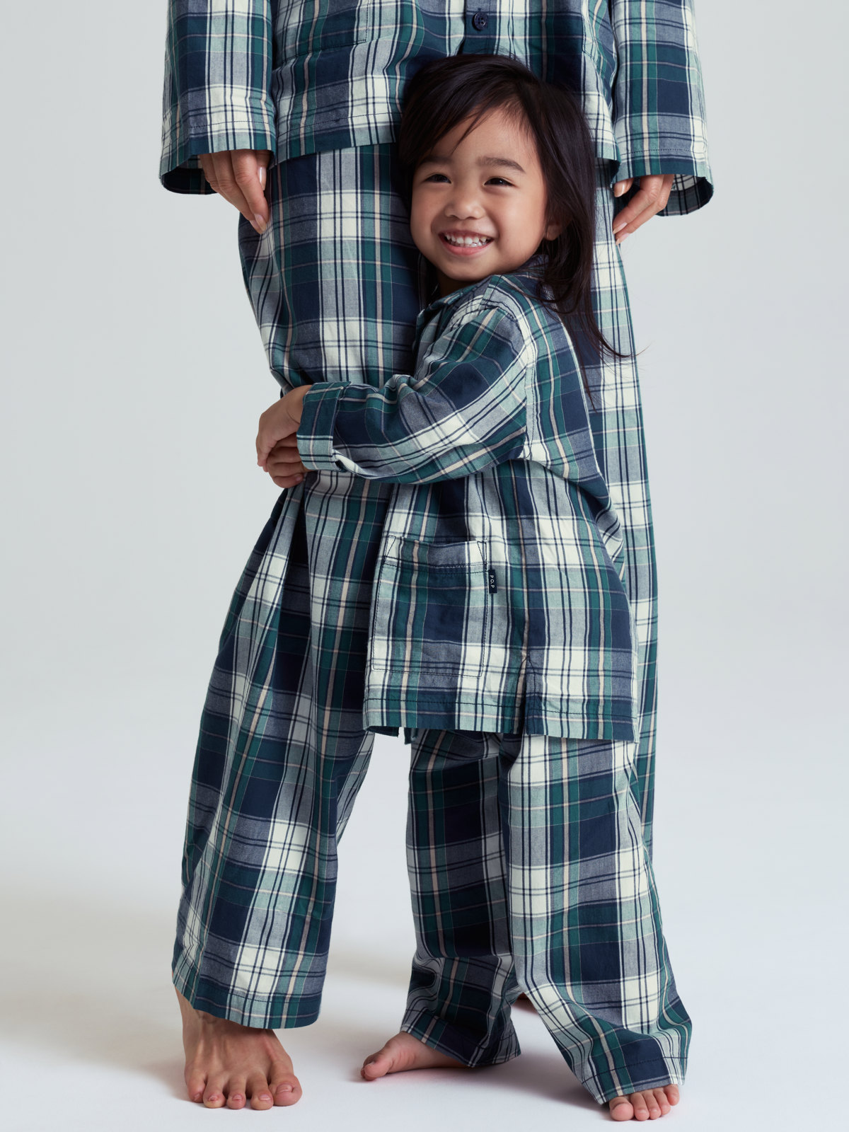 Aikuisten ruudullinen kaksiosainen pyjama, jossa on klassinen paita ja suorat housut – koko perhe voi samistella! Pyjama on valmistettu kevyesti harjatusta puuvillasta, ja siinä on joustava vyötärö.