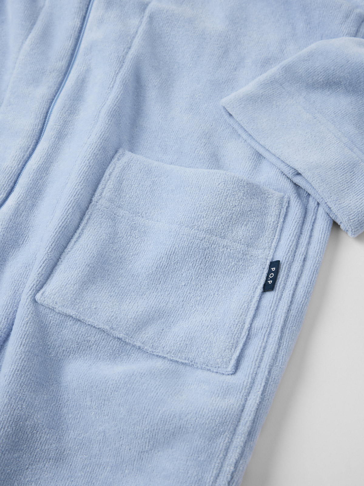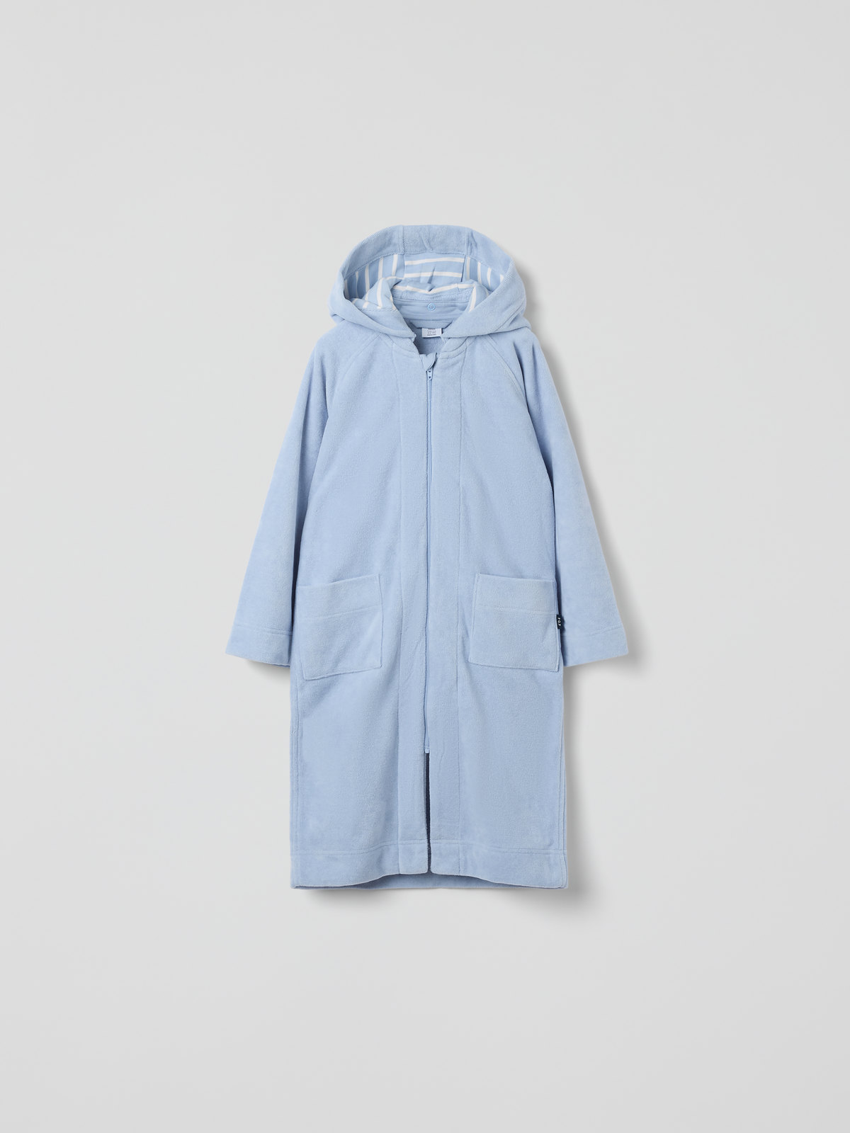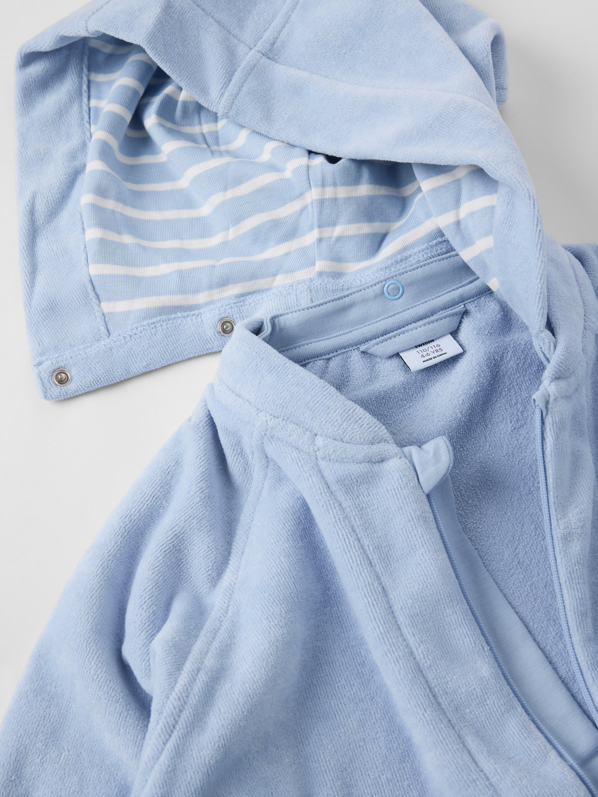Yksivärinen kylpytakki pehmeää ja mukavaa 100 % luomupuuvillaa. Irrotettavassa hupussa on puuvillatrikoovuori, jossa on klassinen raitakuosimme. Aamutakki ulottuu pohkeeseen asti. Kiinnitetään vetoketjulla ja solmimisnauhalla.