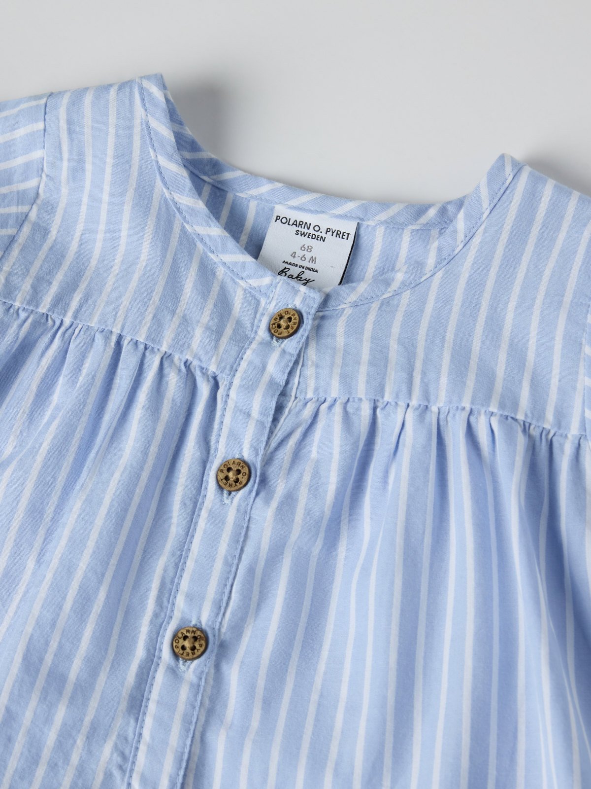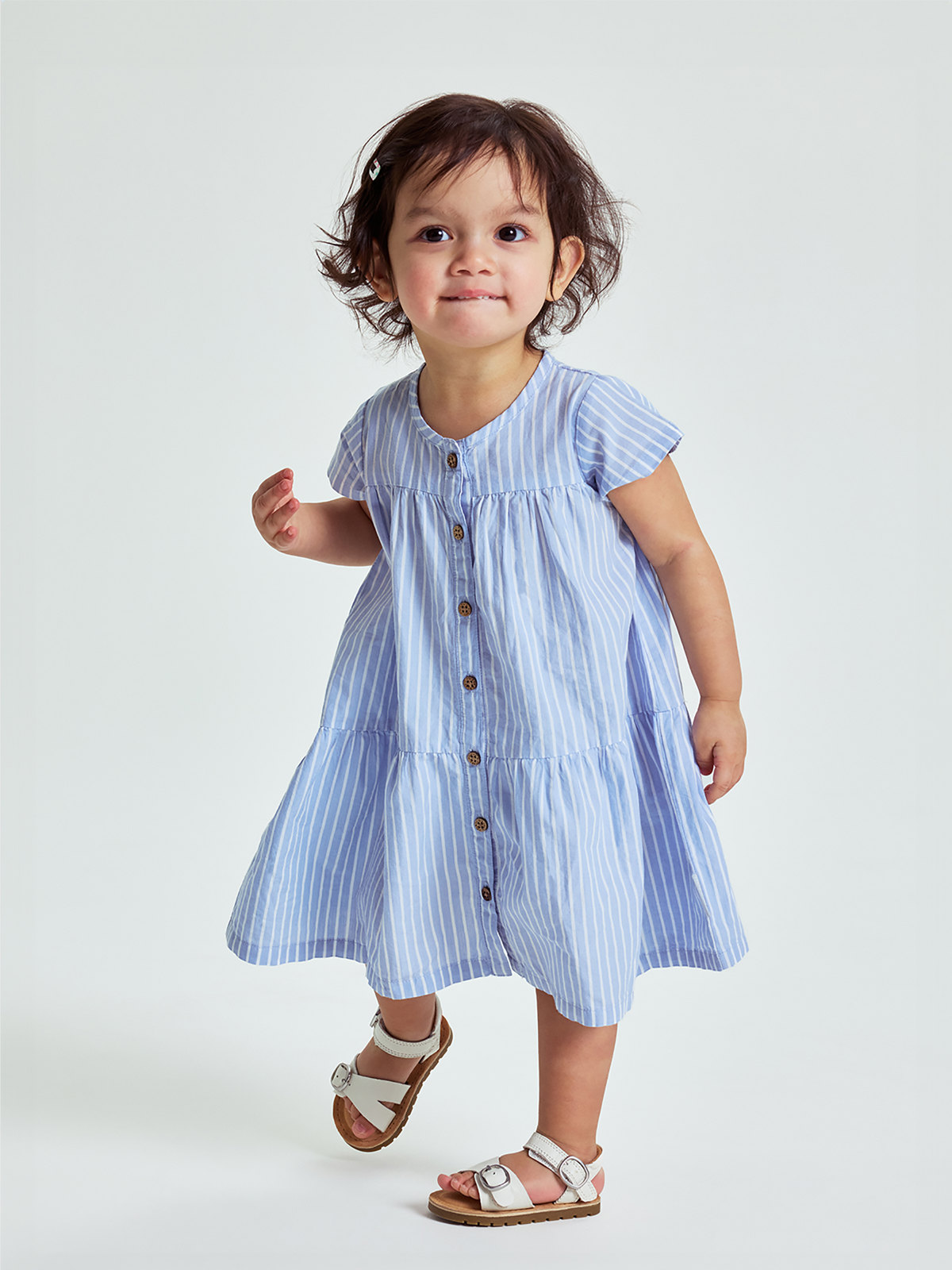 Vauvan lyhythihainen, raidallinen mekko luomupuuvillapopliinia – täydellinen sekä arkeen että kesäjuhliin! Edessä nappikiinnitys.