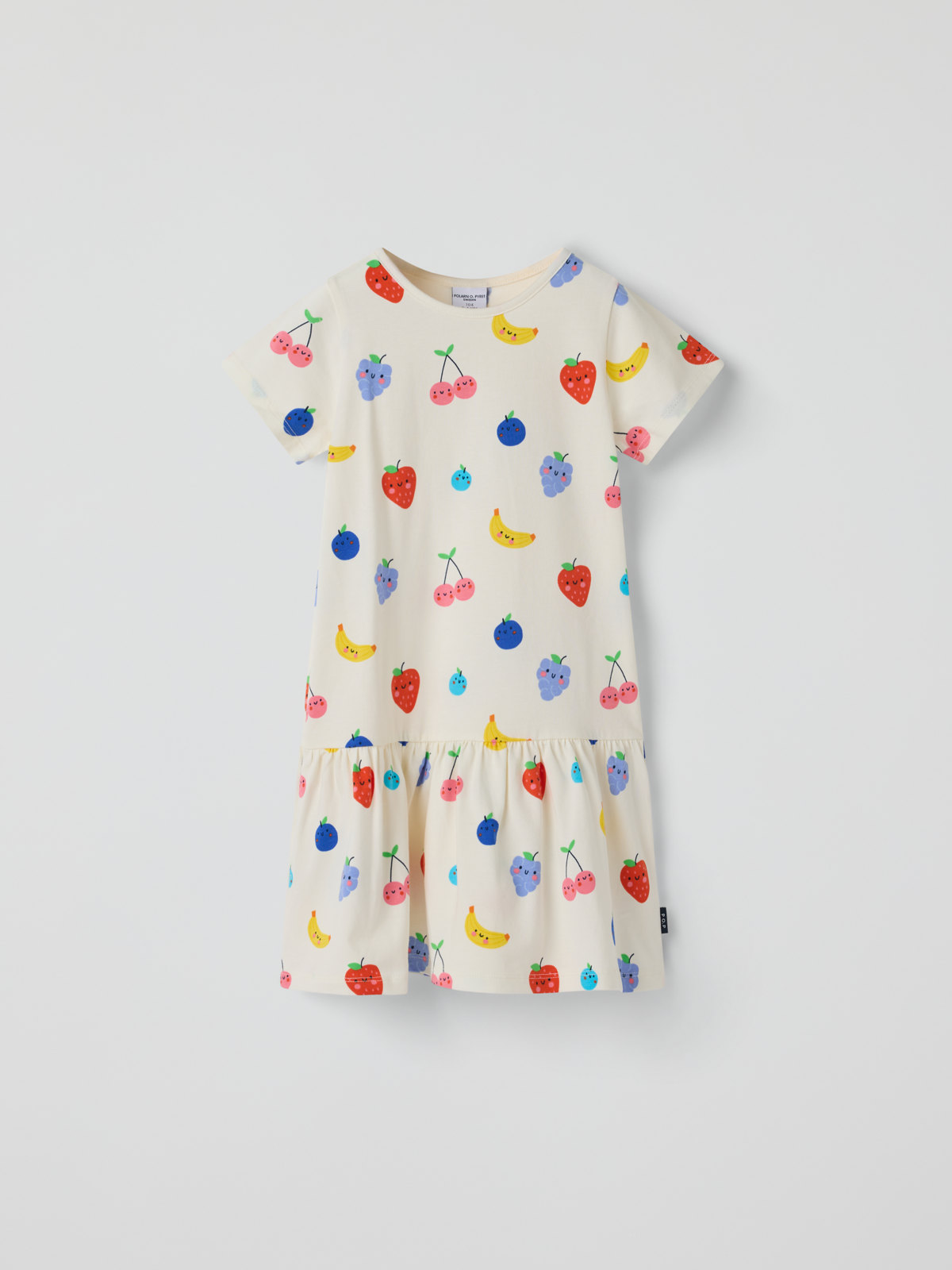 Kuvioitu lyhythihainen mekko pehmeää luomupuuvillaa – kesän suosikki arkeen ja juhlaan! Mekossa on matalalle leikattu vyötärö ja rypytetty helma.