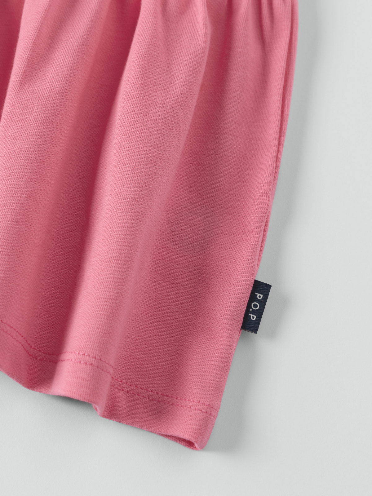 Lyhythihainen mekko pehmeää luomupuuvillaa – kesän suosikki arkeen ja juhlaan! Mekossa on matalalle leikattu vyötärö ja rypytetty helma.