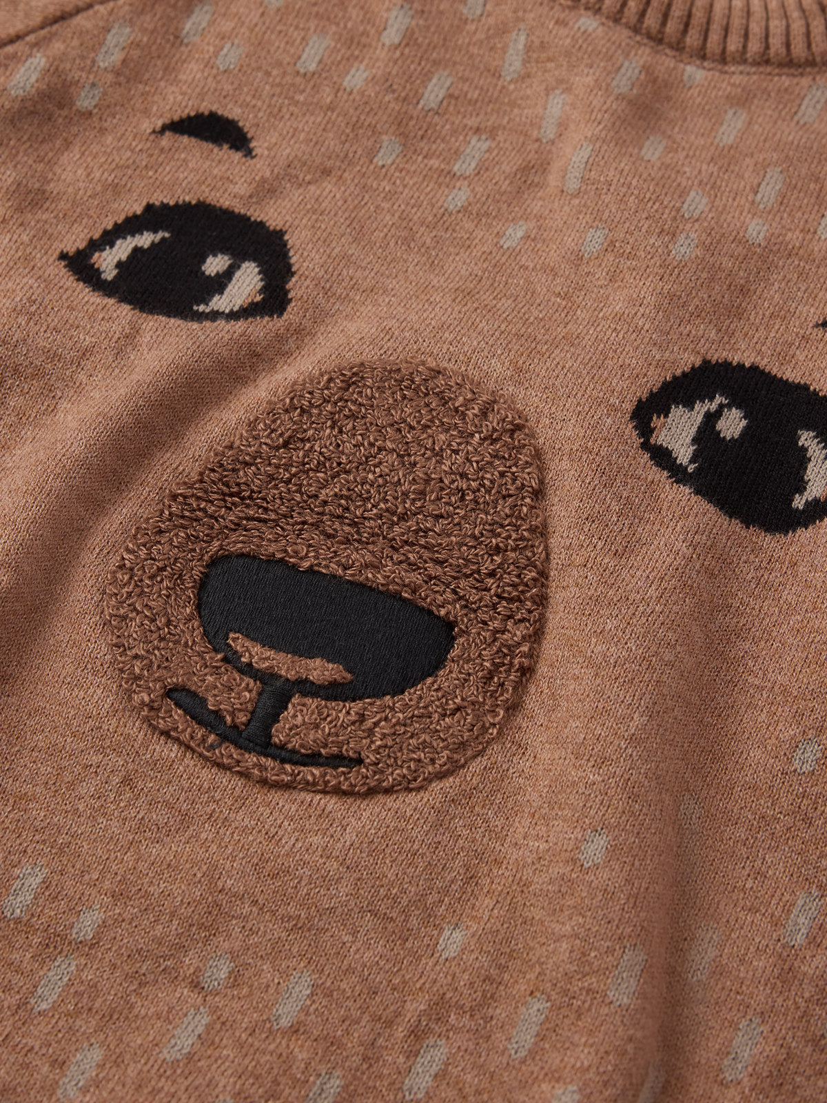 Paksumpi neule 100 % luomupuuvillasta – todella lämmin ja mukava kylmällä! Neuleessa on iso karhun kuva edessä ja ommellut pienet korvat olkapäillä. Resorit kauluksessa, hihoissa ja helmassa antavat mukavan istuvuuden.