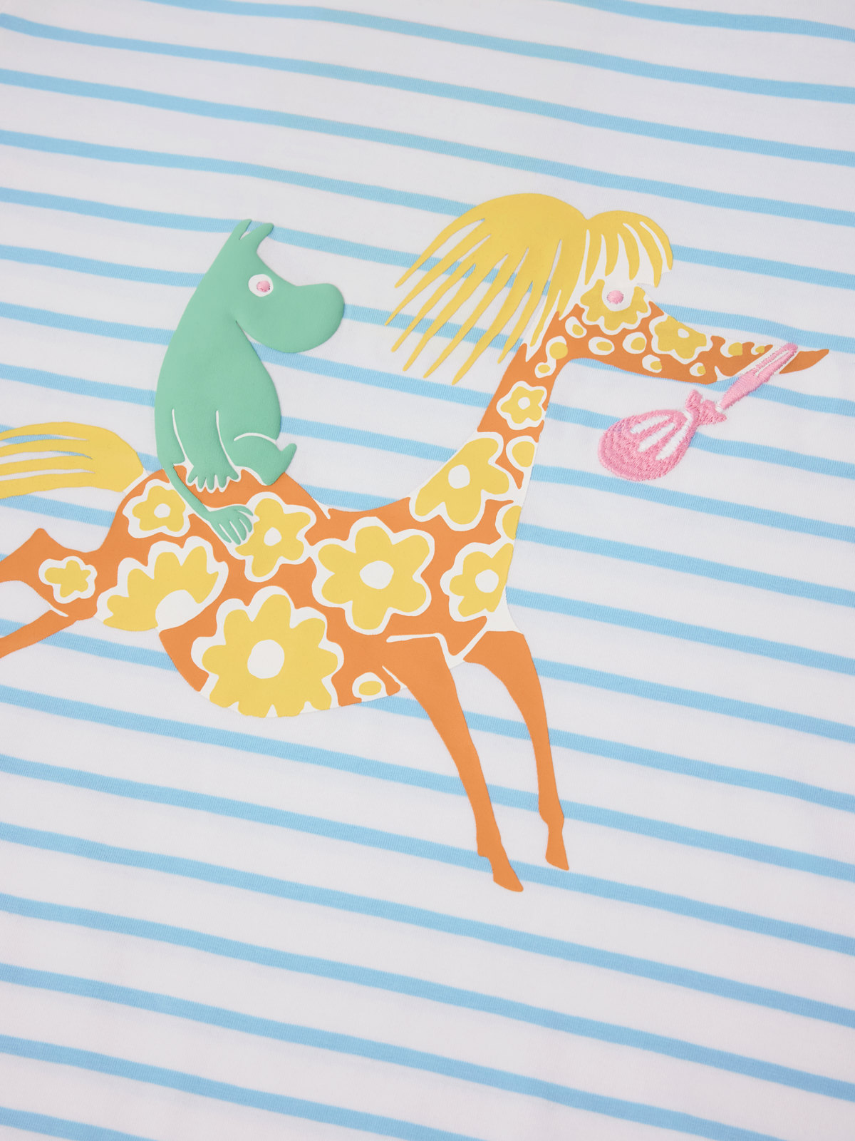 T-paita 100 % luomupuuvillaa. Kuvitus Tove Janssonin muumitarinoista. Täydellinen kaikkiin tilanteisiin! Tämä vaate on osa rajoitettua mallistoamme, joka juhlistaa Muumien 80-vuotisjuhlaa. Juhlavuoden 2025 kunniaksi Muumit esiintyvät jälleen väreissä – ensimmäistä kertaa sitten vuoden 1956.