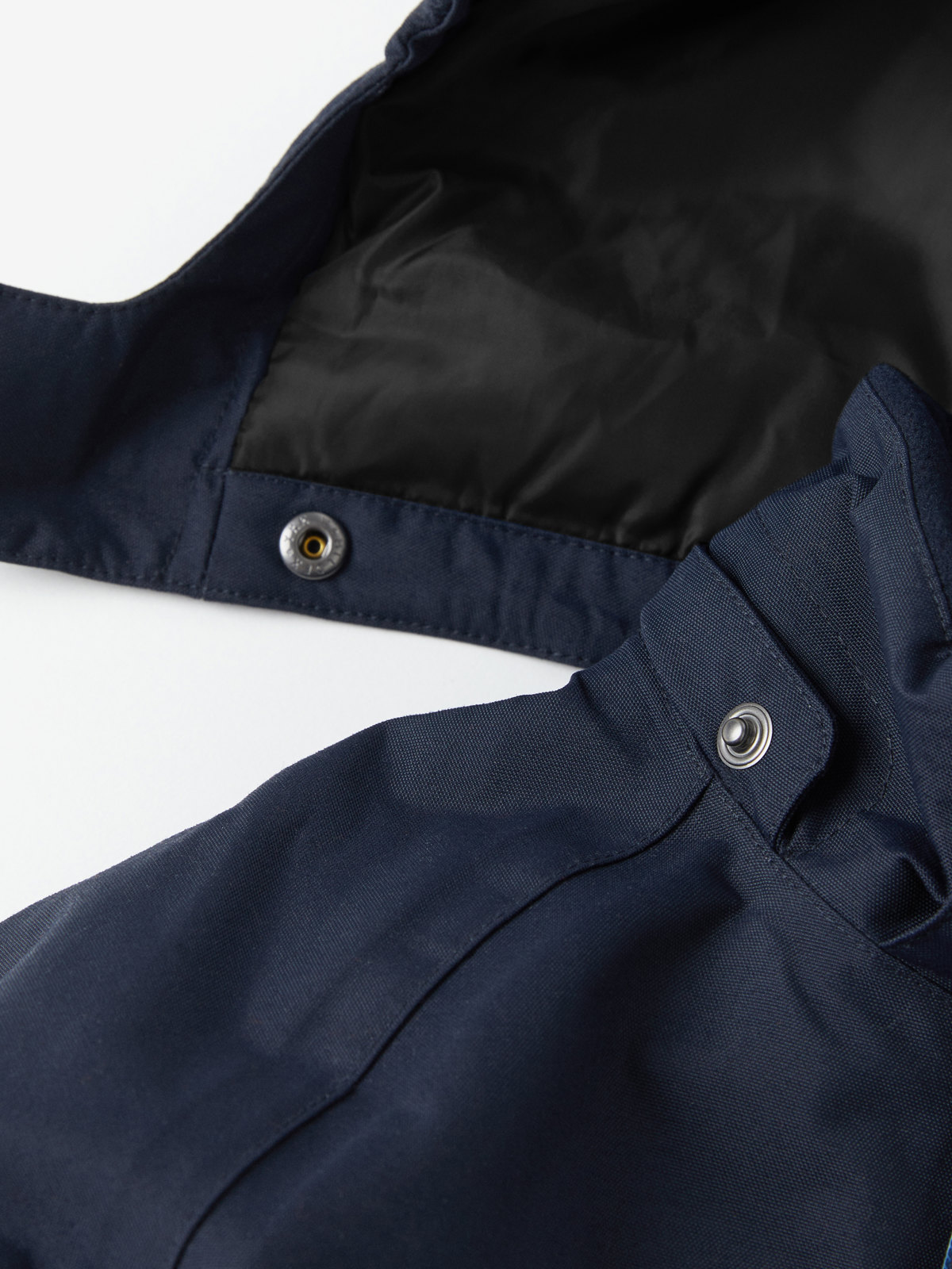 Polvissa ja takapuolessa on vahvike- ja vedenkestävä kangas. Takapuolessa on lisäksi pehmeä fleecevuori, joka antaa lisälämpöä lapsen istuessa. Säädettävässä ja irrotettavassa hupussa on nepparikiinnitys sekä joustavat sivut, mikä tekee siitä hyvin istuvan. Vetoketjussa on suoja, jotta se ei hankaa leukaa ja poskia. Lisäksi kaksinkertainen tuulisuoja antaa lisäsuojaa kylmyyttä ja lunta vastaan. Vetoketju jatkuu toiseen lahkeeseen, mikä helpottaa pukemista.