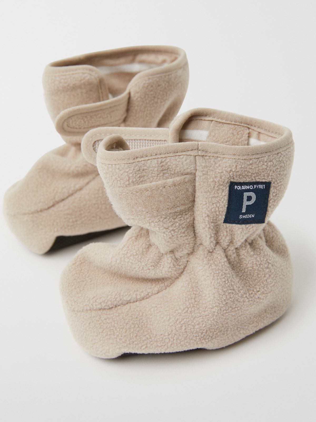 Tossut on valmistettu 100 % kierrätetystä polyesteristä ja niiden pehmeä trikoovuori on 100 % luomupuuvillaa. Joustava kuminauha nilkan ympärillä ja tarrakiinnitys edessä helpottavat pukemista ja riisumista. Pohjan alapinta hieman paksumpaa materiaalia.