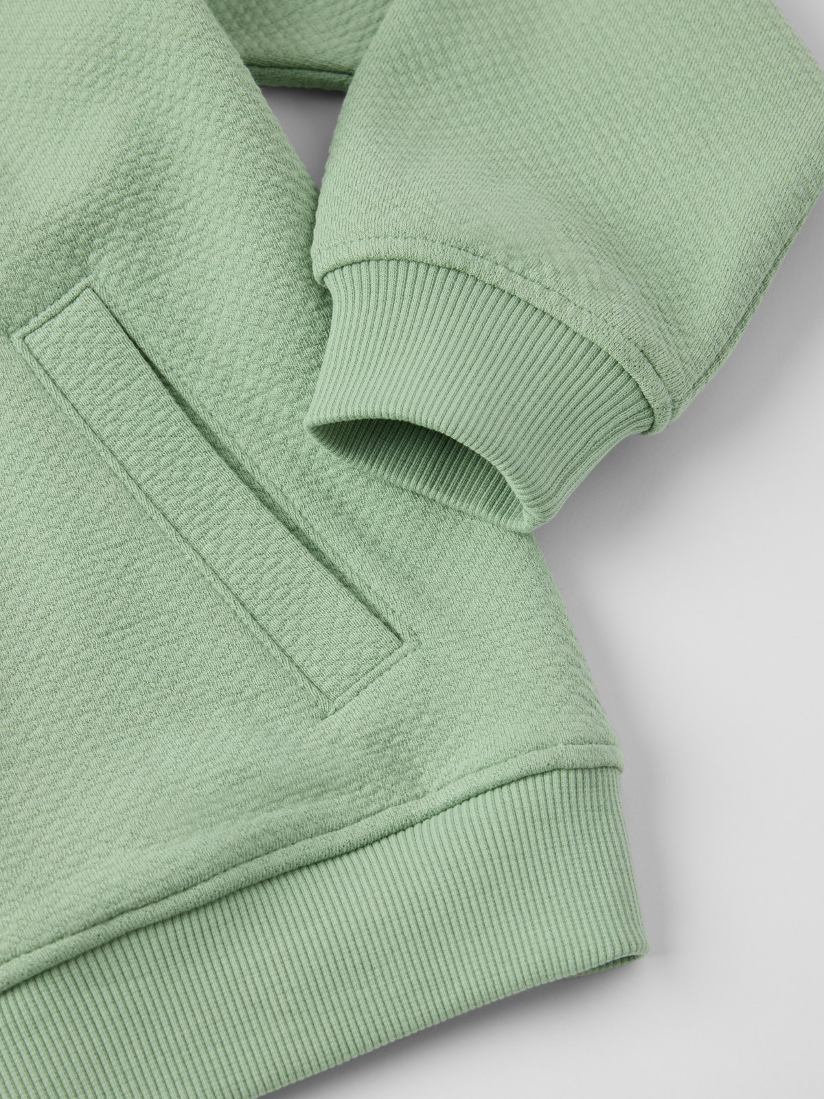 Takki pehmeästä vohvelikankaasta, valmistettu 100 % luomupuuvillasta. Takissa on pitkä vetoketju, resorikaulus ja resorit hihansuissa sekä helmassa mukavan istuvuuden takaamiseksi. Edessä on kaksi taskua. Rintamuksessa on pieni kirjailtu logo.