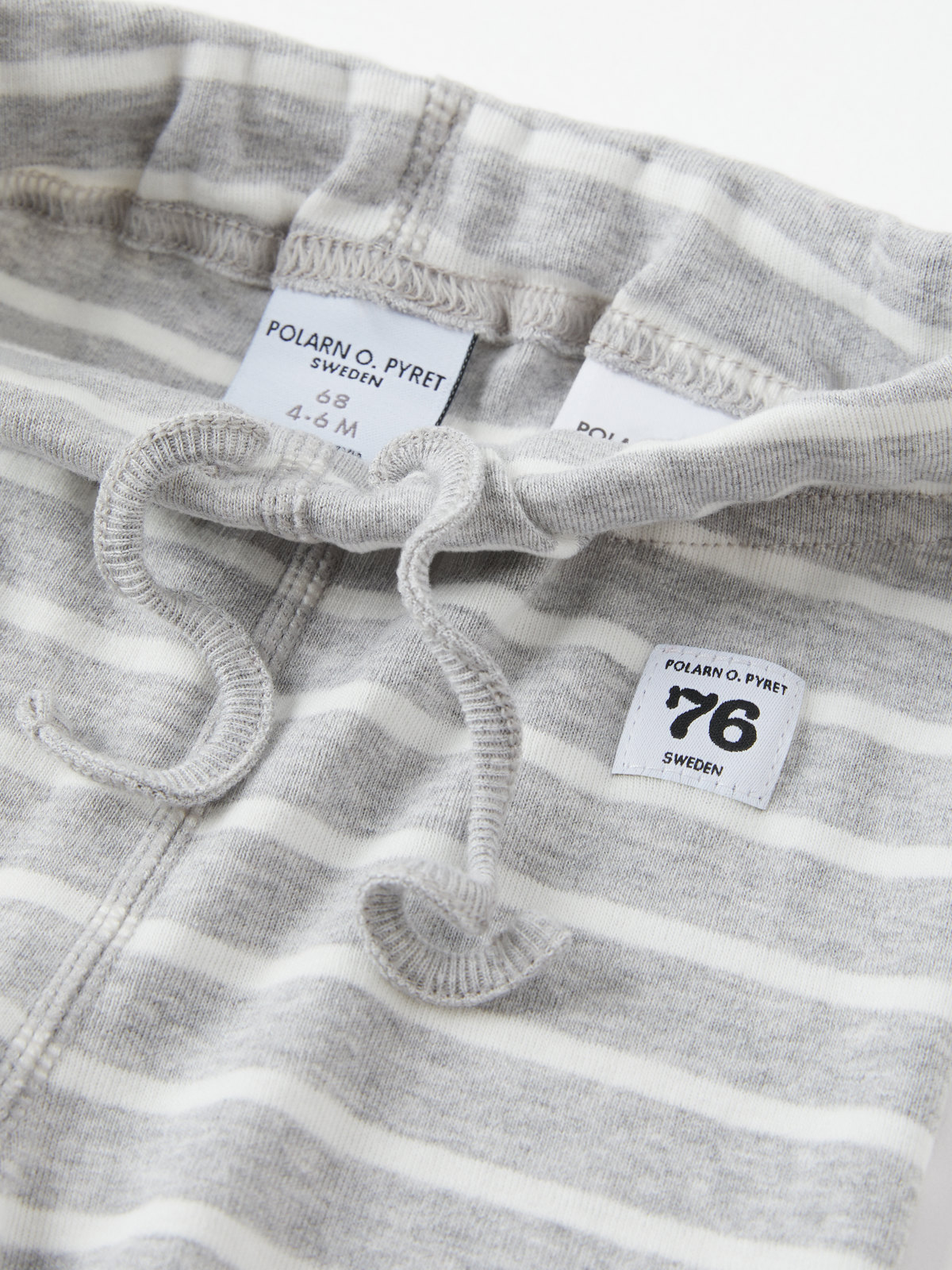 Vauvan raidalliset housut 100 % luomupuuvillaa. Housuissa on klassinen raitakuosimme sekä joustava vyötärö, jota voi säätää kiristysnauhalla. Pehmeät resorit lahkeensuissa.