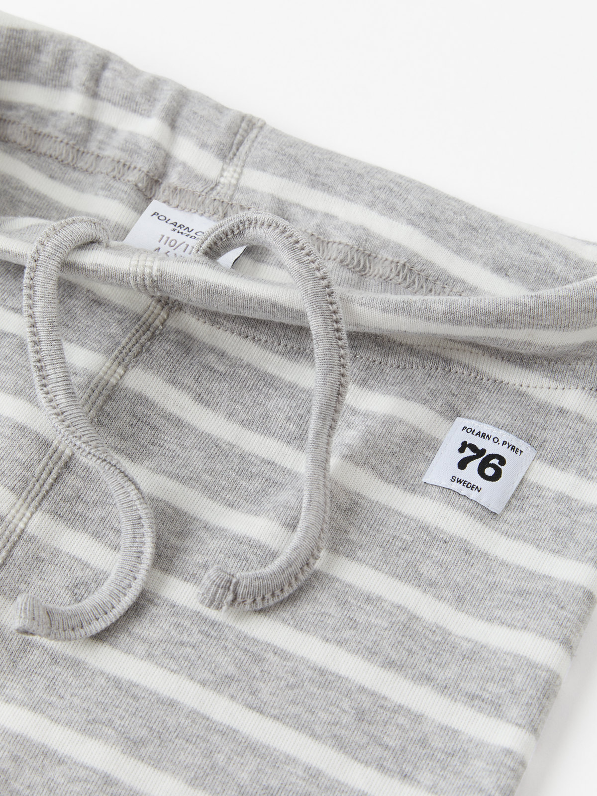 Vauvan raidalliset housut. Housuissa on klassinen raitakuosimme sekä joustava vyötärö, jota voi säätää kiristysnauhalla. Pehmeät resorit lahkeensuissa.