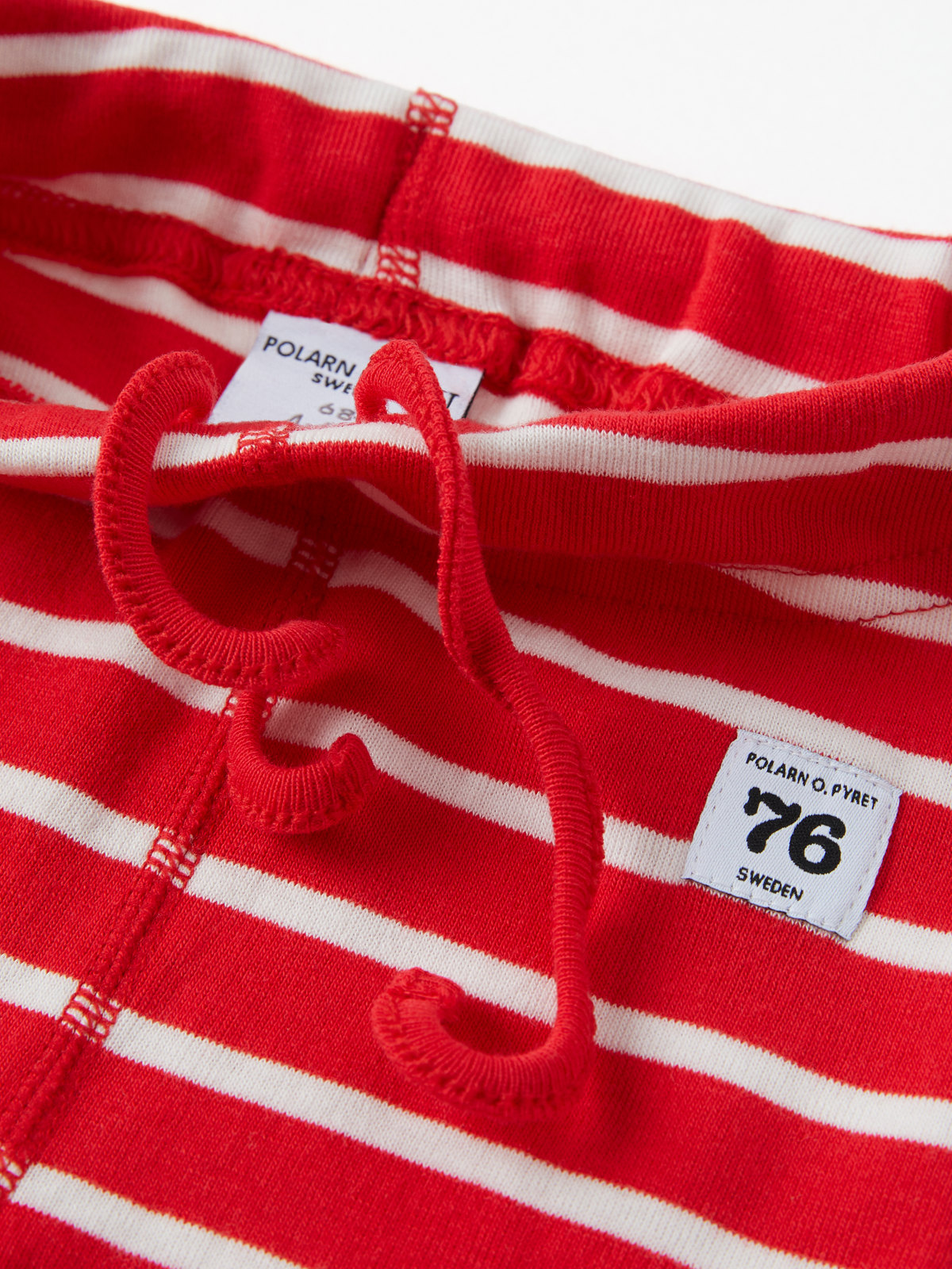 Vauvan raidalliset housut 100 % luomupuuvillaa. Housuissa on klassinen raitakuosimme sekä joustava vyötärö, jota voi säätää kiristysnauhalla. Pehmeät resorit lahkeensuissa.