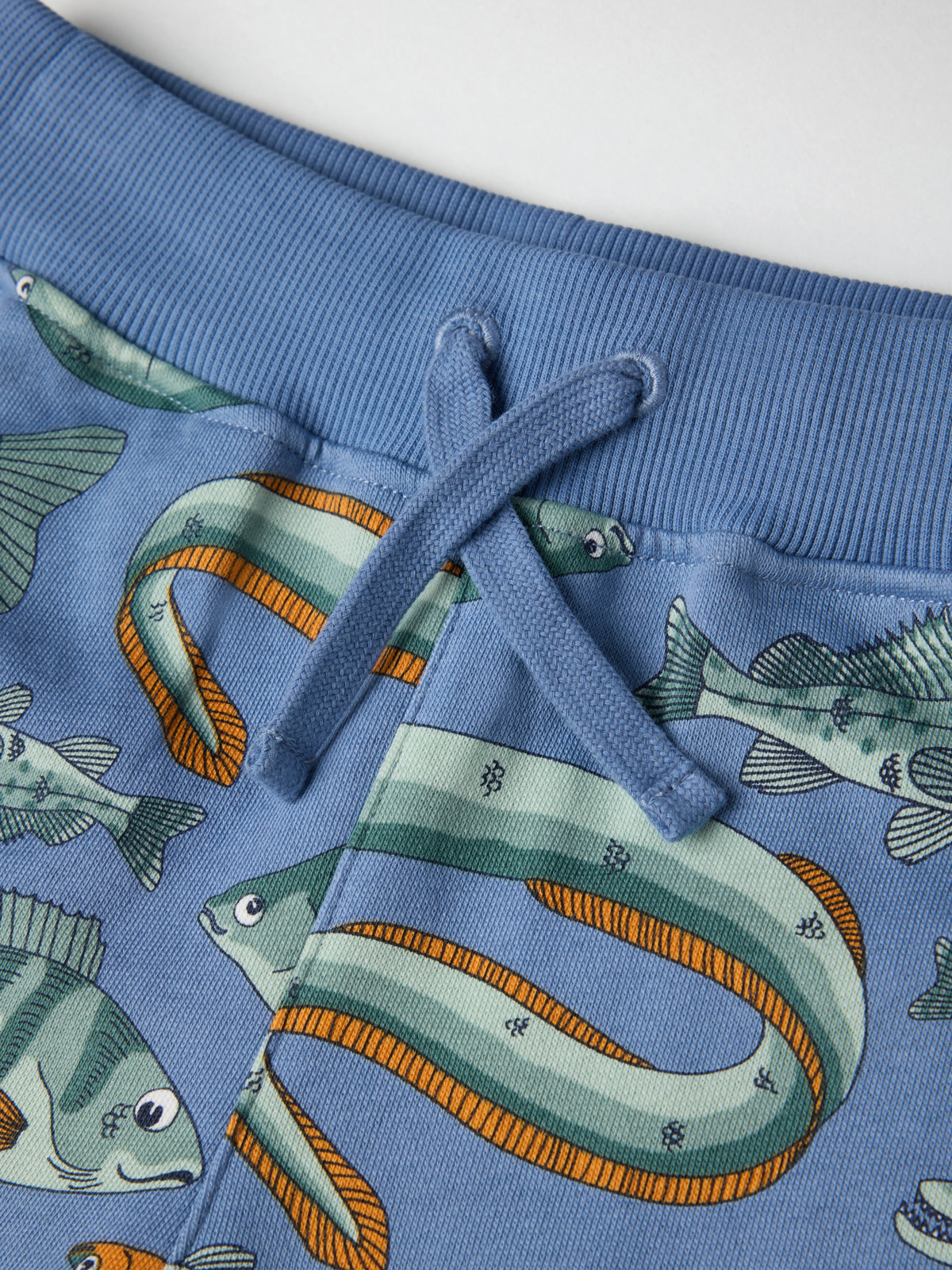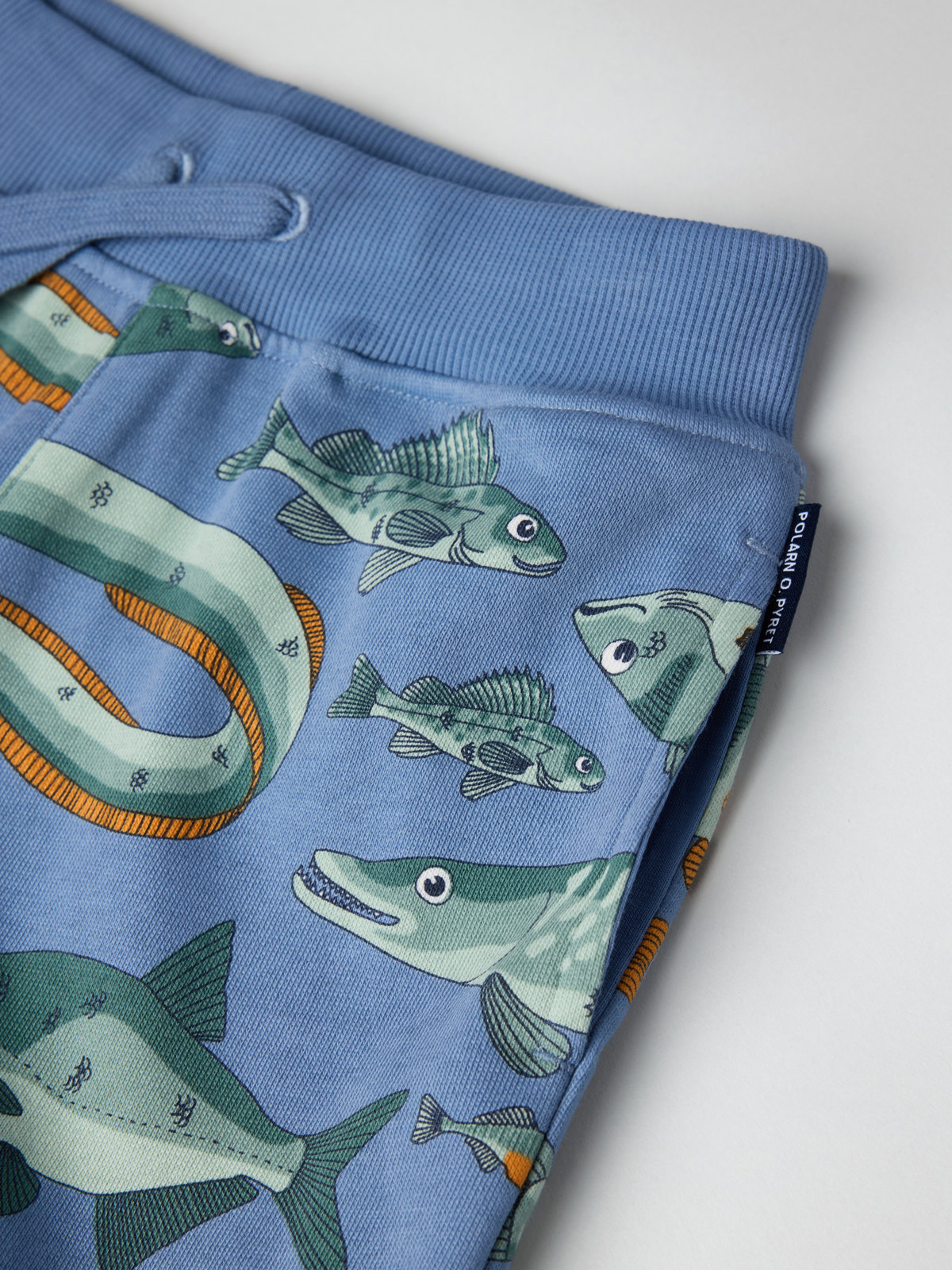 Shortsit pehmeää collegemateriaalia. 100 % luomupuuvillaa – täydellinen arkivaate kesäksi! Kuvioitu kokonaan kalakuviolla. Shortsit ulottuvat polveen. Joustavaa vyötäröä voi säätää kiristysnauhalla.