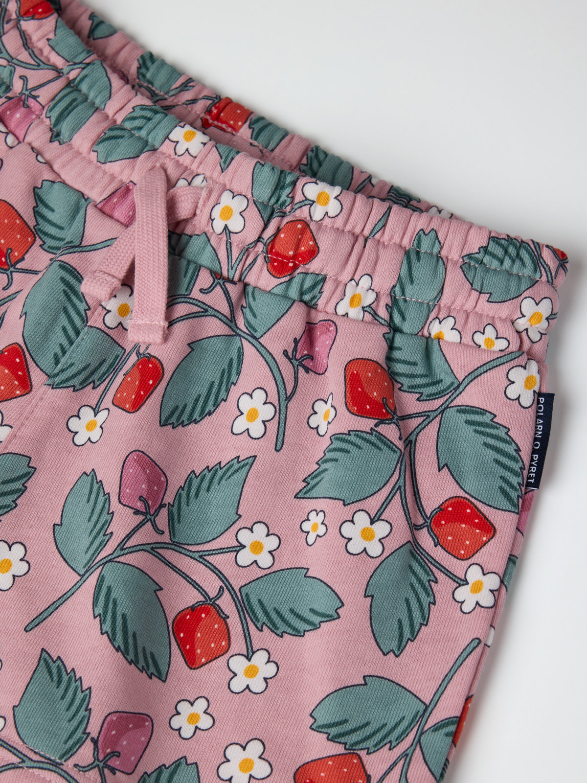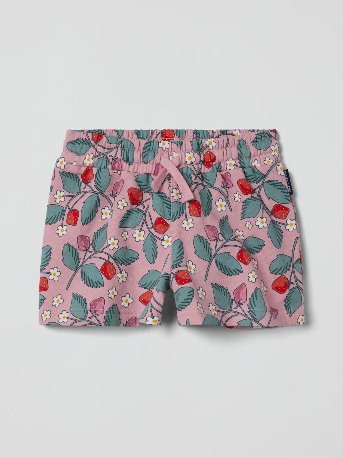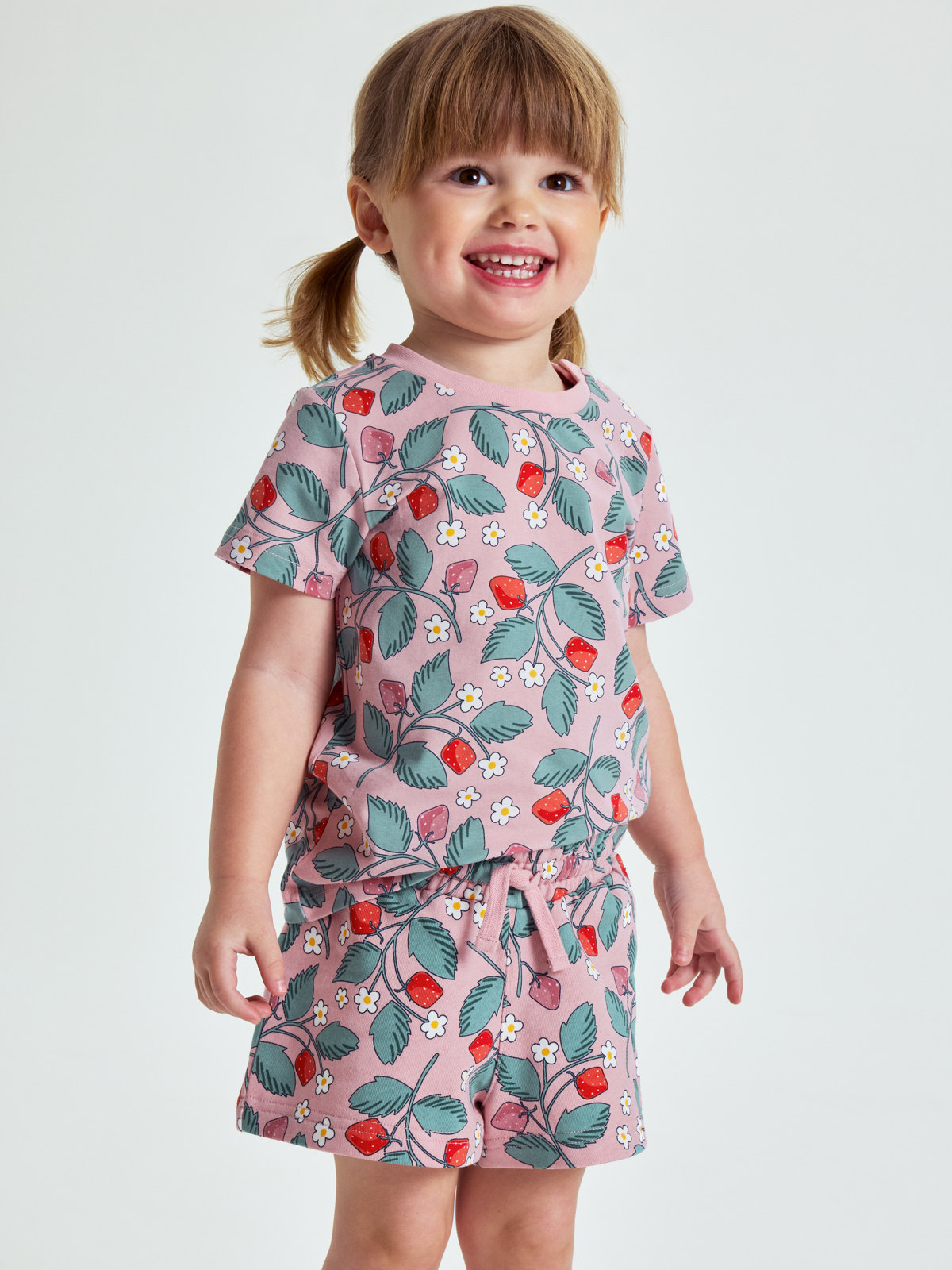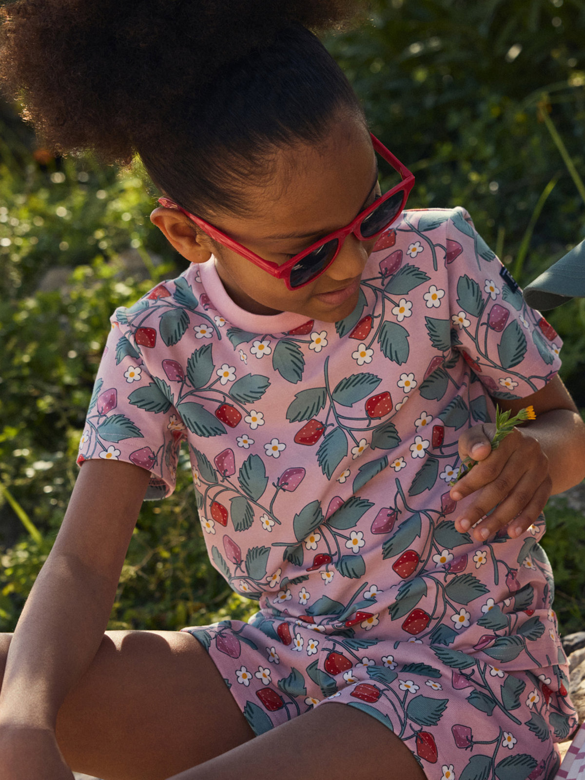 Shortsit pehmeää collegemateriaalia. 100 % luomupuuvillaa – täydellinen arkivaate kesäksi! Shortsit on kuvioitu kokonaan mansikkakuviolla. Joustava vyötärö, jota voi säätää kiristysnauhalla.