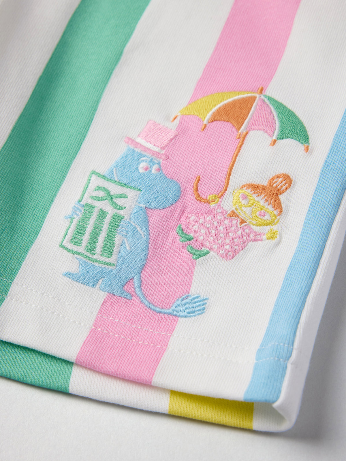 Shortsit on kuvioitu Tove Janssonin muumitarinoiden hahmoilla. Shortsit ulottuvat polveen. Joustava vyötärö, jota voi säätää kiristysnauhalla.