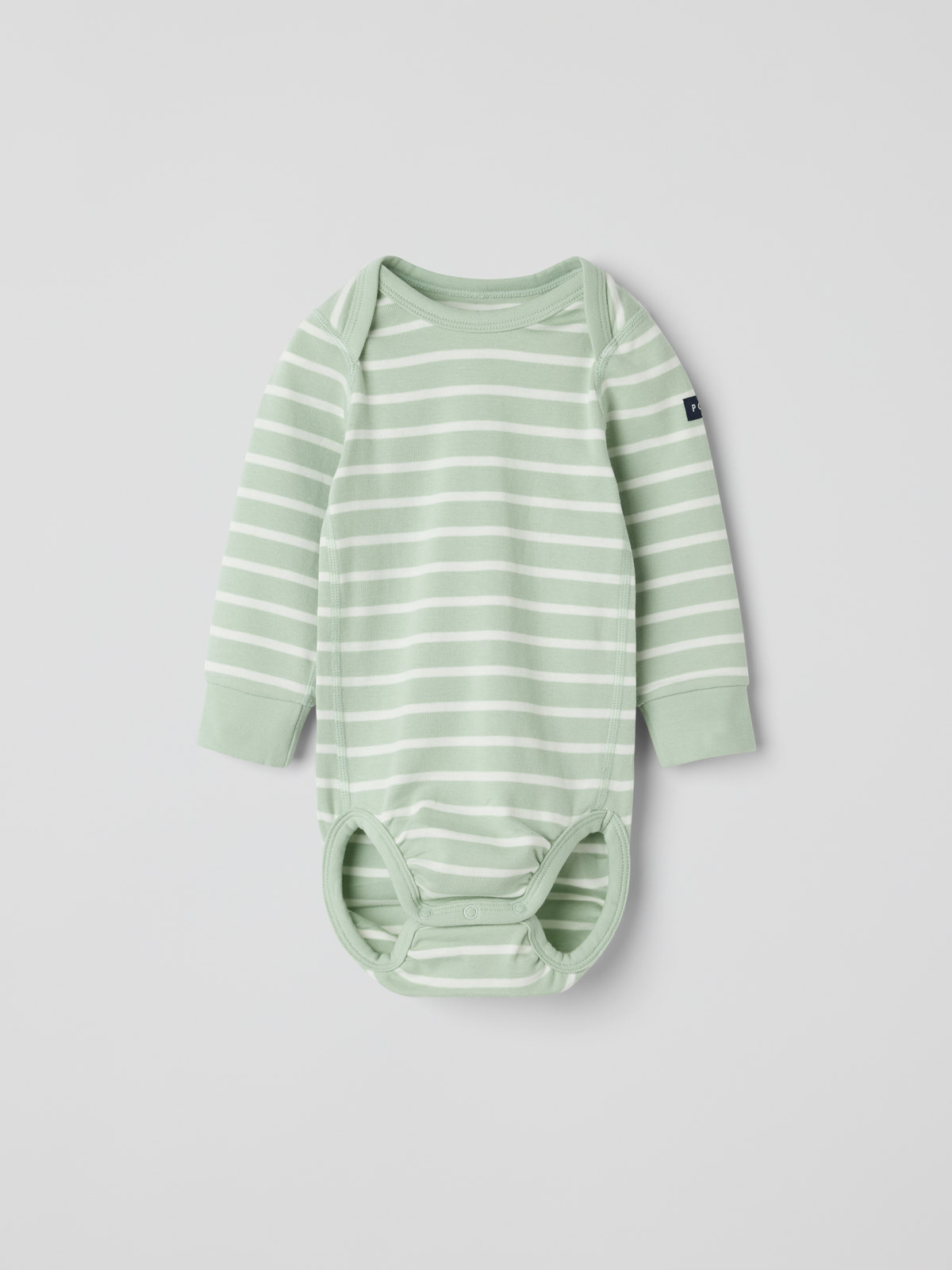 Meidän klassinen raidallinen body, 100 % pehmeää luomupuuvillaa – rakastettu perusvaate, joka kuuluu jokaisen vauvan vaatekaappiin! Bodyssa on kirjekuoripääntie, mikä tekee sen pukemisesta helppoa pienen pään yli. Hihansuissa on myös pehmeät resorit.