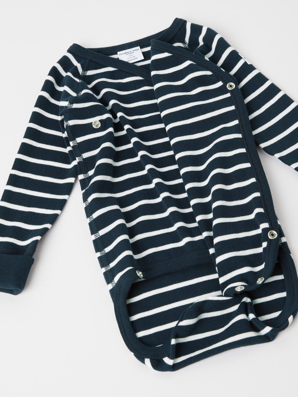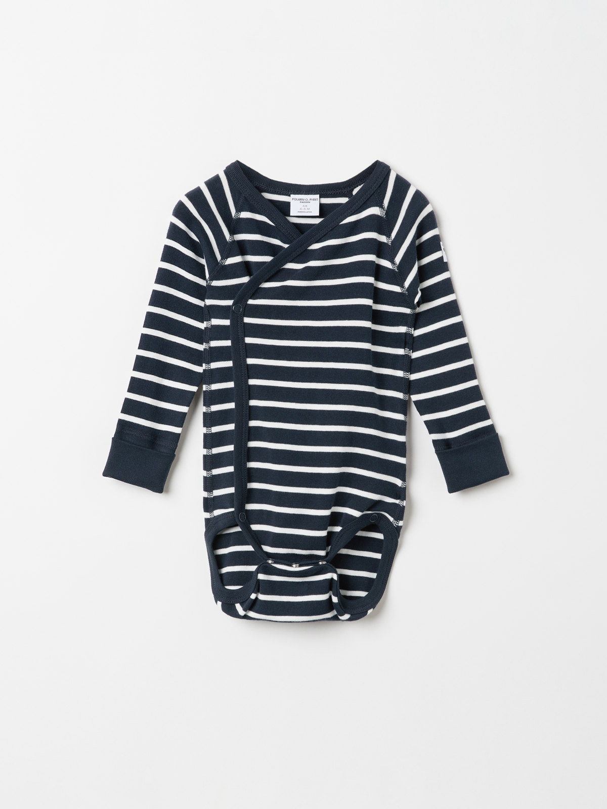 Raidallinen kietaisubody vauvalle, 100 % luomupuuvillaa. Bodyssa on erityisen pehmeät saumat, jotka eivät ärsytä herkkää ihoa. Nepparit kietaisukiinnityksessä helpottavat pukemista ja riisumista.