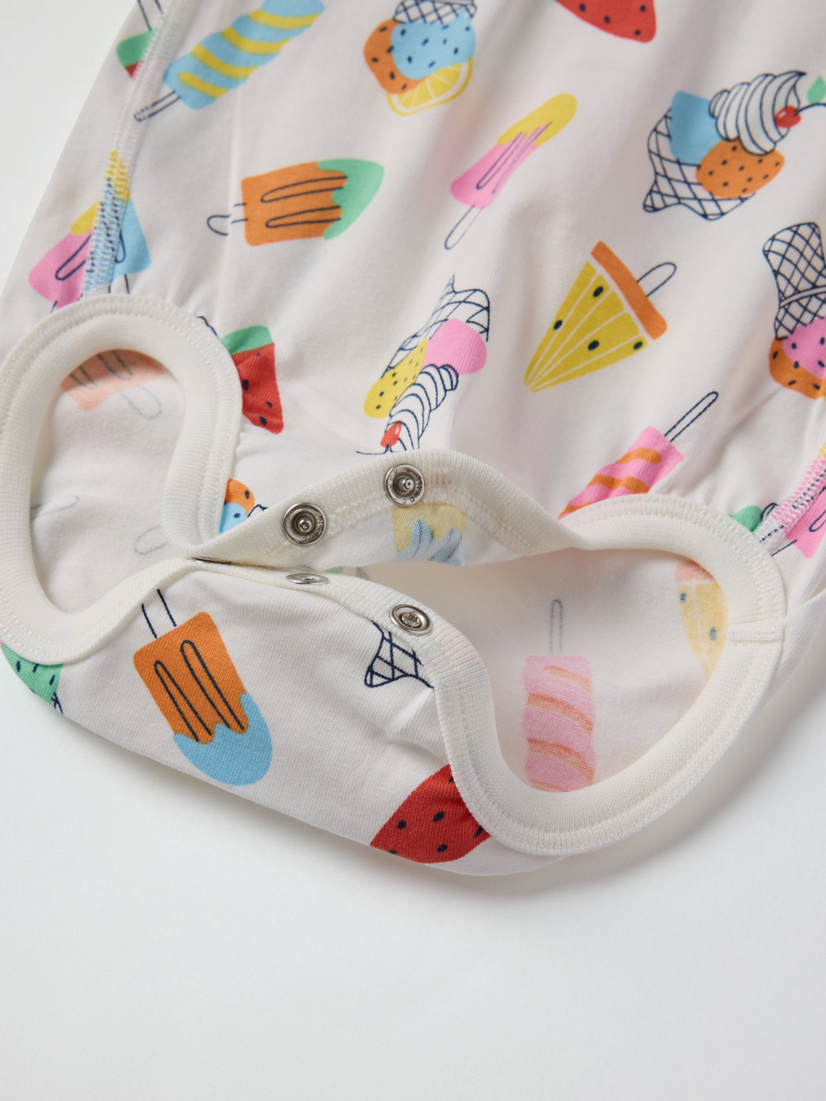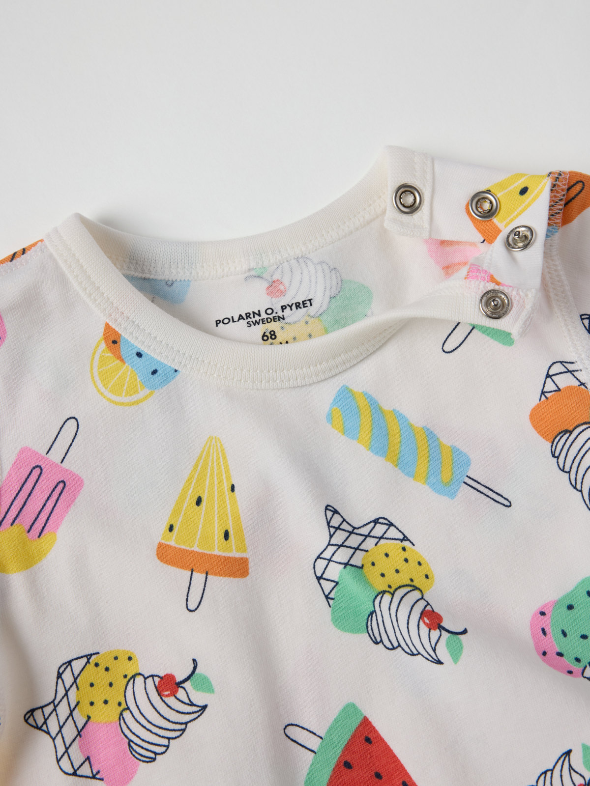 Lyhythihainen body pehmeää luomupuuvillaa. Erittäin pehmeät saumat, jotka ovat hellävaraiset herkälle iholle. Body on kuvioitu kokonaan jäätelökuviolla – todella herkullinen kesäsuosikki! Nepparit toisella olkapäällä ja haarassa helpottavat pukemista.