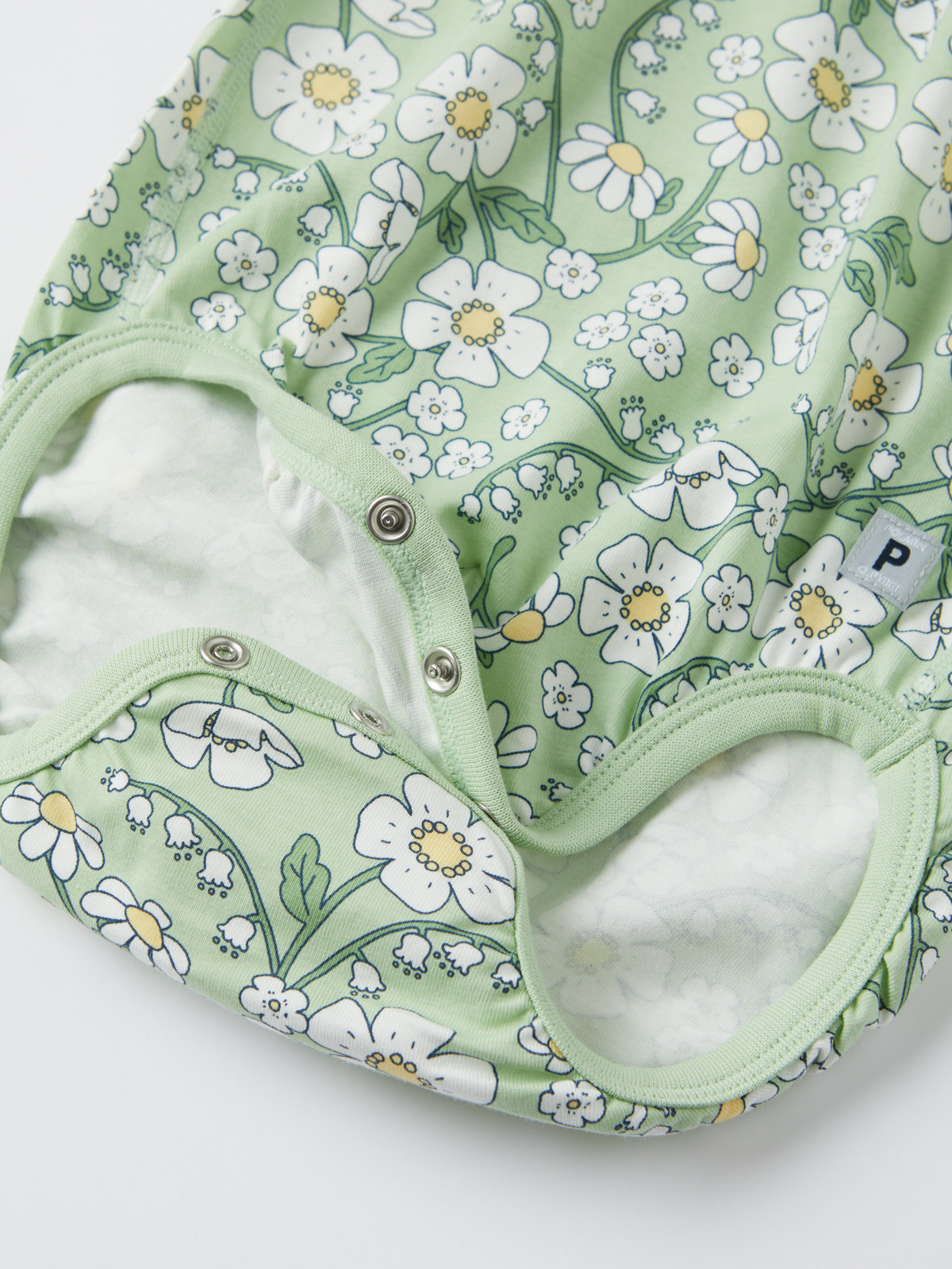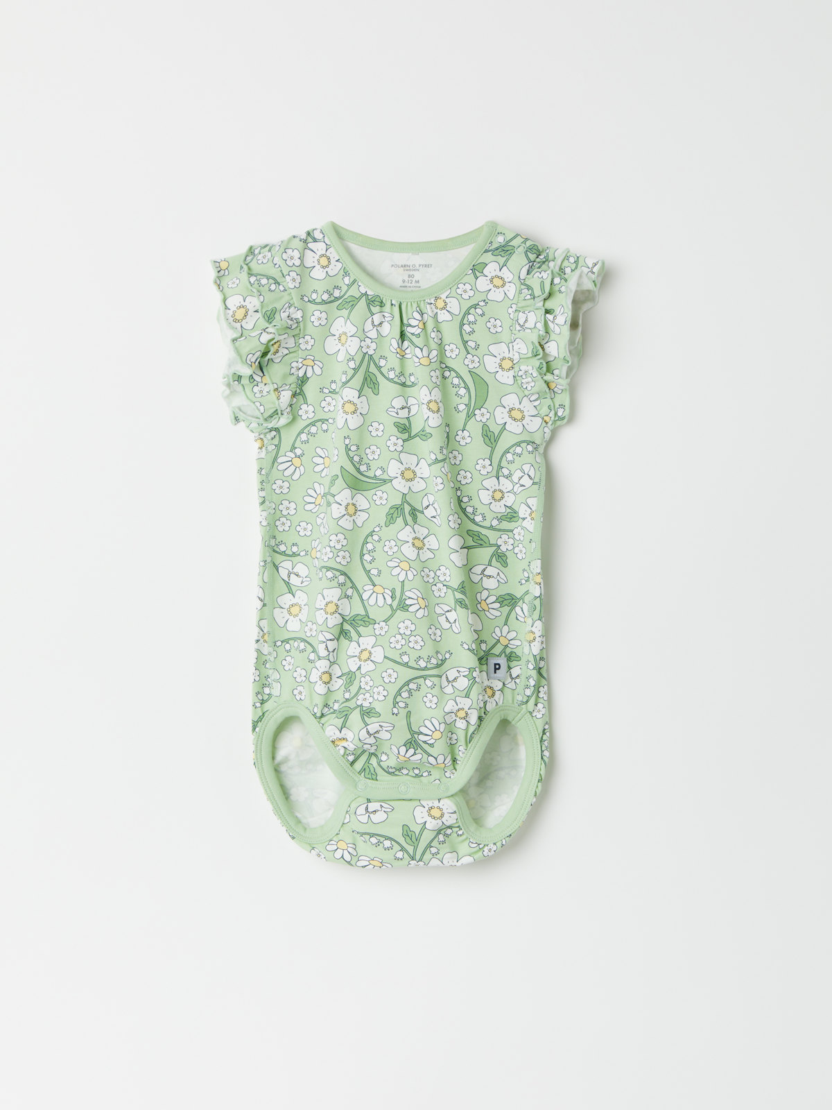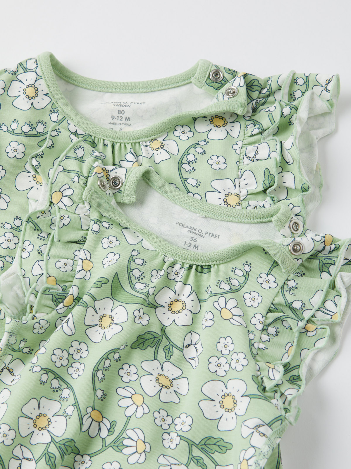 Vauvan kaunis body pehmeää luomupuuvillaa. Body on kuvioitu kokonaan kukkakuviolla. Kaksinkertaiset röyhelöhihat.