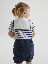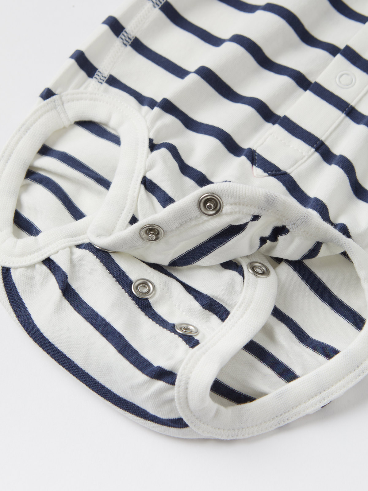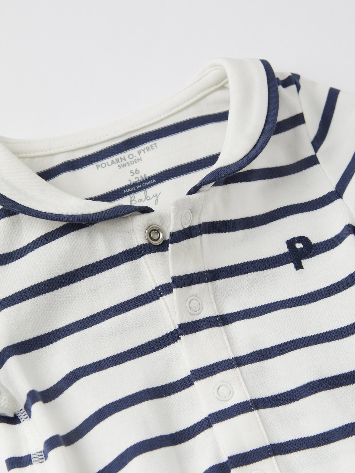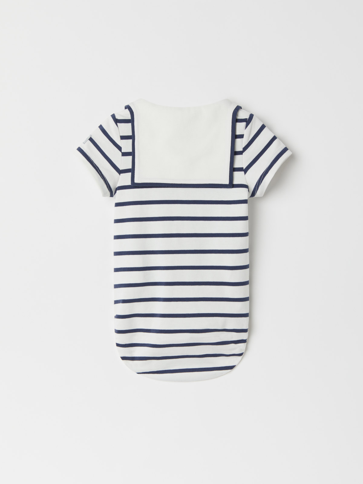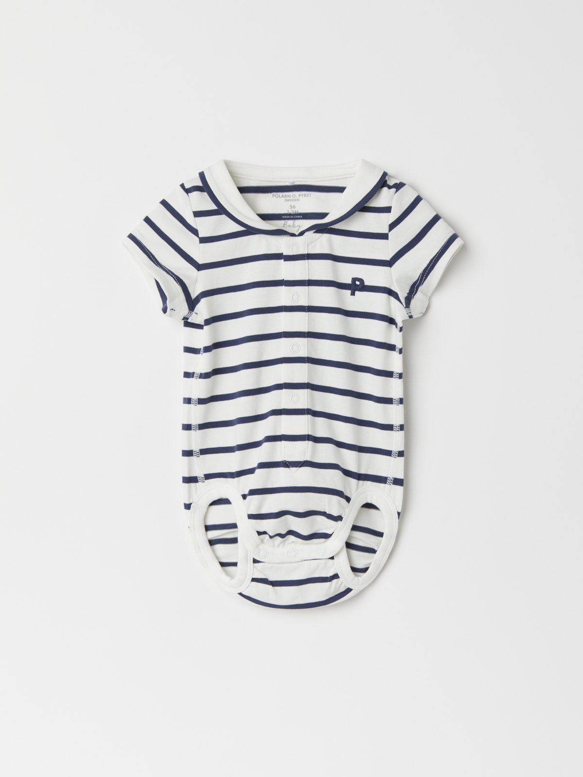Vauvan merimiesbody pehmeää luomupuuvillatrikoota – sopii hienosti kesän veneretkille tai juhliin.