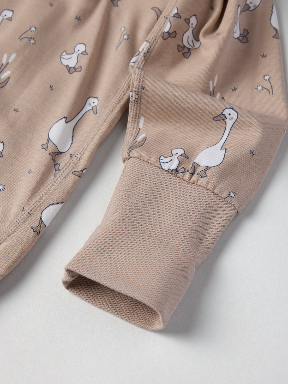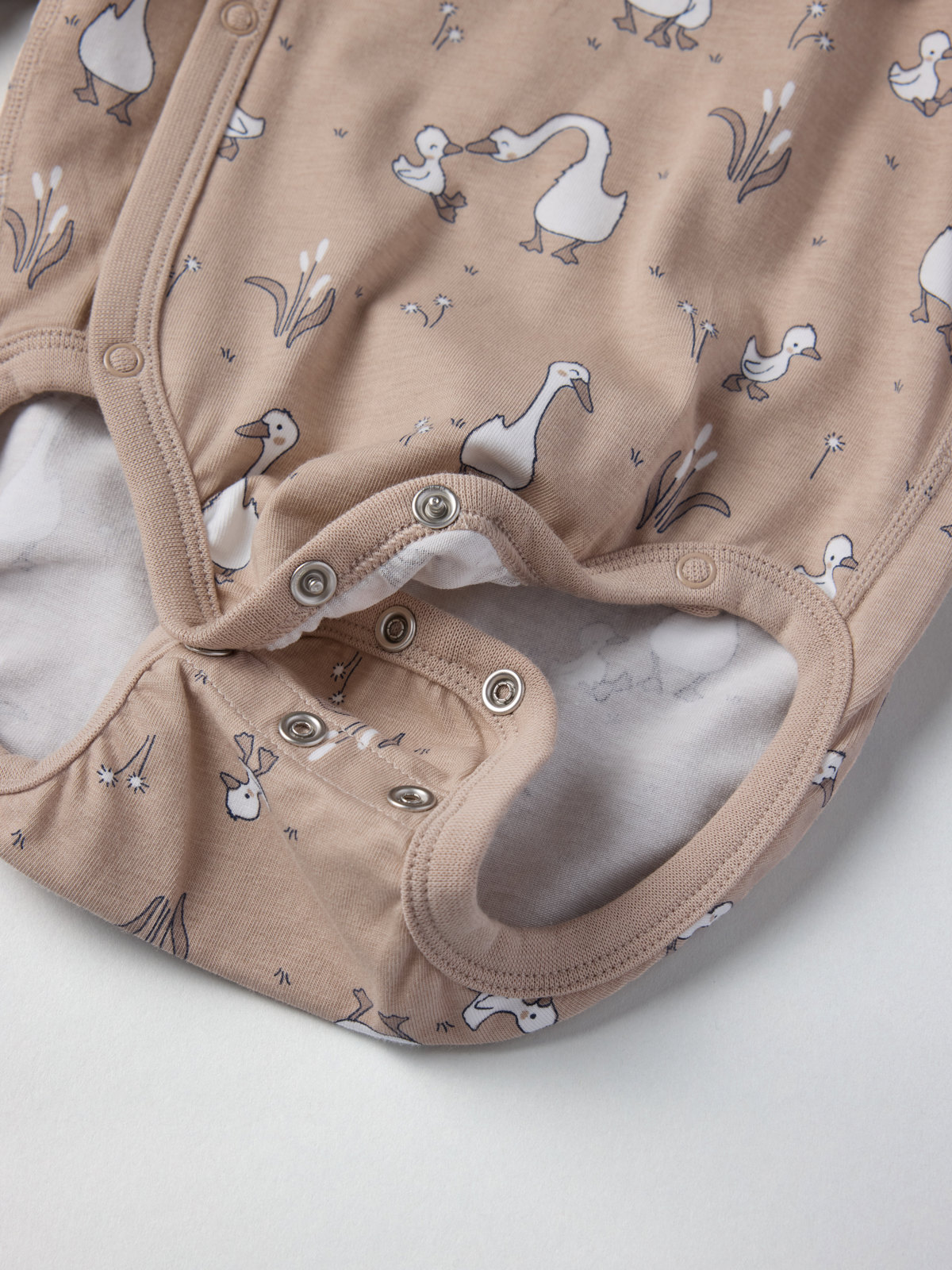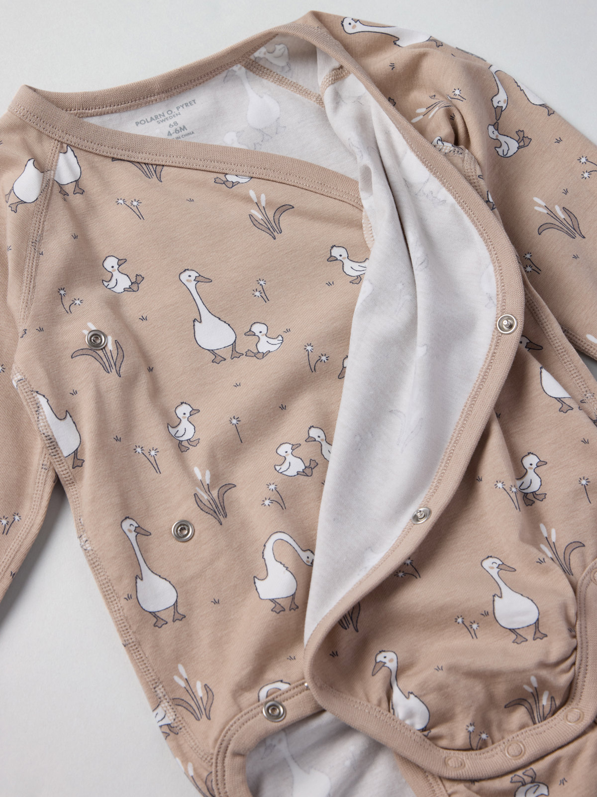 Pidennettävä kietaisubody 100 % luomupuuvillaa. Kuvioitu kokonaan hanhikuviolla. Lisärivi neppareita haarassa ja taitettavat resorit hihansuissa, joten body kasvaa lapsen mukana!