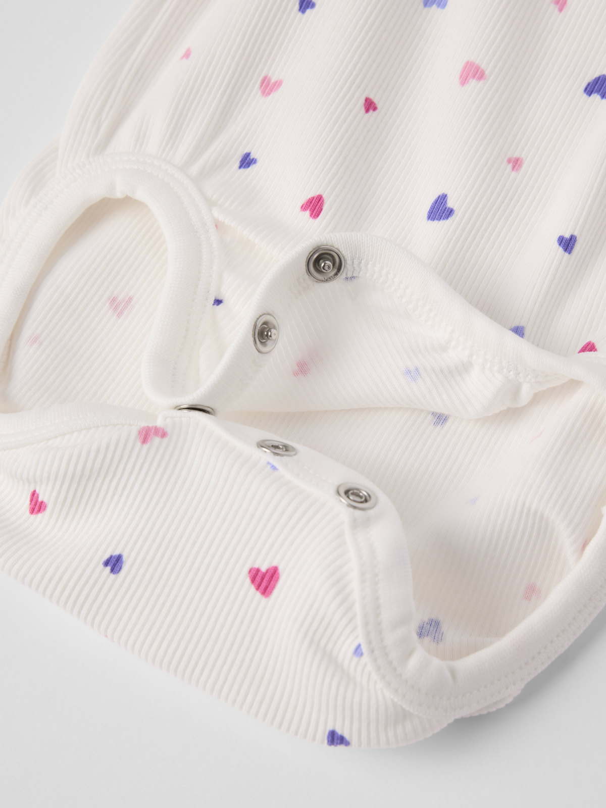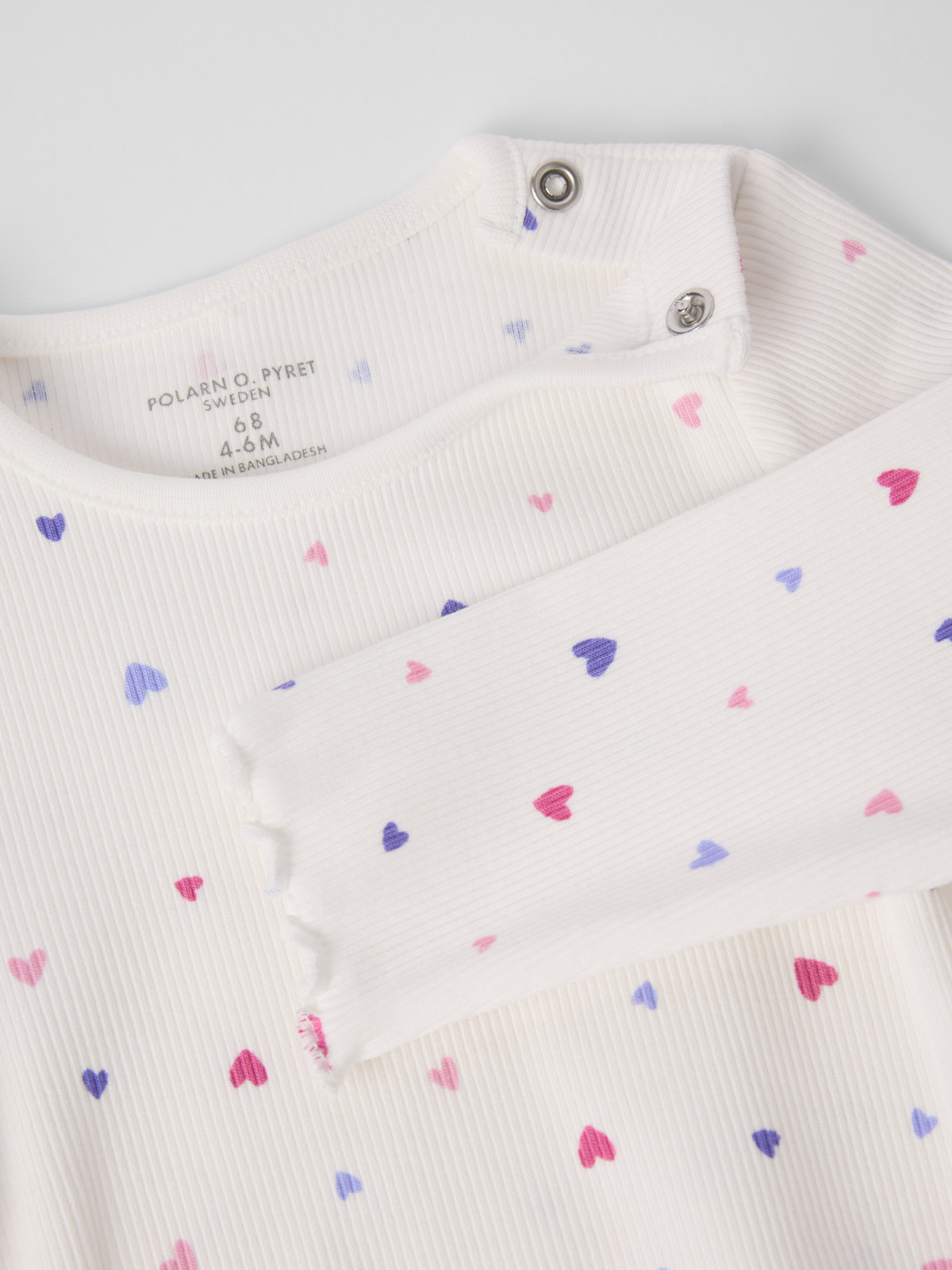 Vauvan ribbibody ohutta luomupuuvillaa. Bodyssa on erittäin pehmeät ja litteät saumat, jotka eivät hankaa herkkää ihoa vasten ja hihansuissa on suloinen viimeistely rullapäärmeellä. Nepparit toisella olkapäällä ja haarassa helpottavat pukemista.