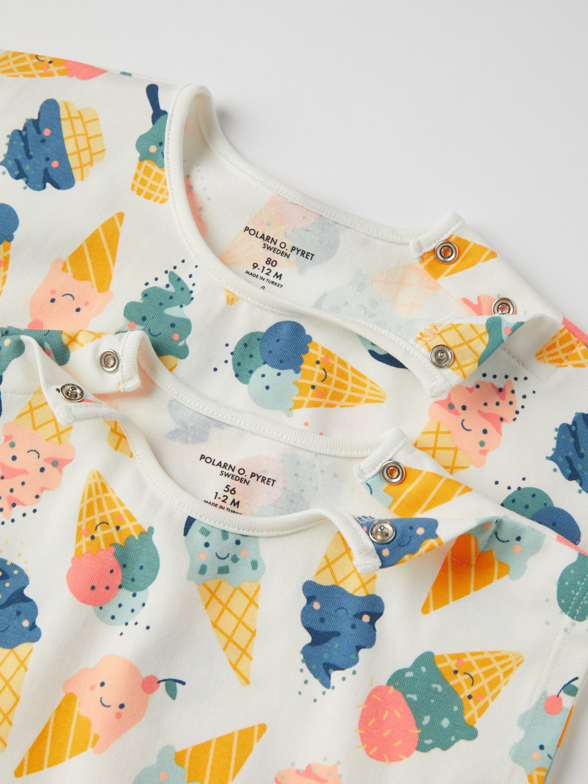 Lyhythihainen body luomupuuvillaa. Kuvioitu kokonaan jäätelökuviolla – todellinen kesäsuosikki!