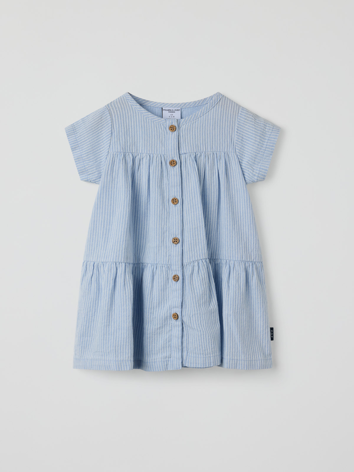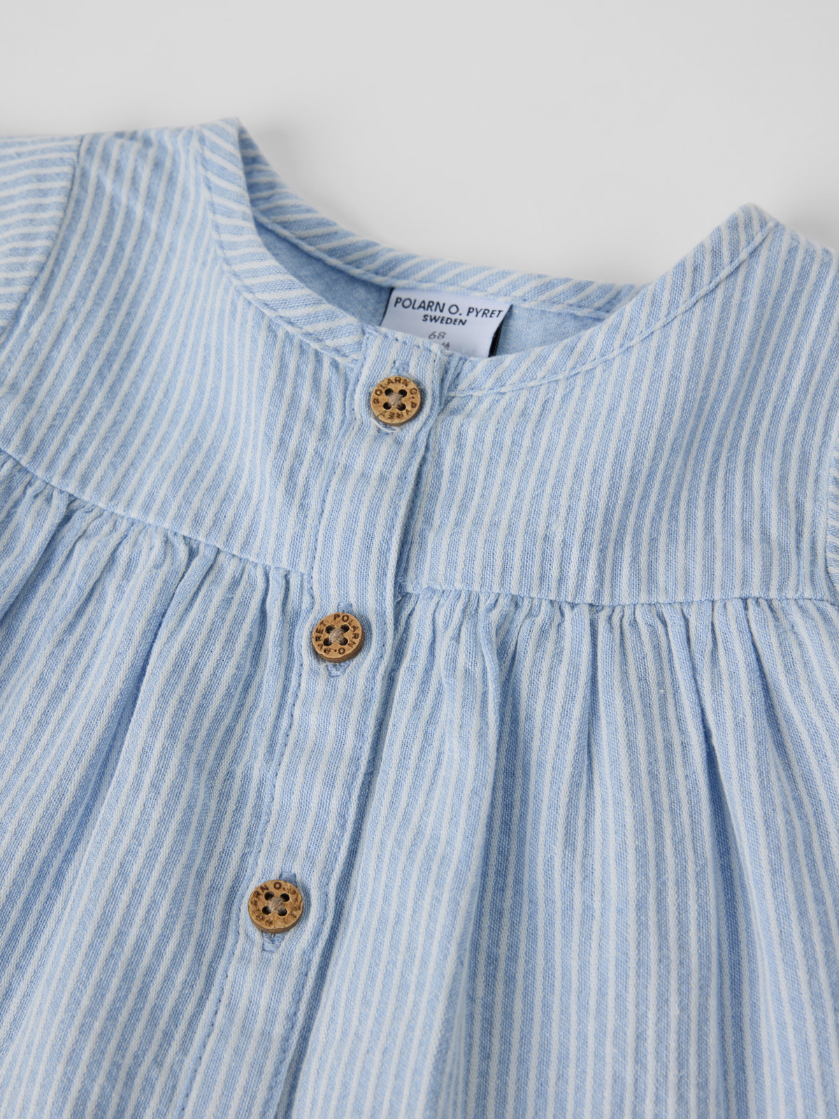 Raidallinen lyhythihainen mekko pehmeästä luomupuuvillapopliinista vauvalle – täydellinen sekä arkeen että kesäjuhliin! Mekossa on edessä näkyvät napit.