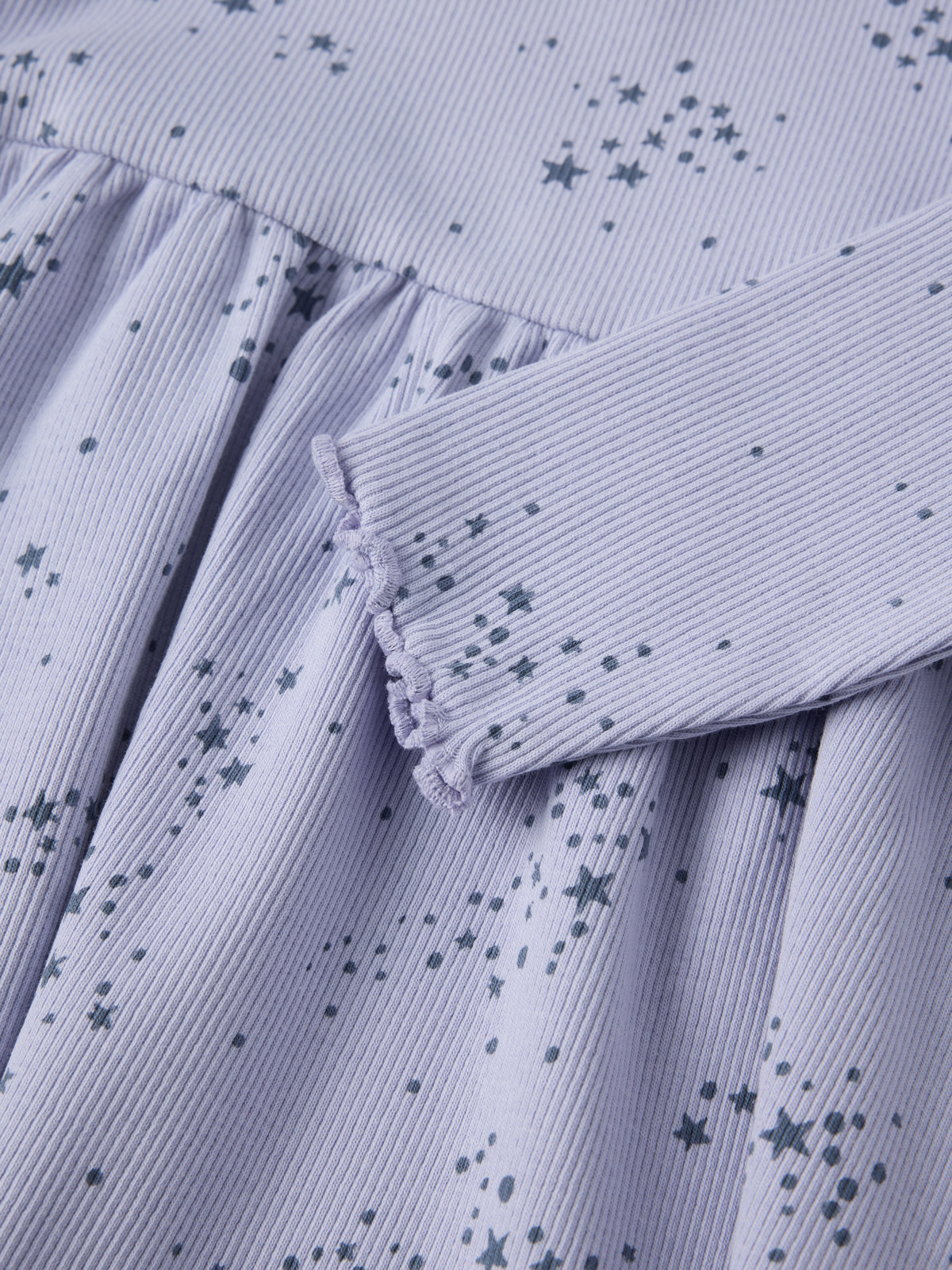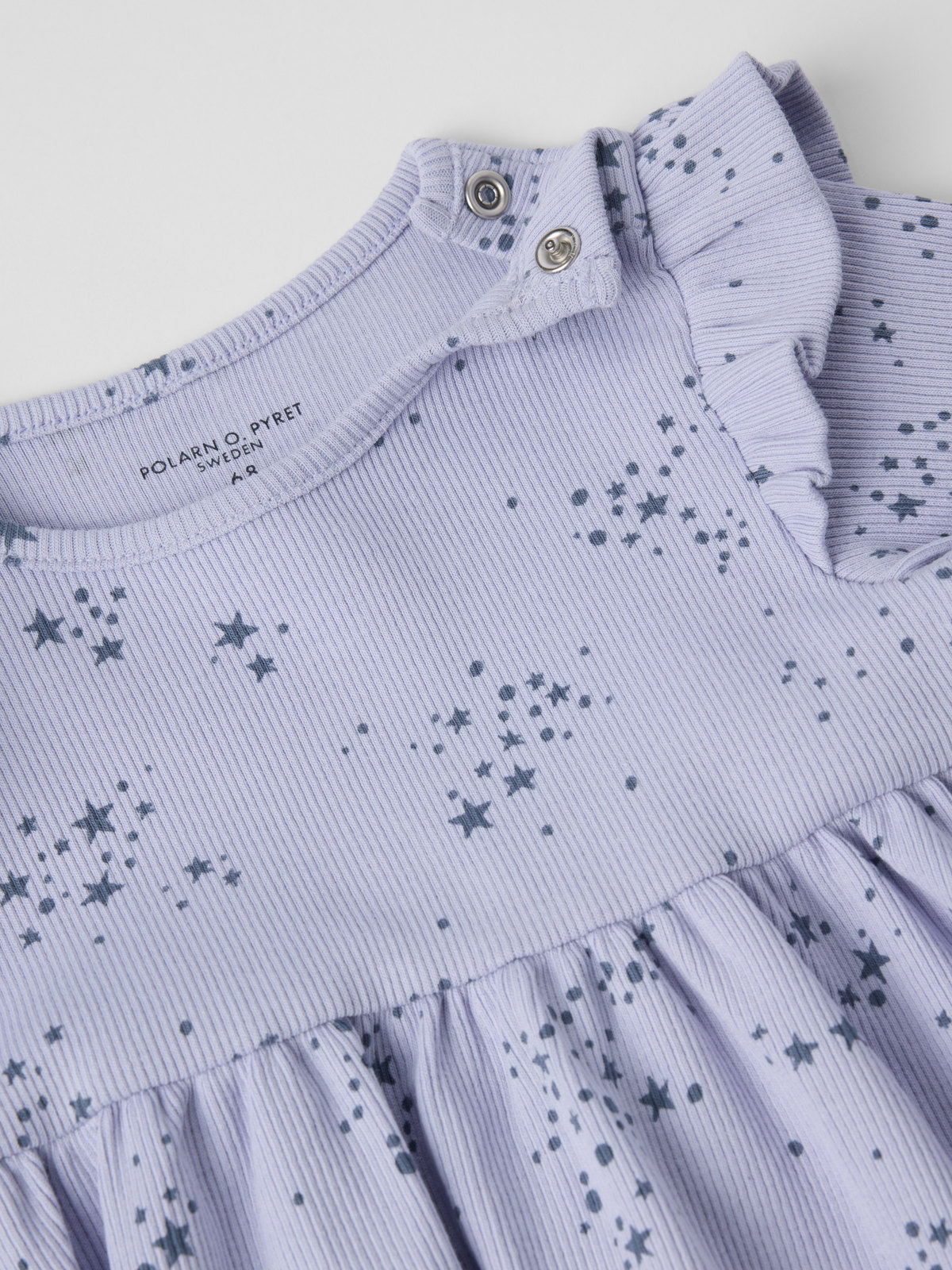 Pehmeä ribbimekko vauvalle, valmistettu luomupuuvillasta. Mekko on kuvioitu pienillä sydämillä ja olkapäillä on pienet röyhelöt.